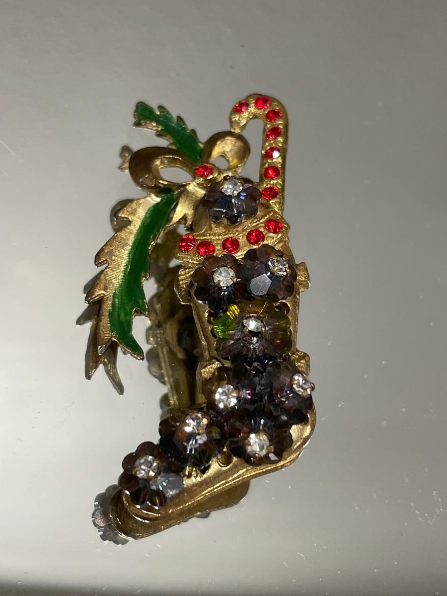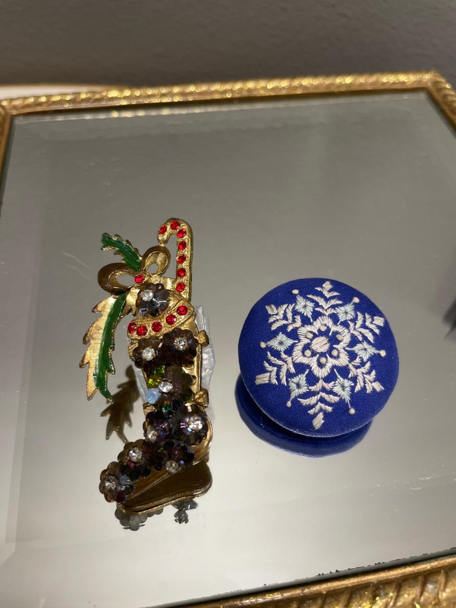 Unsigned Miriam Haskell stocking one and fabric snowflake pin
