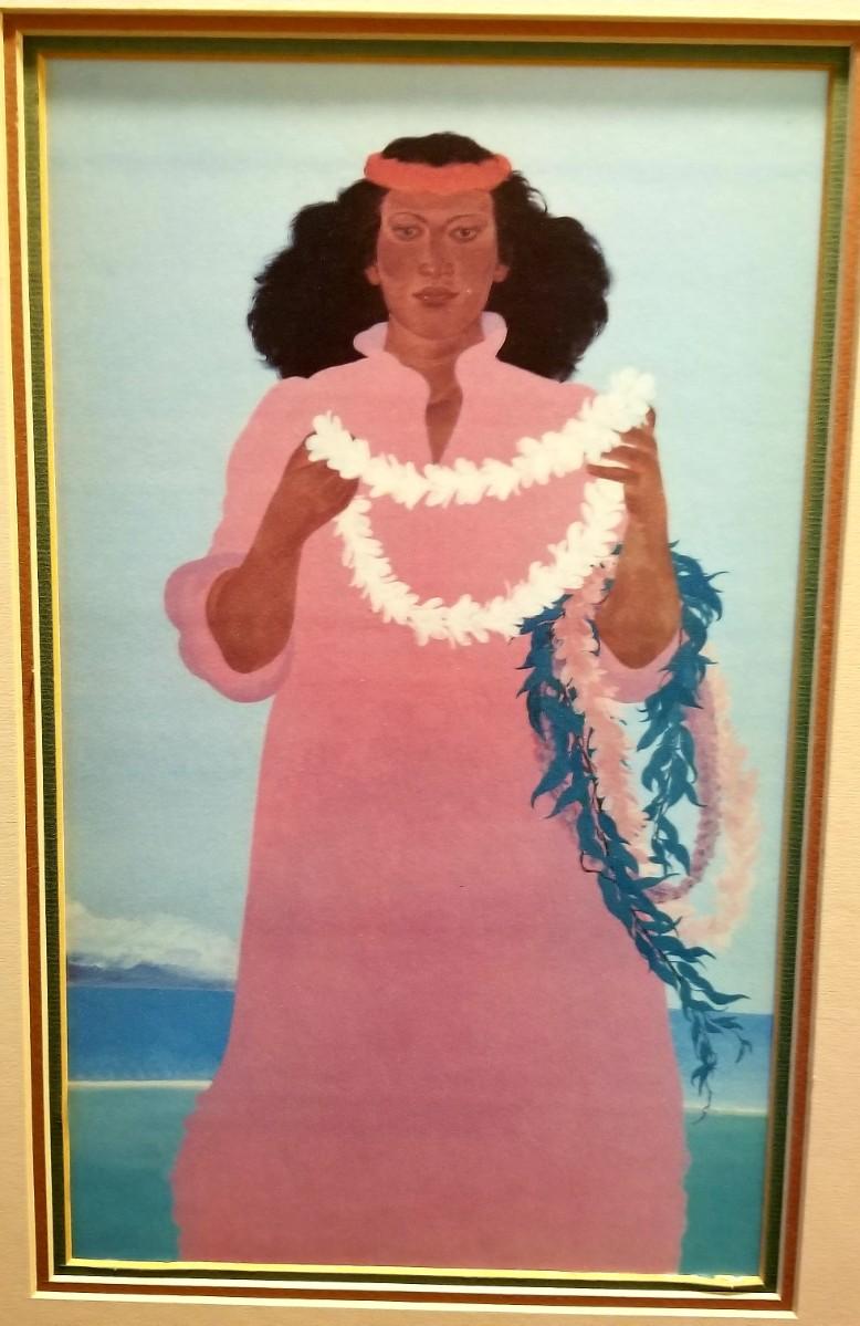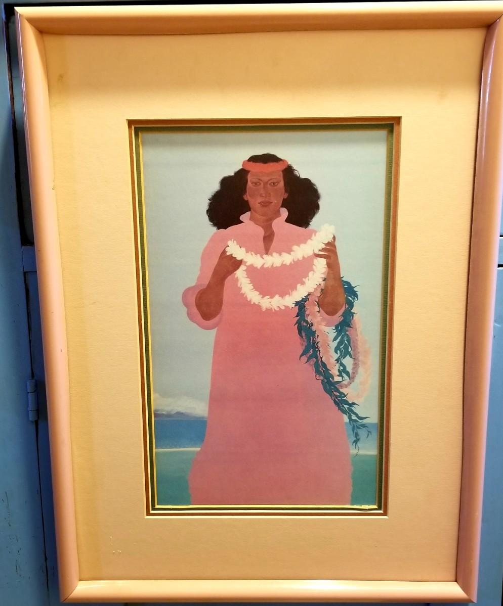 Matted and framed print of a Hawaiian woman holding a lei that appears to be