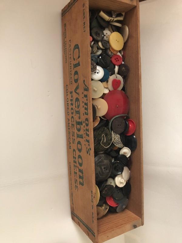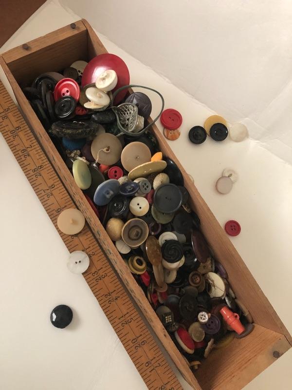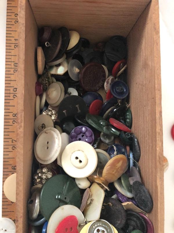 Unsorted box of buttons. Buttons look to be old with some bake a light and other interesting shapes and sizes. Selling as found at a state