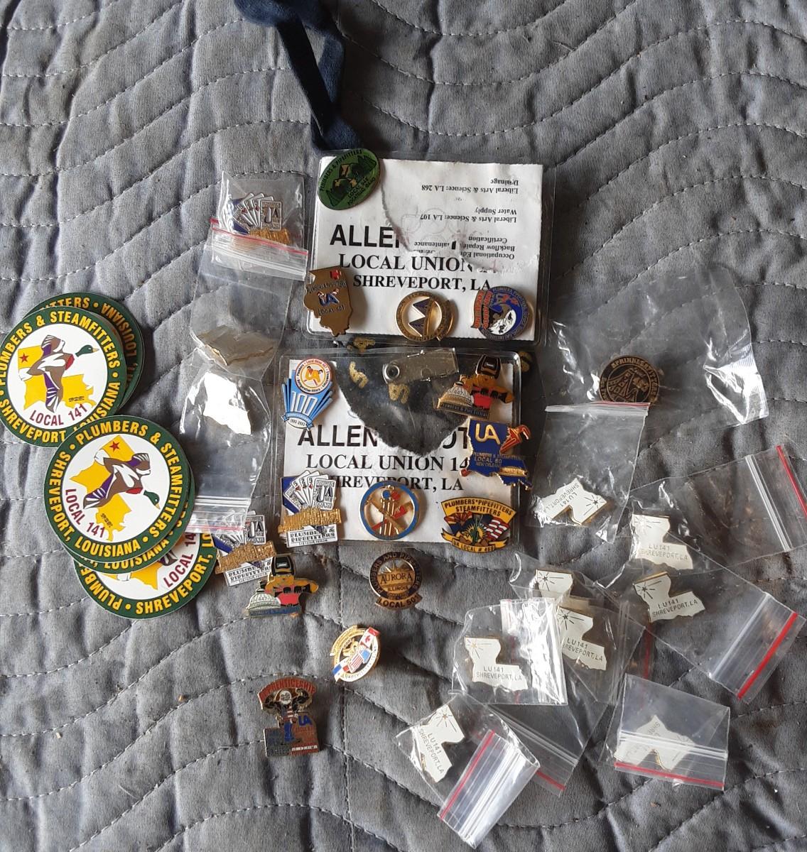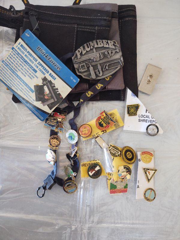 As shown - Plumbing belt buckle, Plumbers Union pins, training pins, council pins, etc. with 6 multi-purpose zippered bags