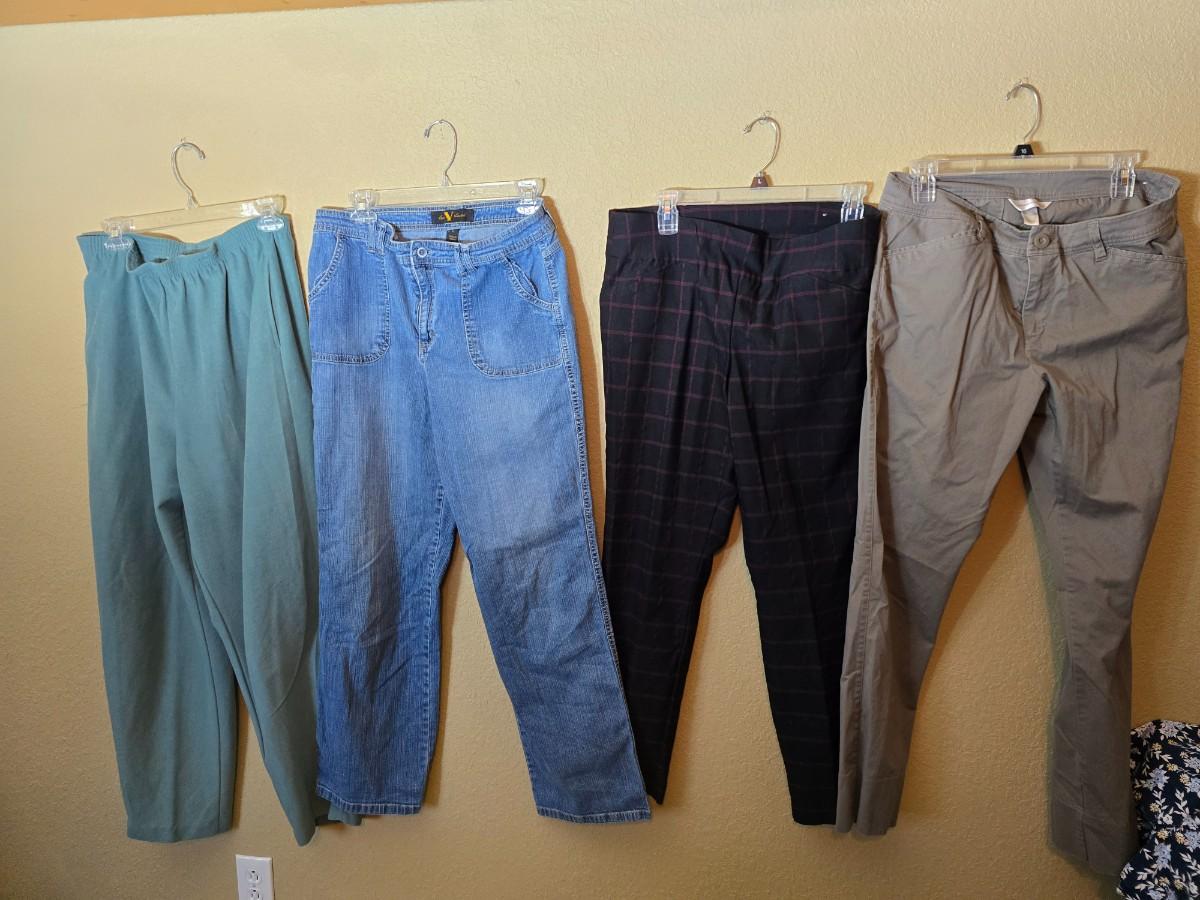 Stylish and versatile 4-piece women’s pants lot, all in size 10, featuring a variety of colors, fabrics, and fits: