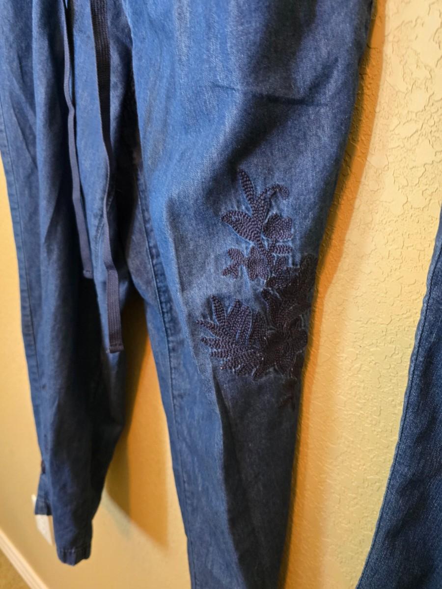 Embroidered Denim Jogger: Lightweight pull-on style with an elastic waistband and tonal floral embroidery detail near the ankle. Ideal for relaxed, casual wear.