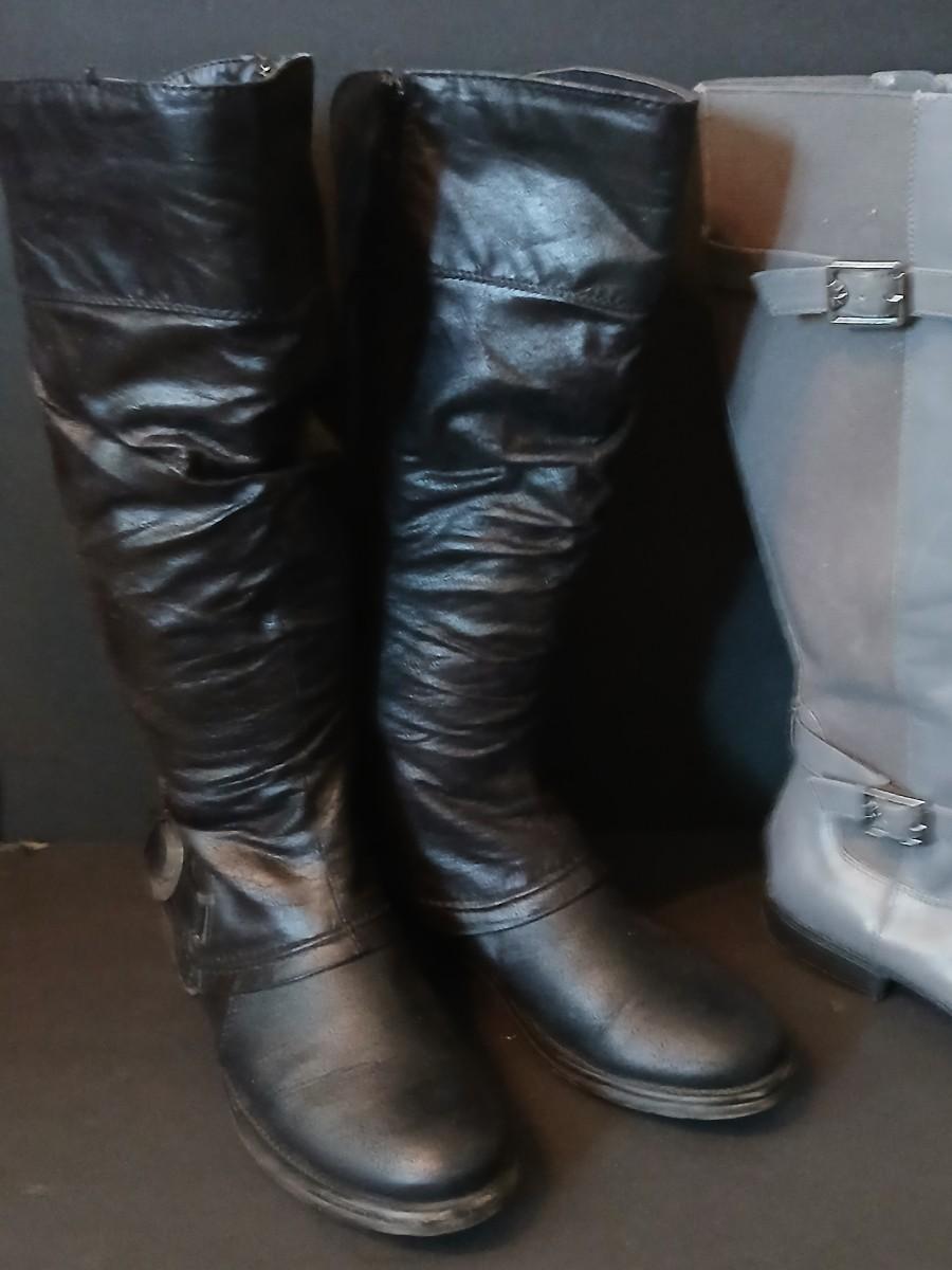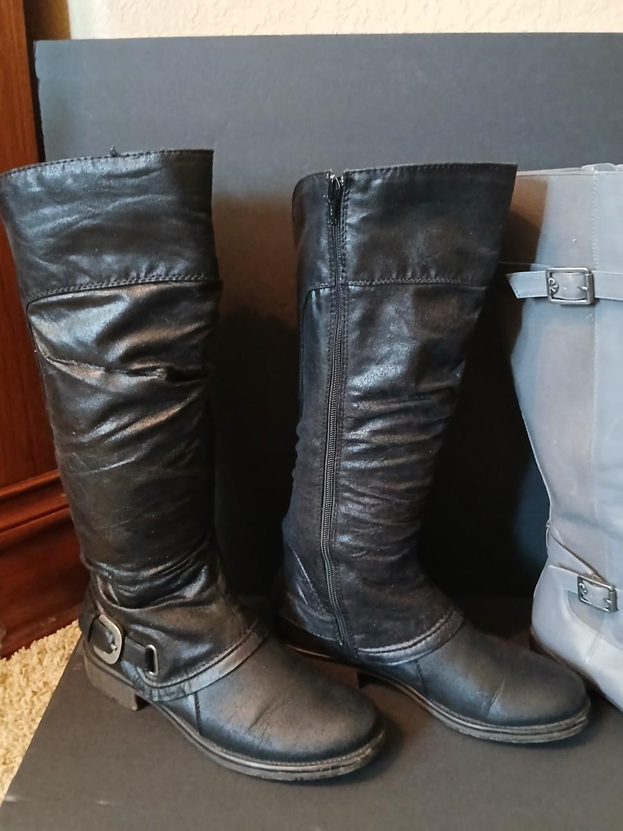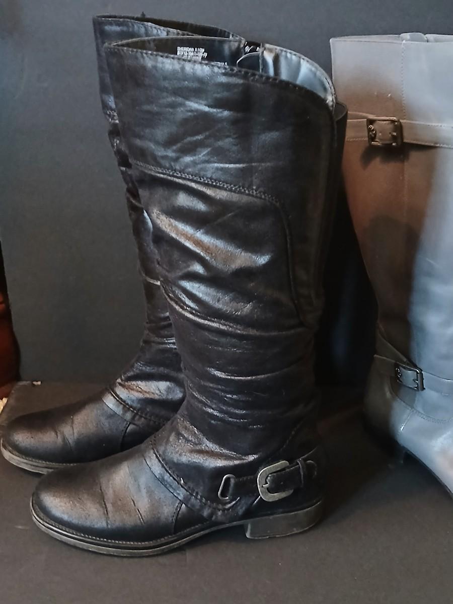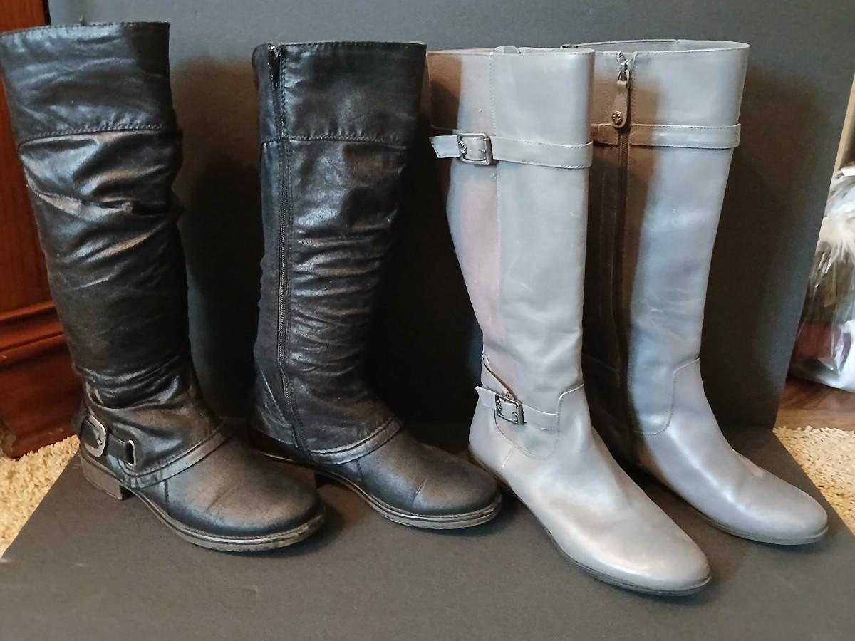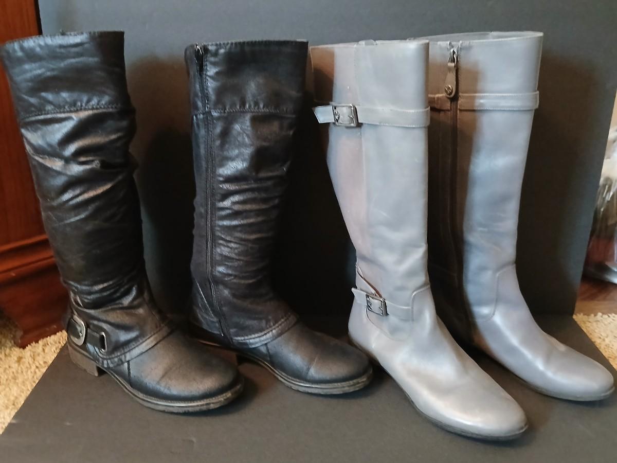 Two pairs of women's tall boots. The black boots are from Bare Traps, size 8.5M, made using balance man-made materials, with buckle accents and a low heel. The gray boots are also size 8.5 and feature buckle detailing along with a sleek design. Both pairs of boots show signs of light wear but remain in functional condition.