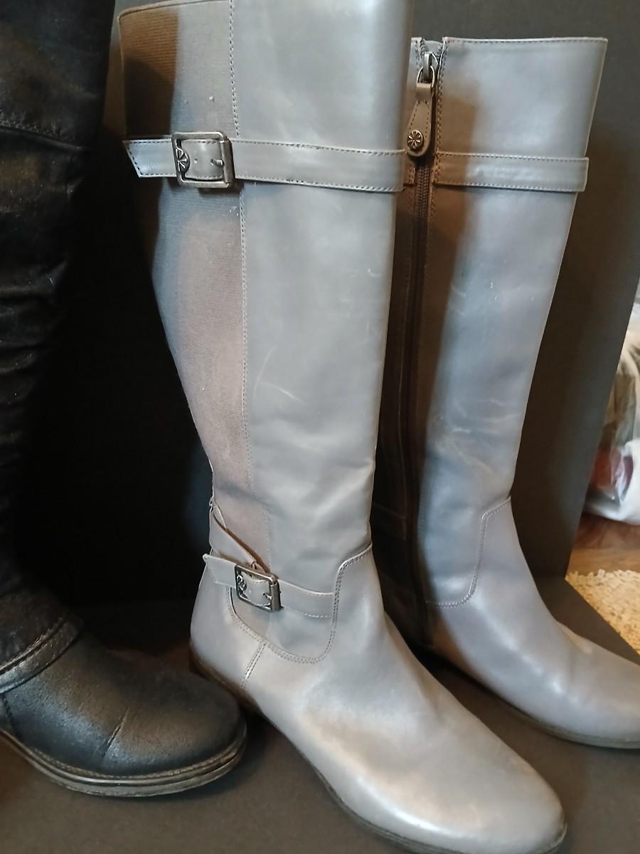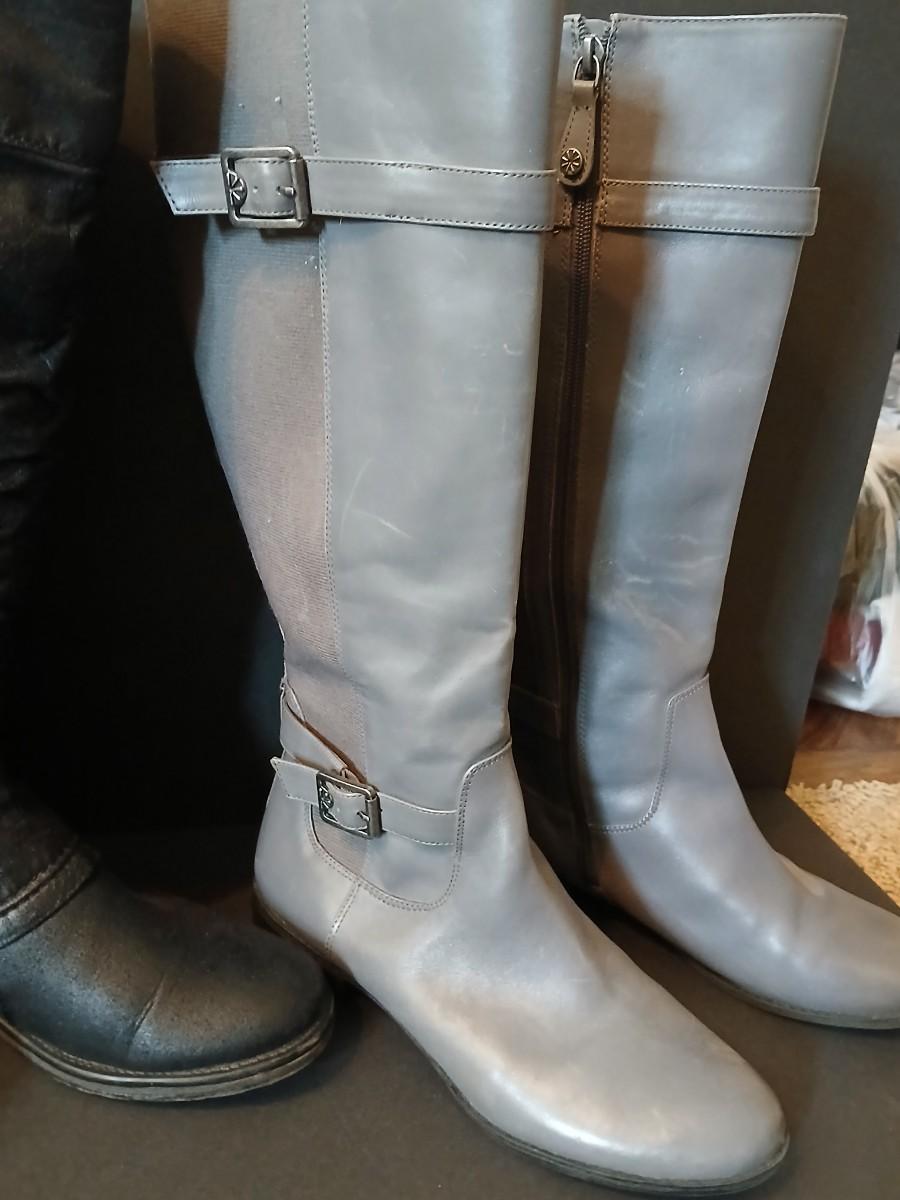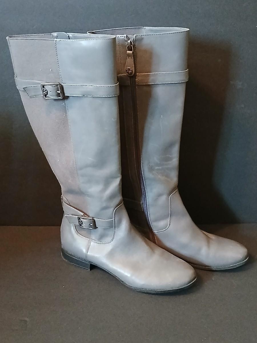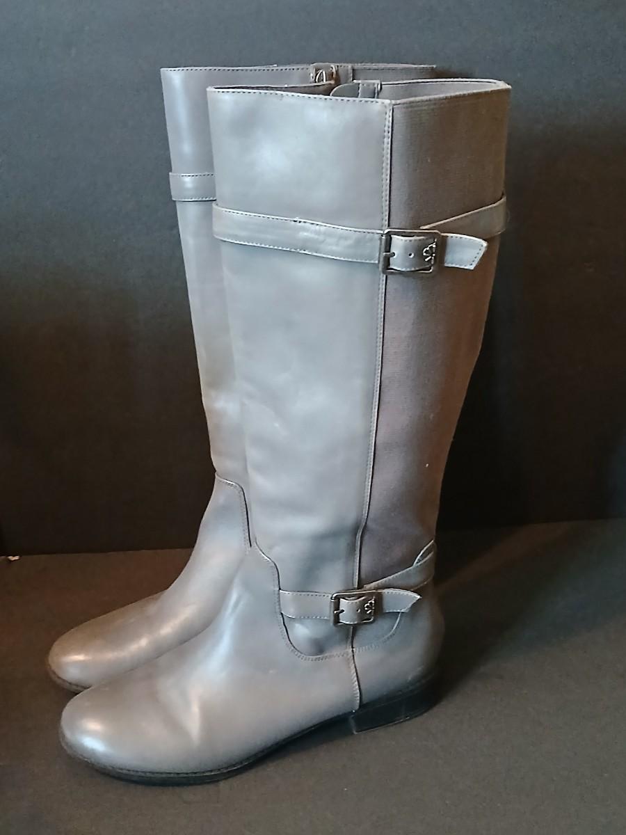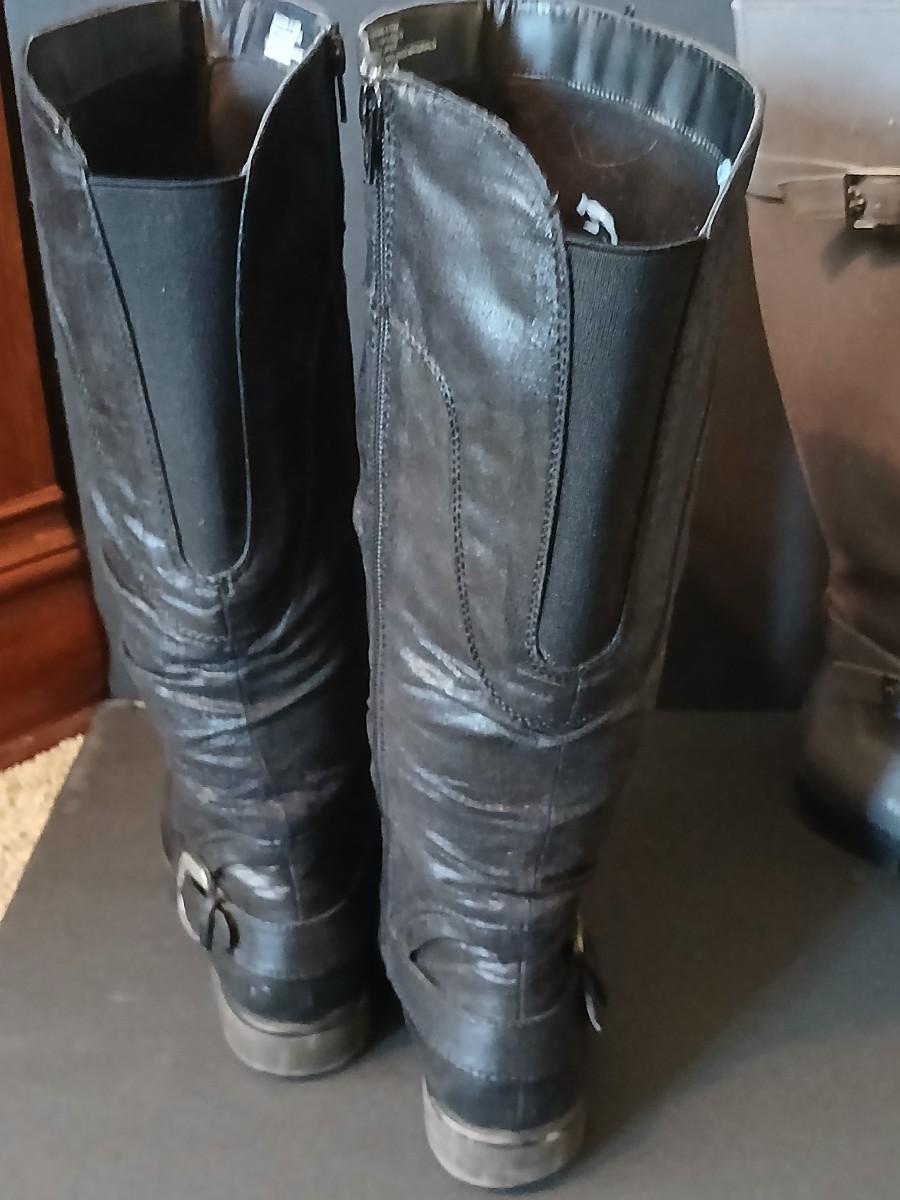 Two pairs of women's tall boots. The black boots are from Bare Traps, size 8.5M, made using balance man-made materials, with buckle accents and a low heel. The gray boots are also size 8.5 and feature buckle detailing along with a sleek design. Both pairs of boots show signs of light wear but remain in functional condition.