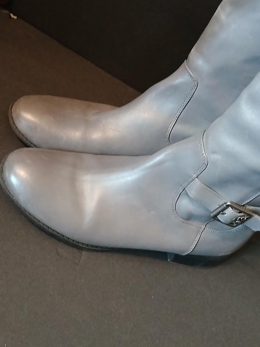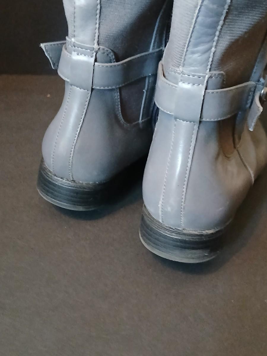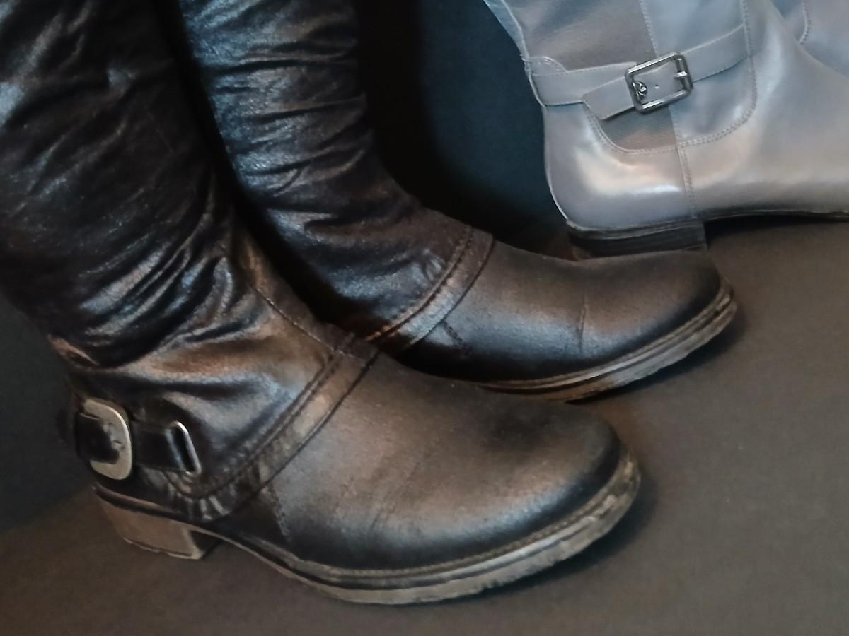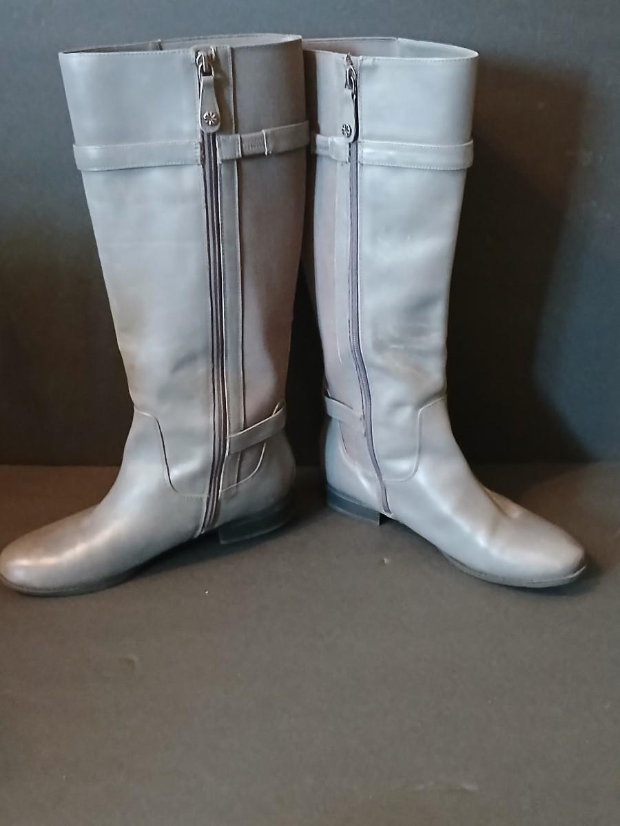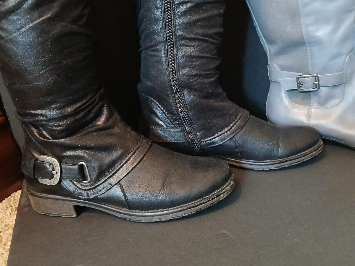 Two pairs of women's tall boots. The black boots are from Bare Traps, size 8.5M, made using balance man-made materials, with buckle accents and a low heel. The gray boots are also size 8.5 and feature buckle detailing along with a sleek design. Both pairs of boots show signs of light wear but remain in functional condition.