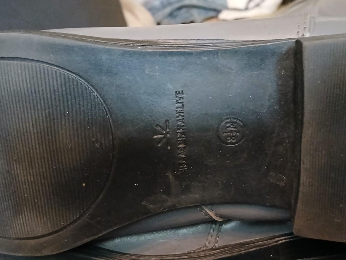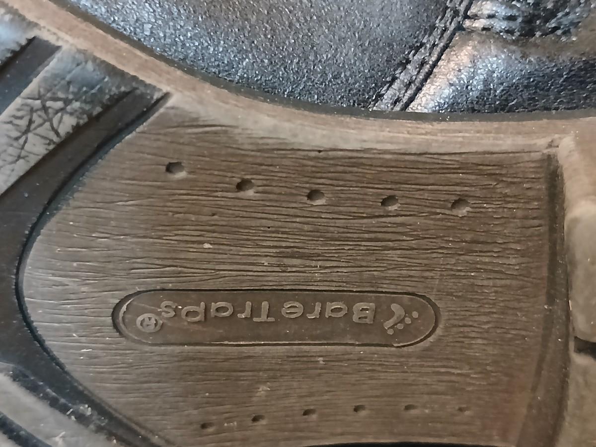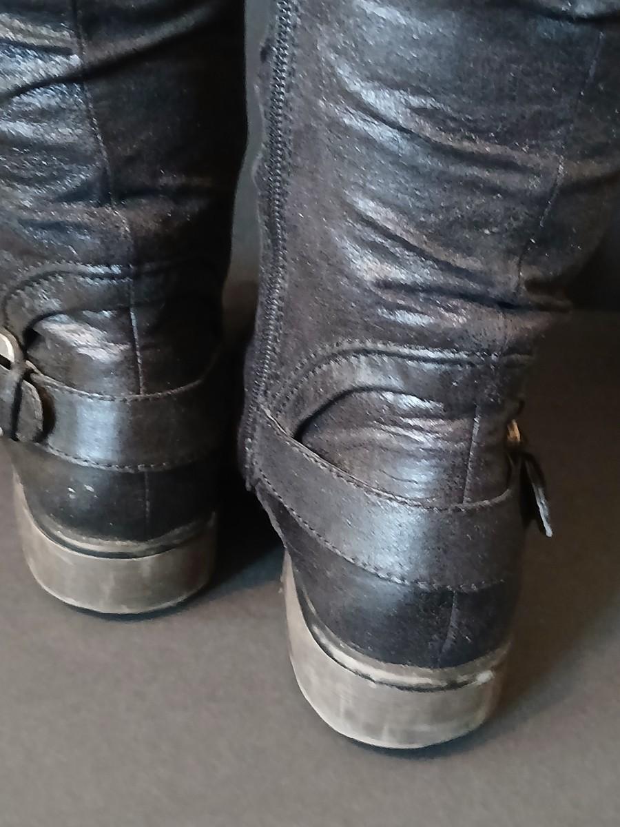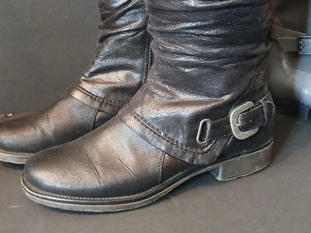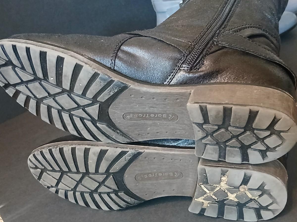 Two pairs of women's tall boots. The black boots are from Bare Traps, size 8.5M, made using balance man-made materials, with buckle accents and a low heel. The gray boots are also size 8.5 and feature buckle detailing along with a sleek design. Both pairs of boots show signs of light wear but remain in functional condition.