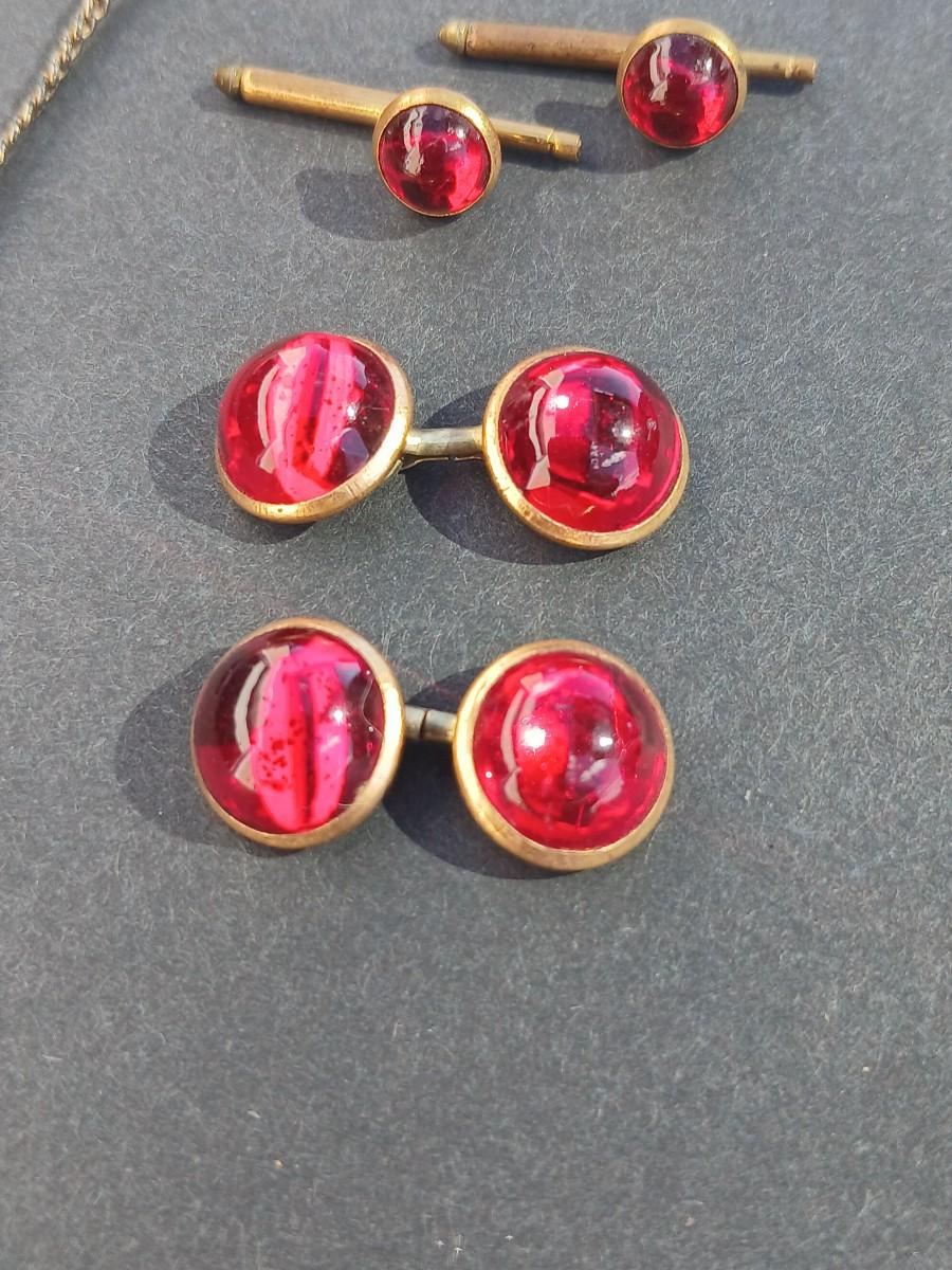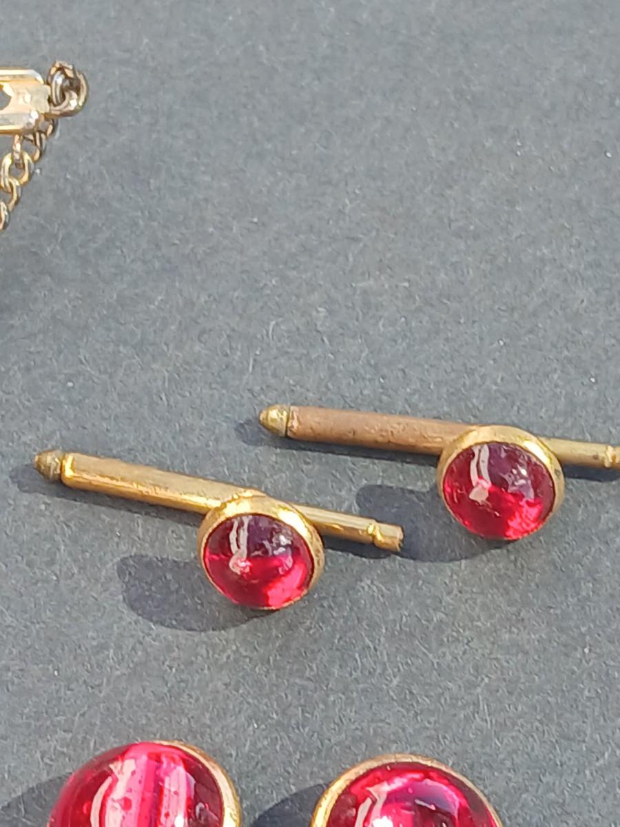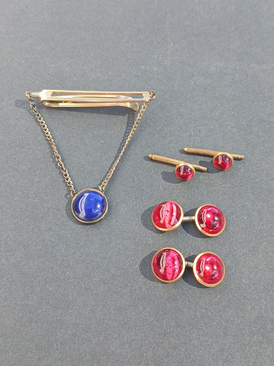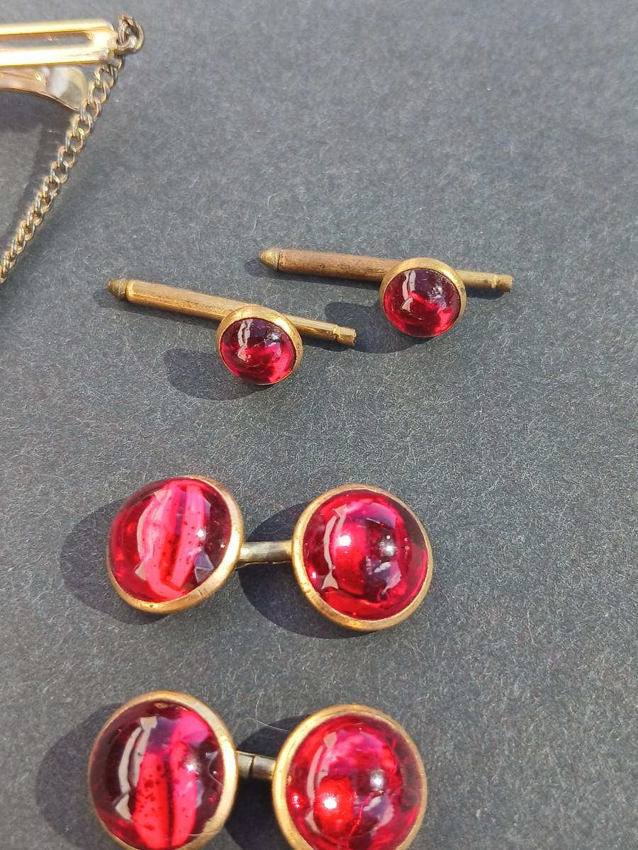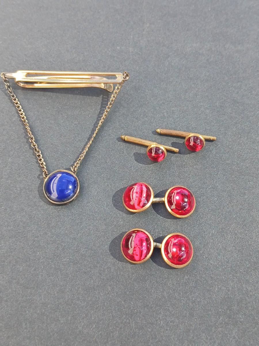 Vintage 1940's red Lucite deco cufflinks and matching shirt studs - with a Blue swinging tie clasp
