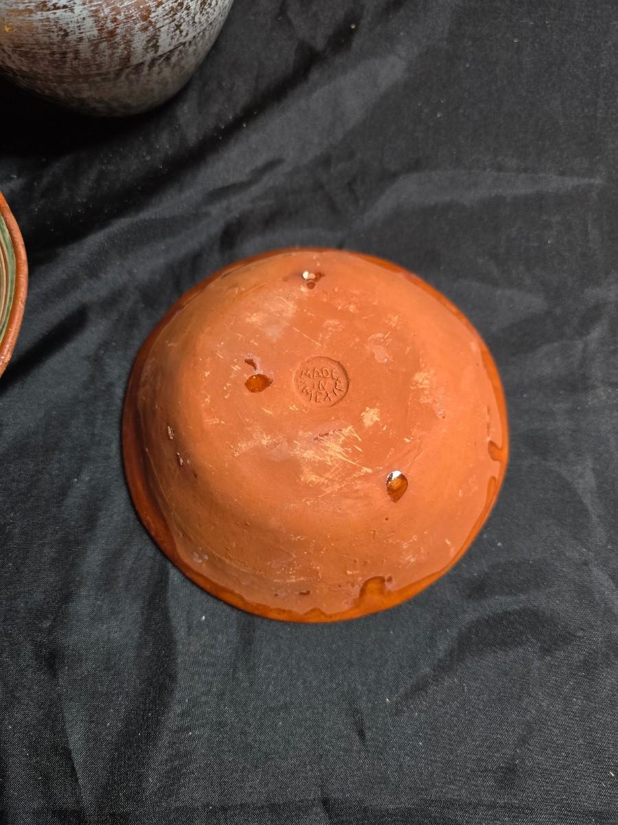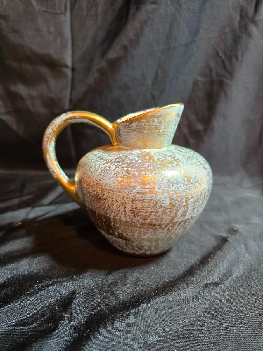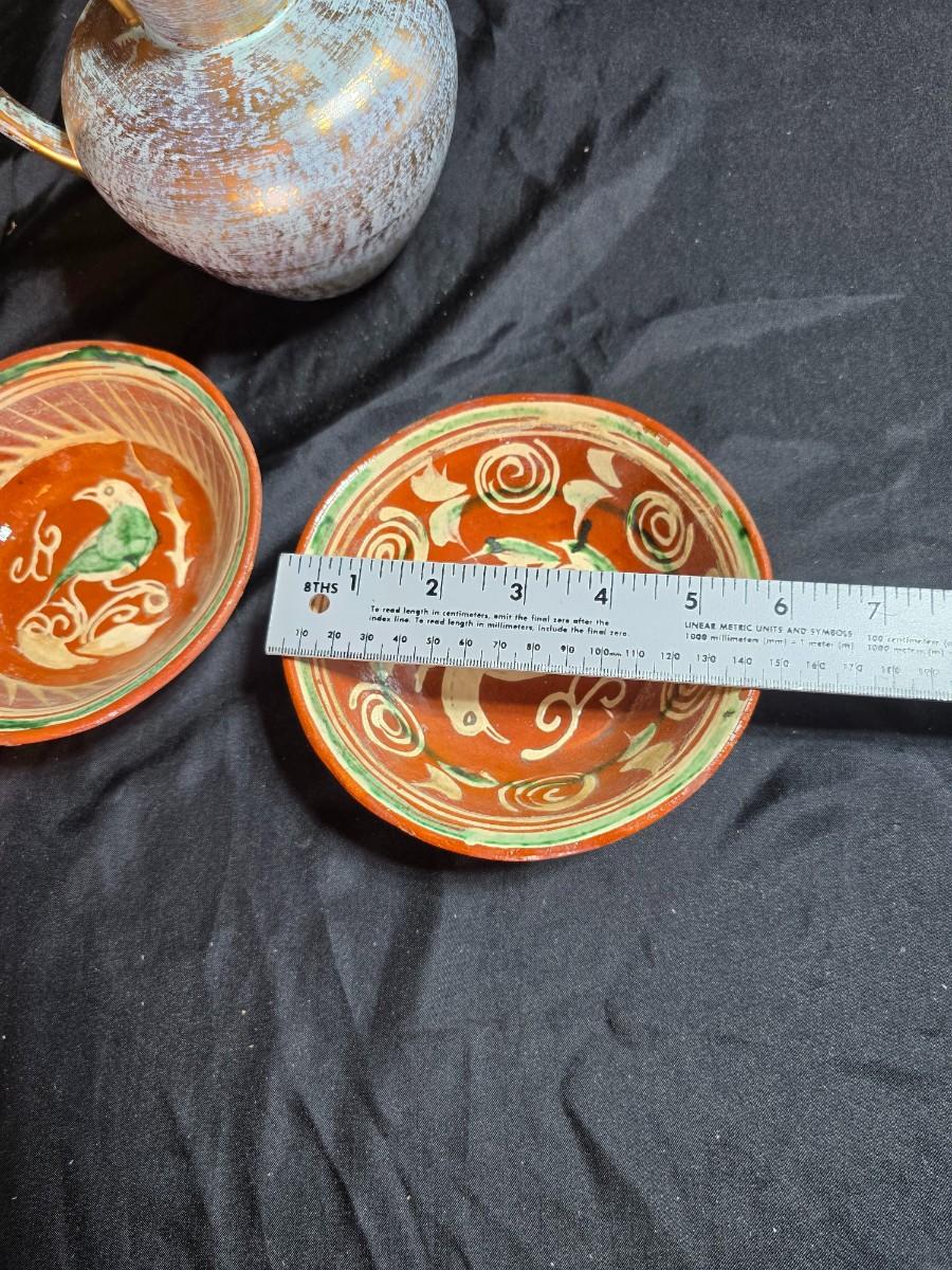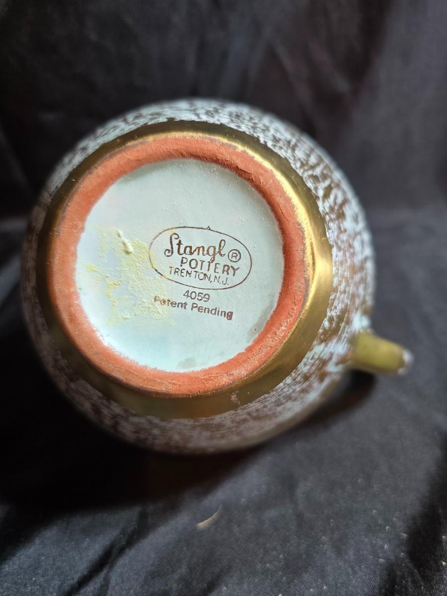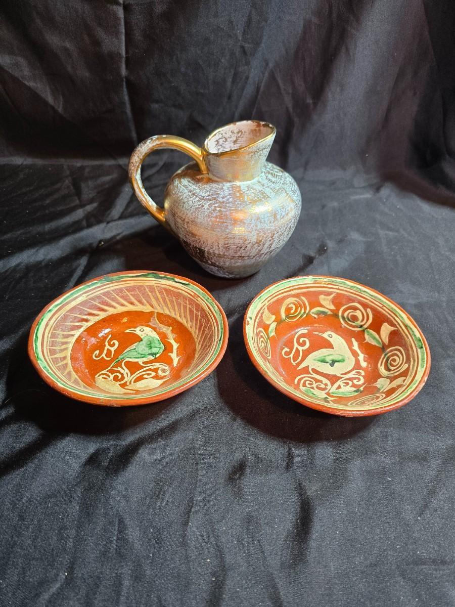 Antique gold patterned vintage Stangl Pottery pitcher with two vintage Mexican pottery Tlaquepaque bowls
