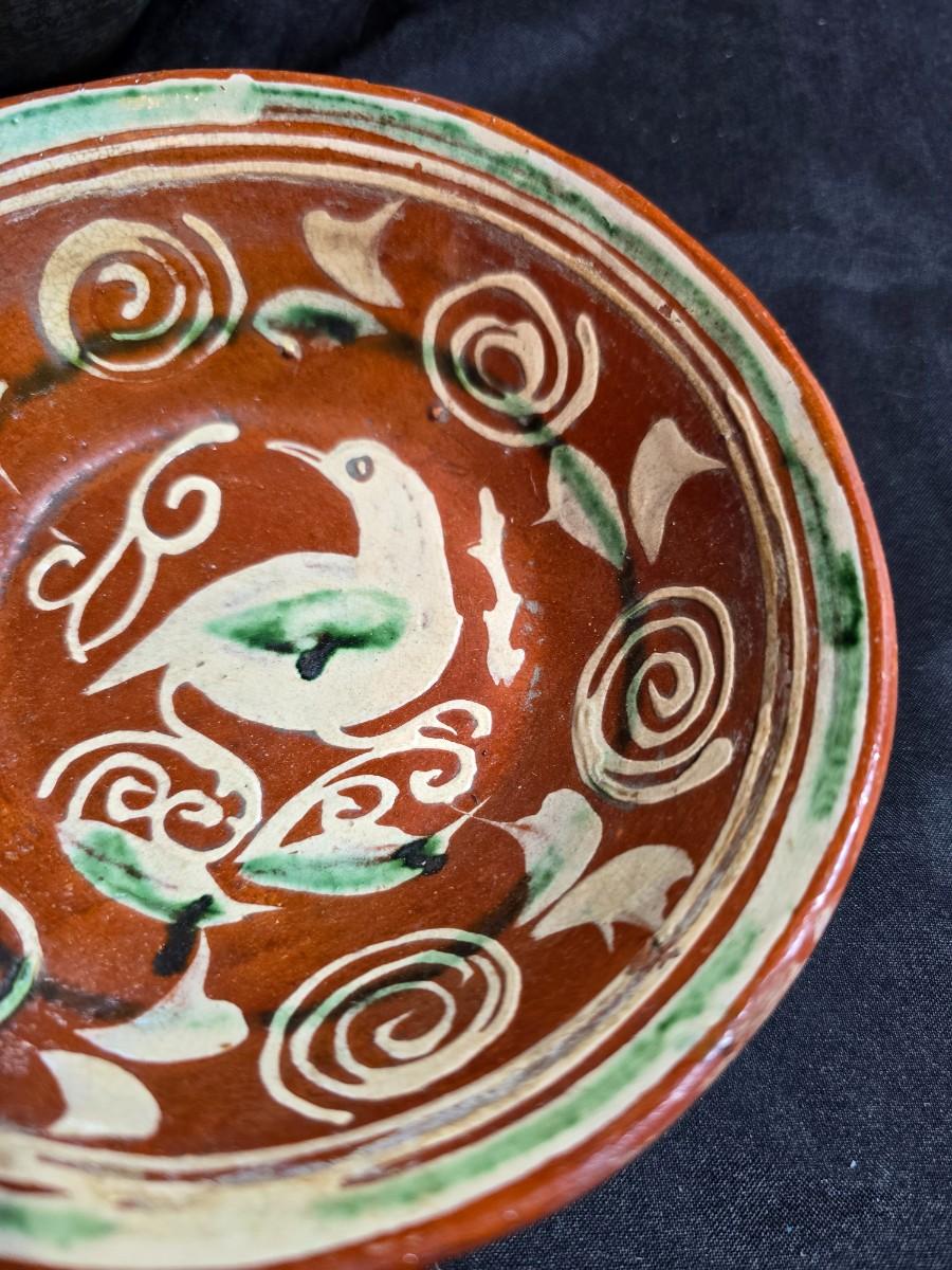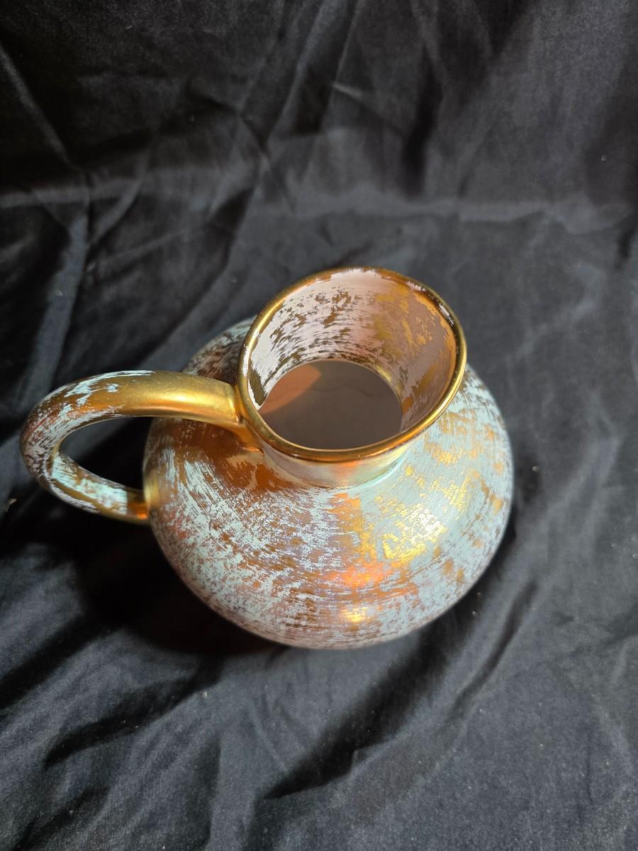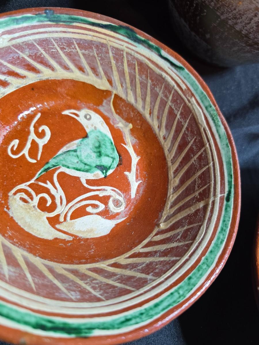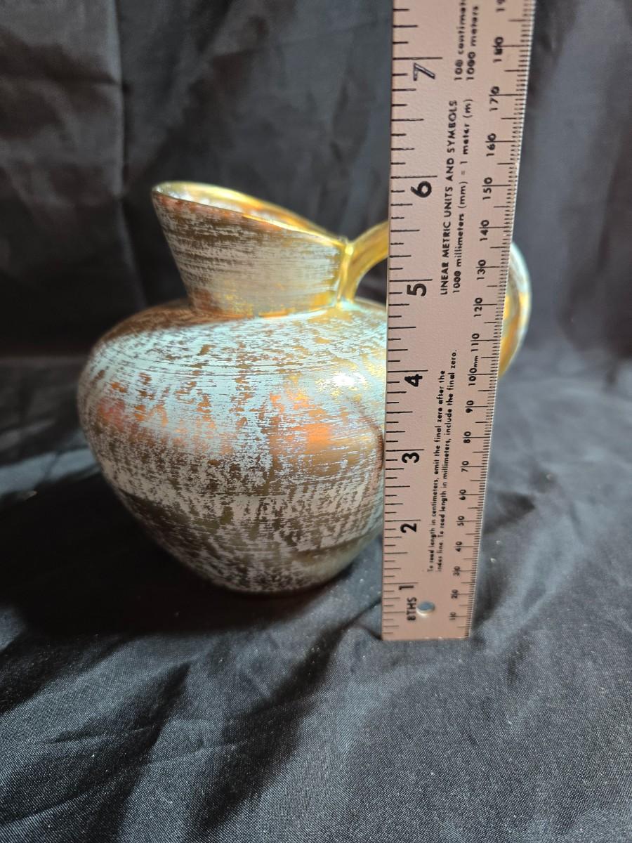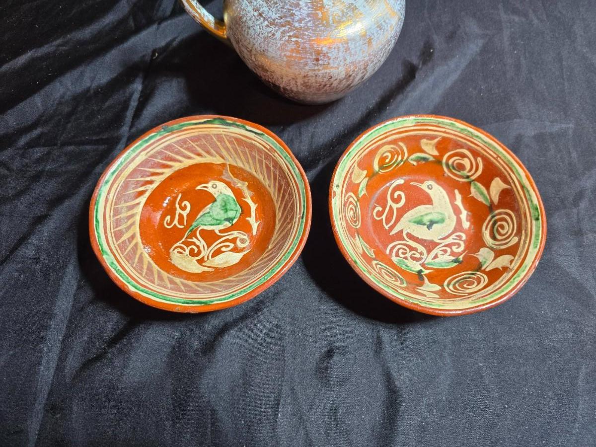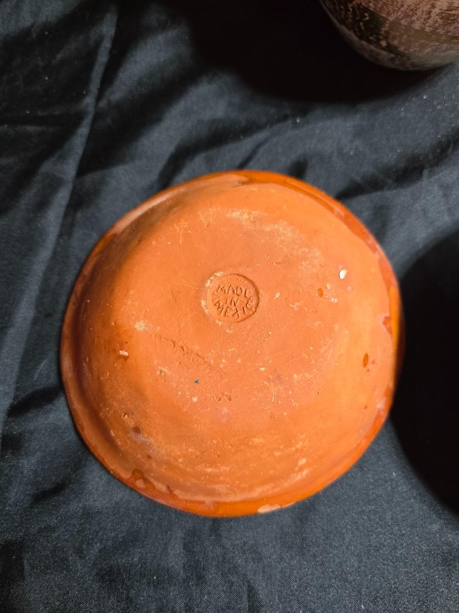 Antique gold patterned vintage Stangl Pottery pitcher with two vintage Mexican pottery Tlaquepaque bowls