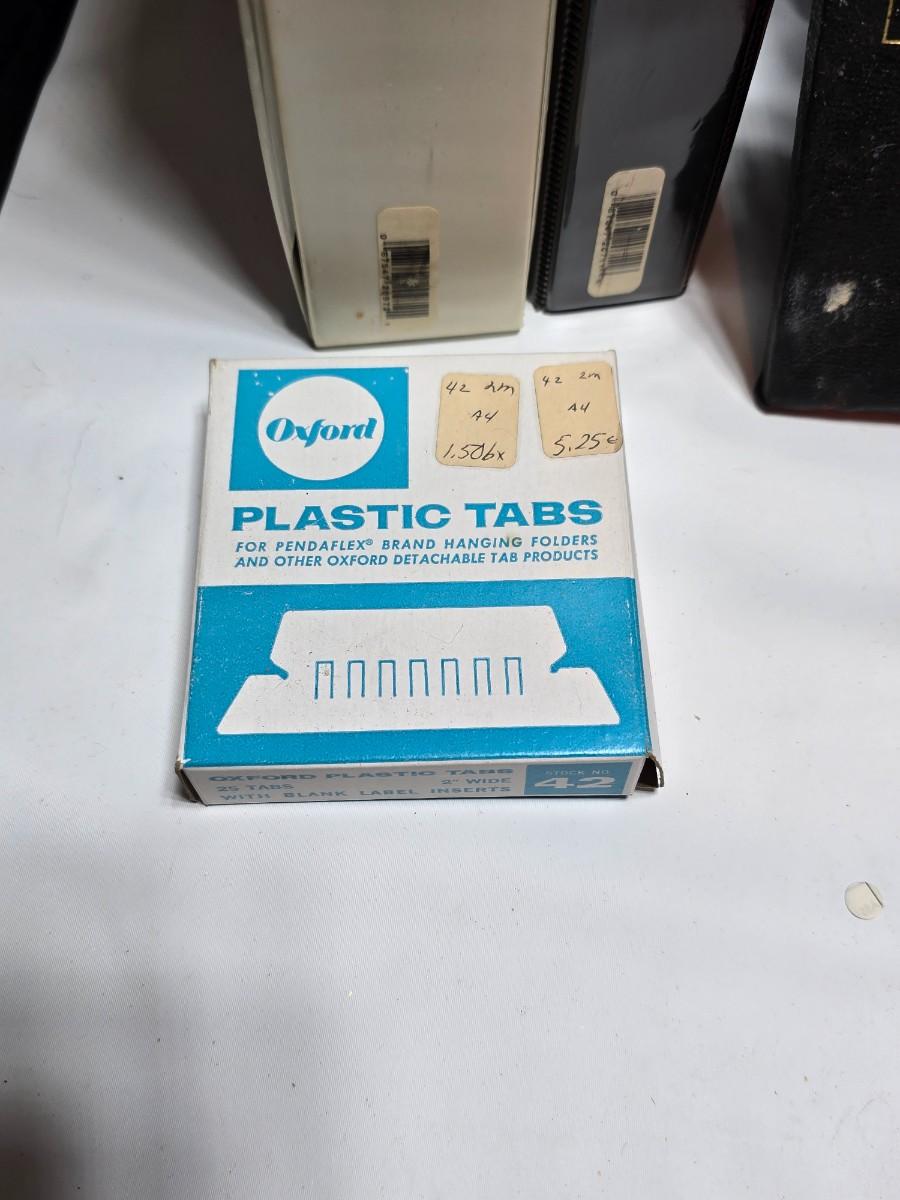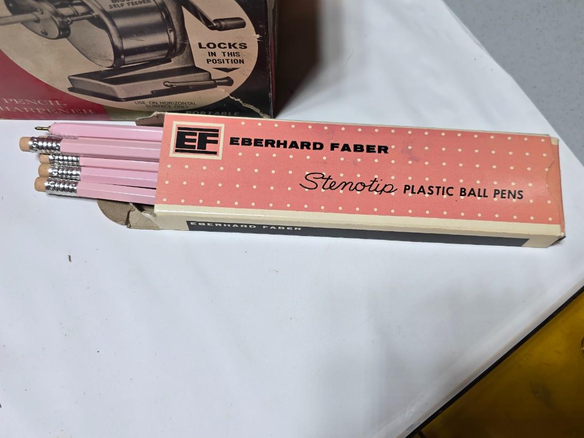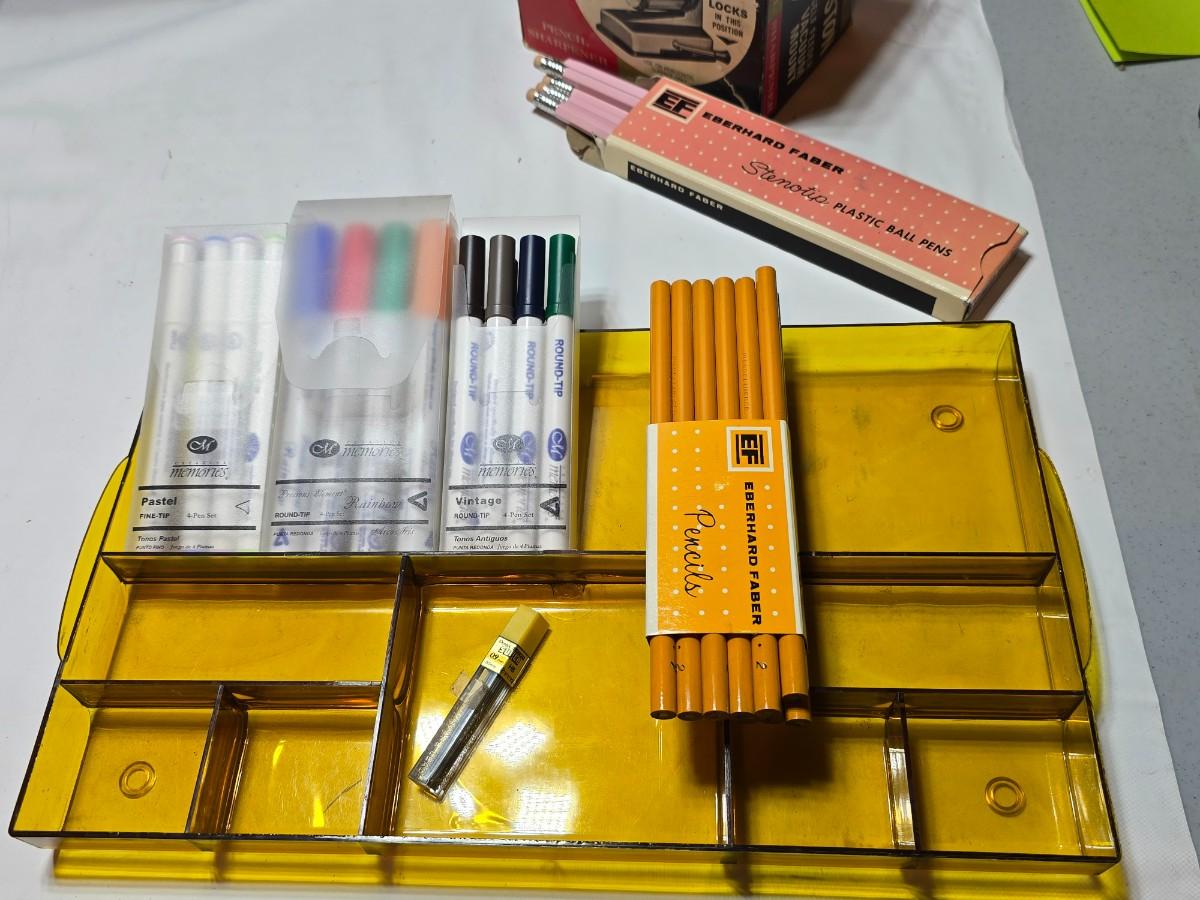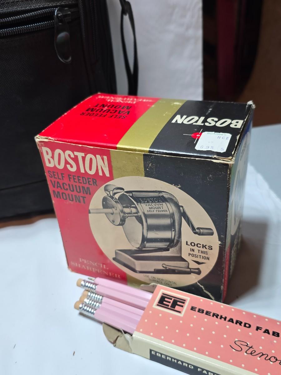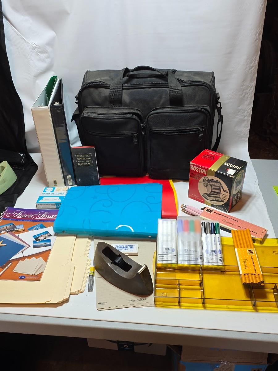 Office items - tape dispenser - old pencil sharpeners - brief case - files - folders- markers and more