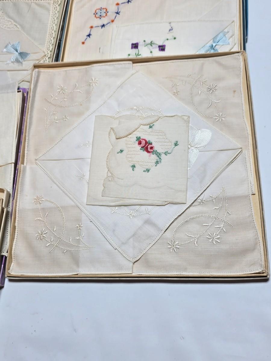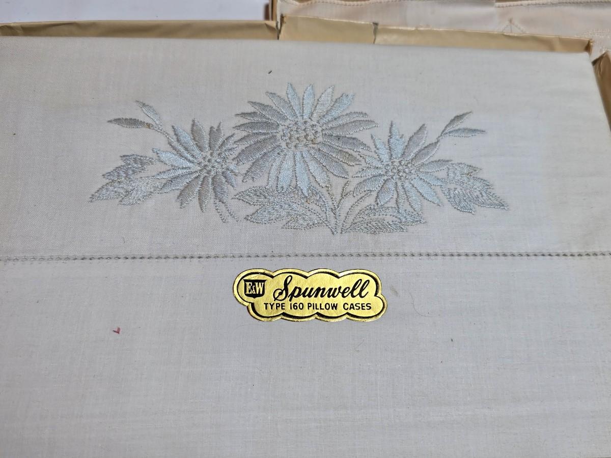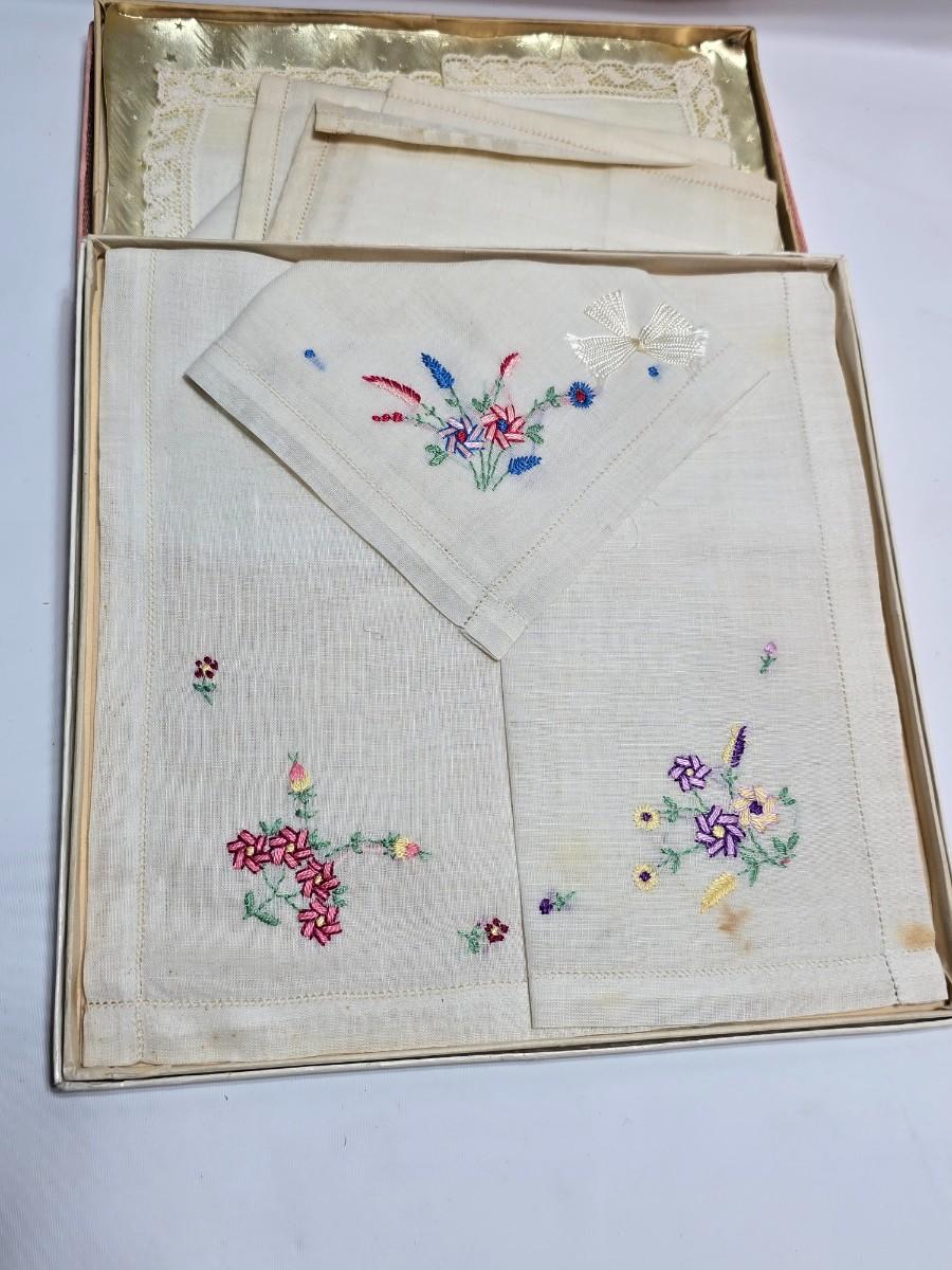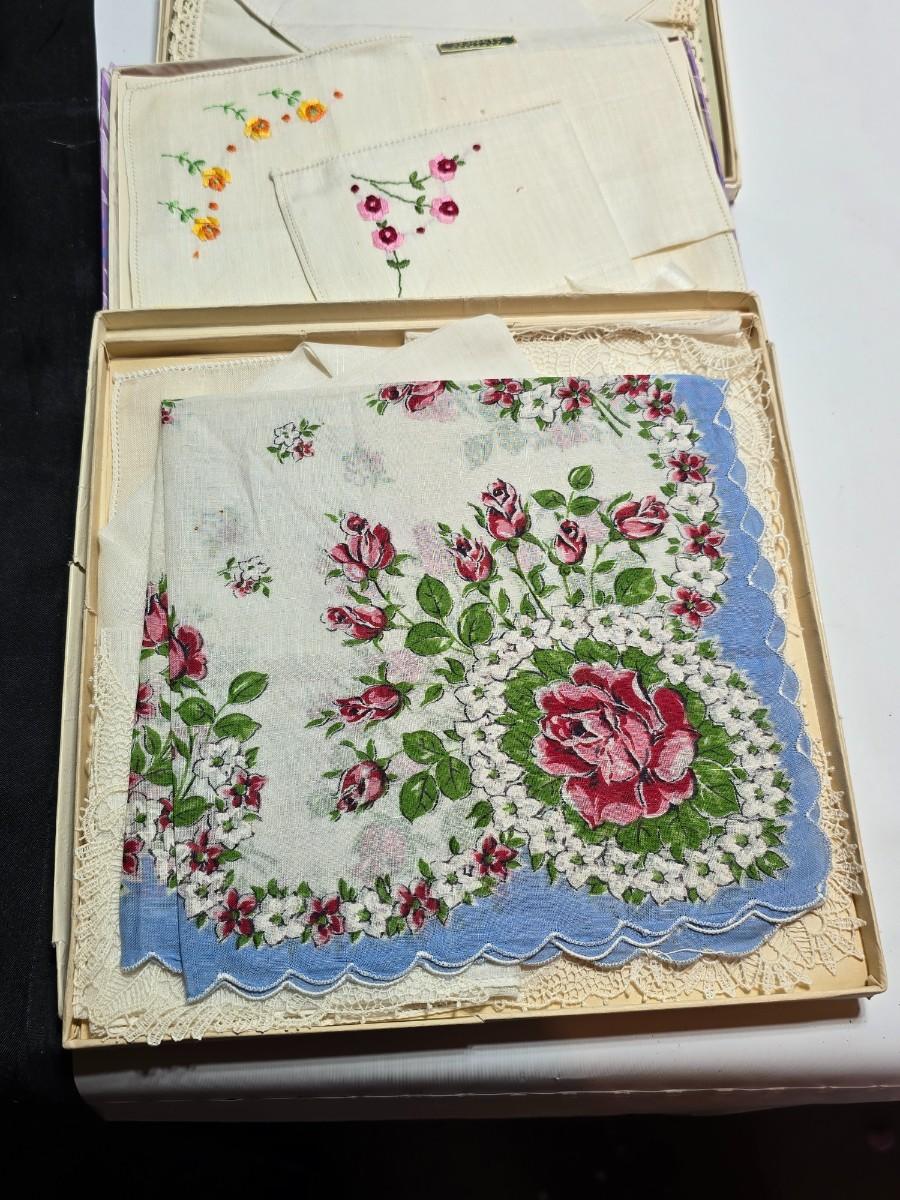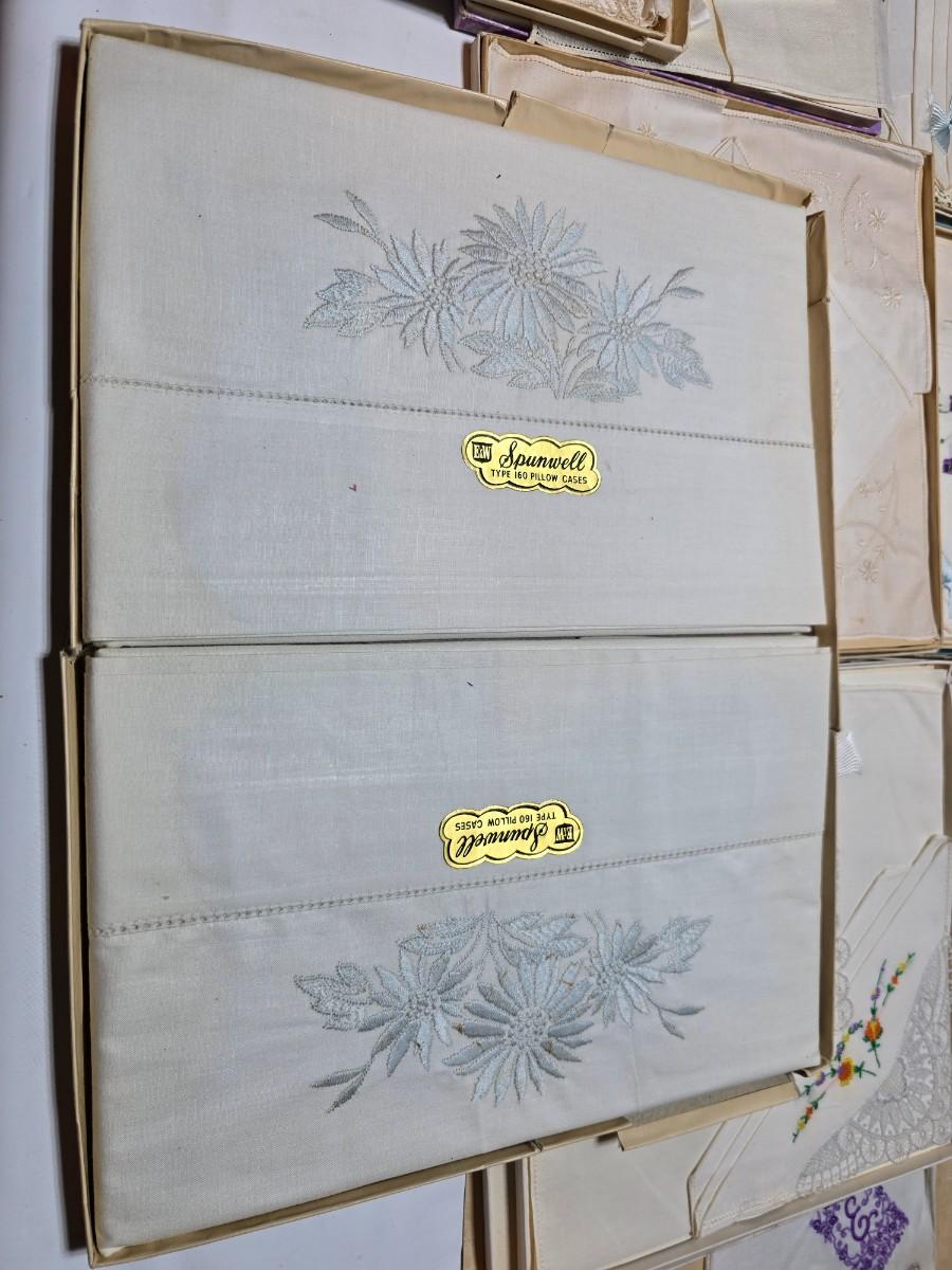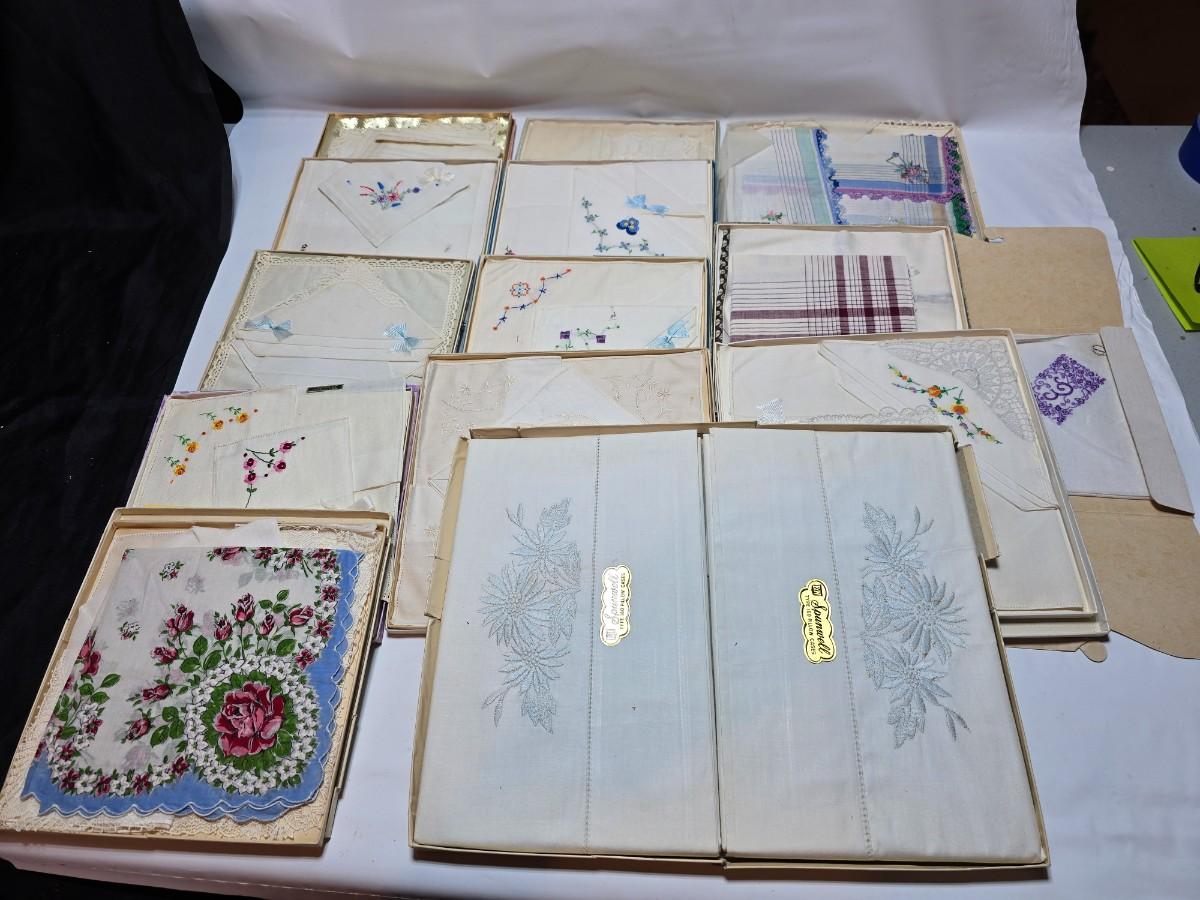 At least 10 Vintage embroidered kerchiefs - and Spunwell pillowcases in original boxes -
