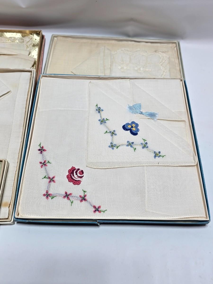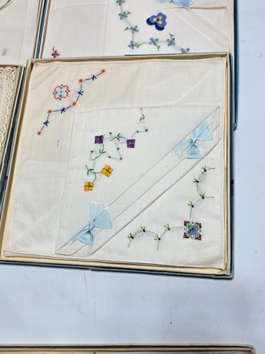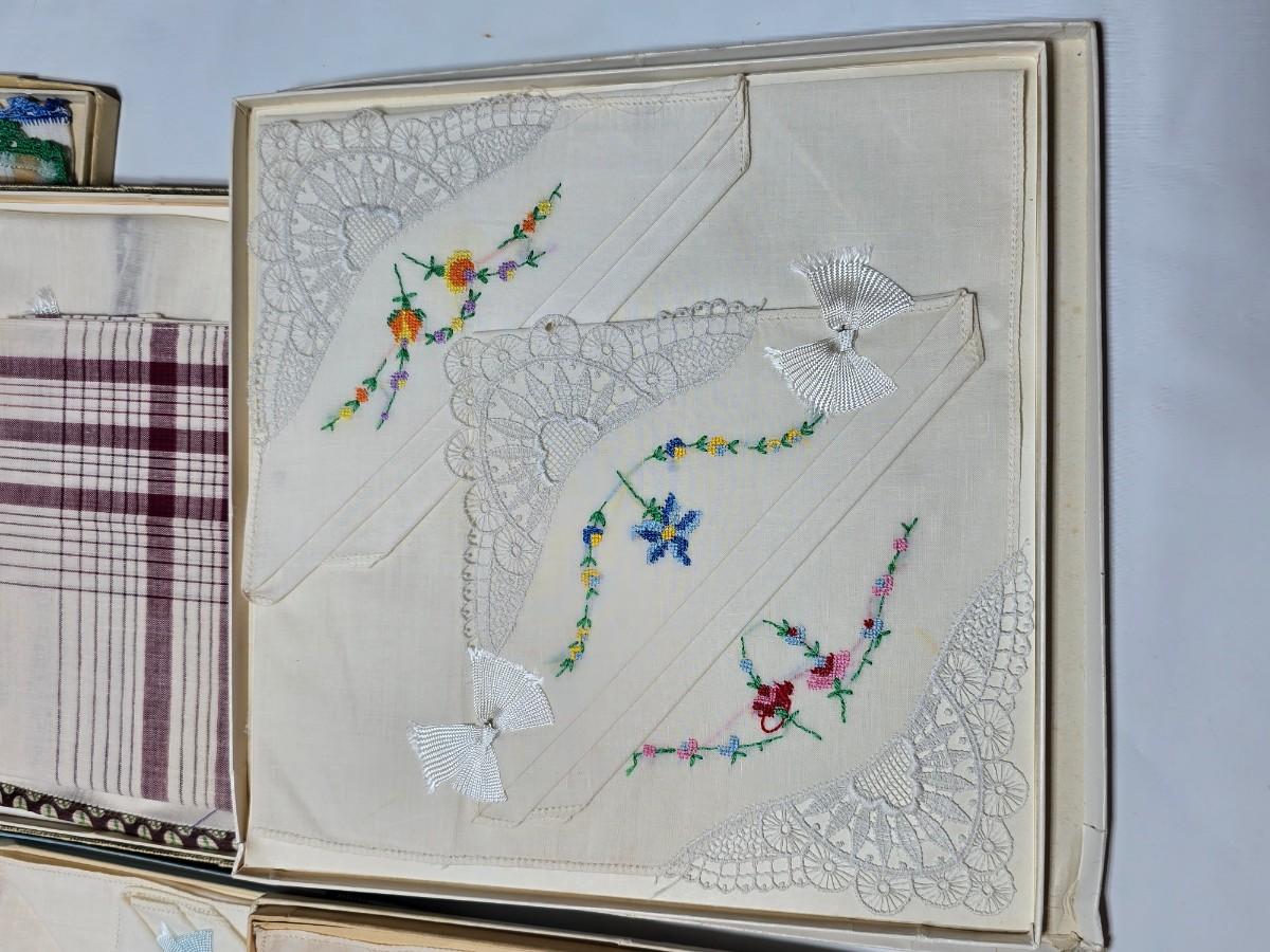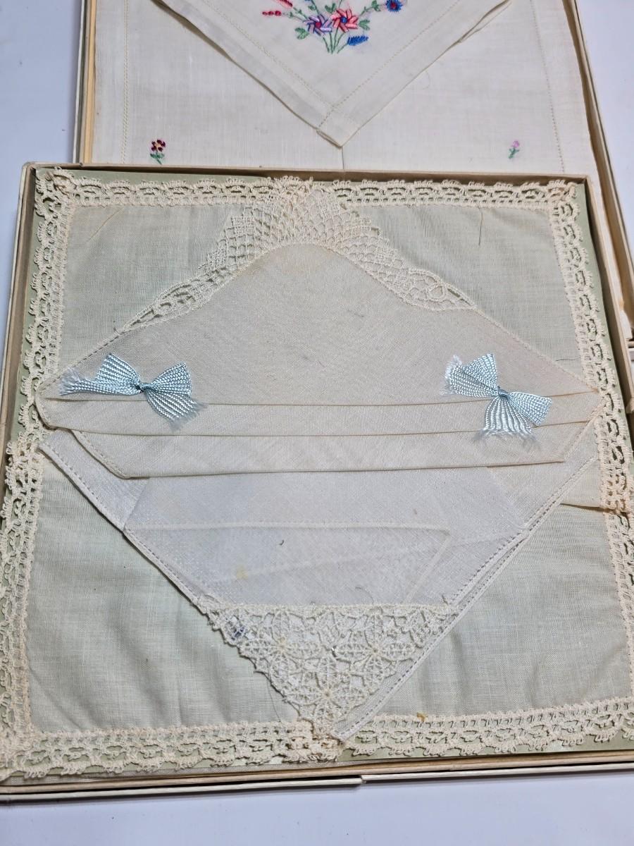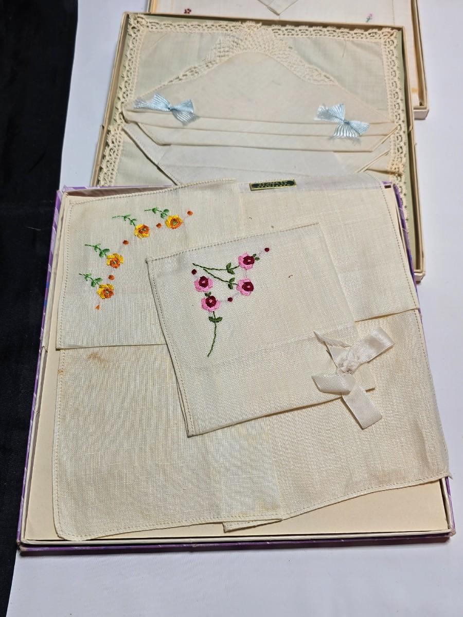 At least 10 Vintage embroidered kerchiefs - and Spunwell pillowcases in original boxes -