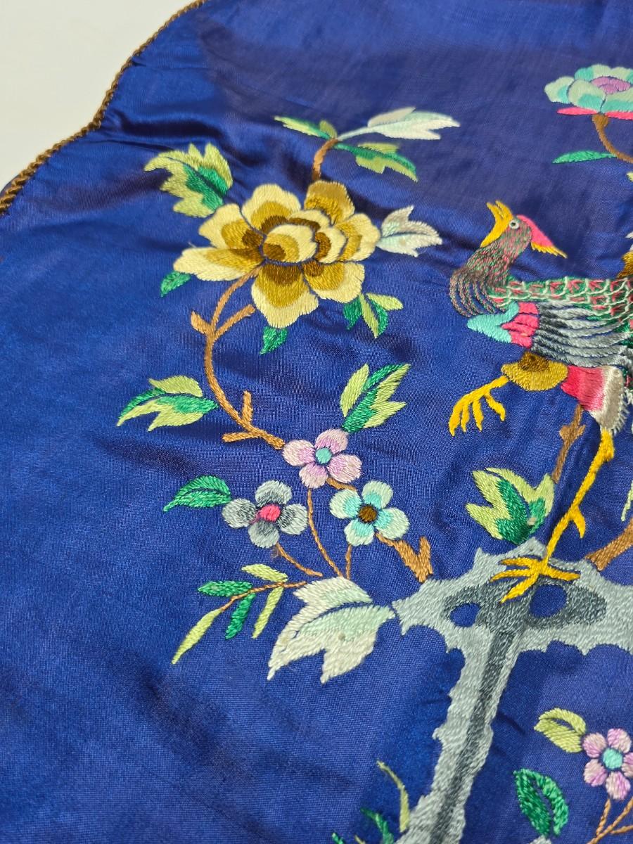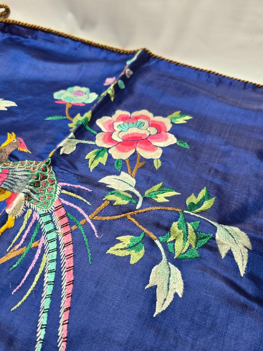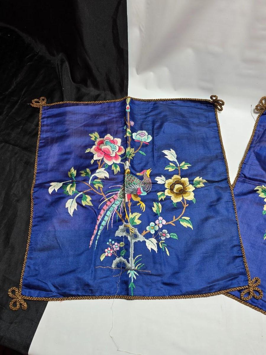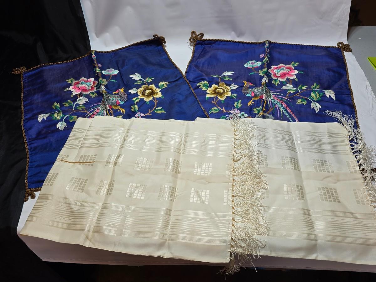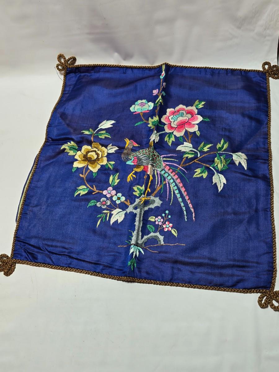 Two Beautiful Vintage Hand Embroidered Asian Floral & quail Design Panel on Silk / Decorative Pillow Covers with table runner