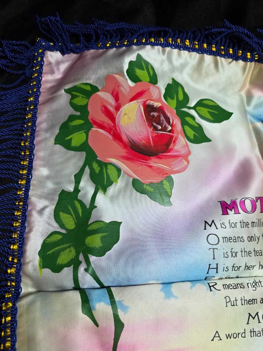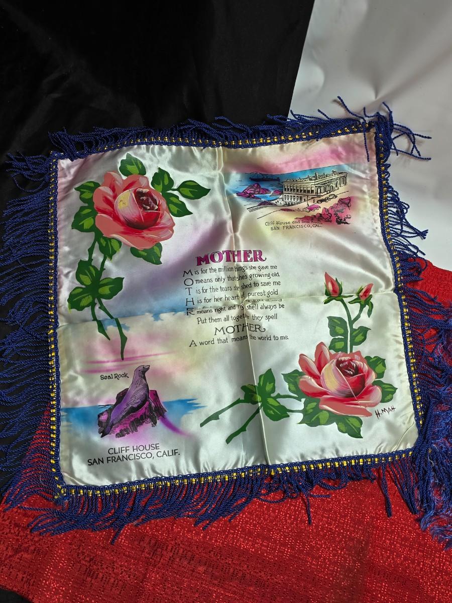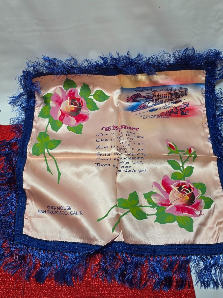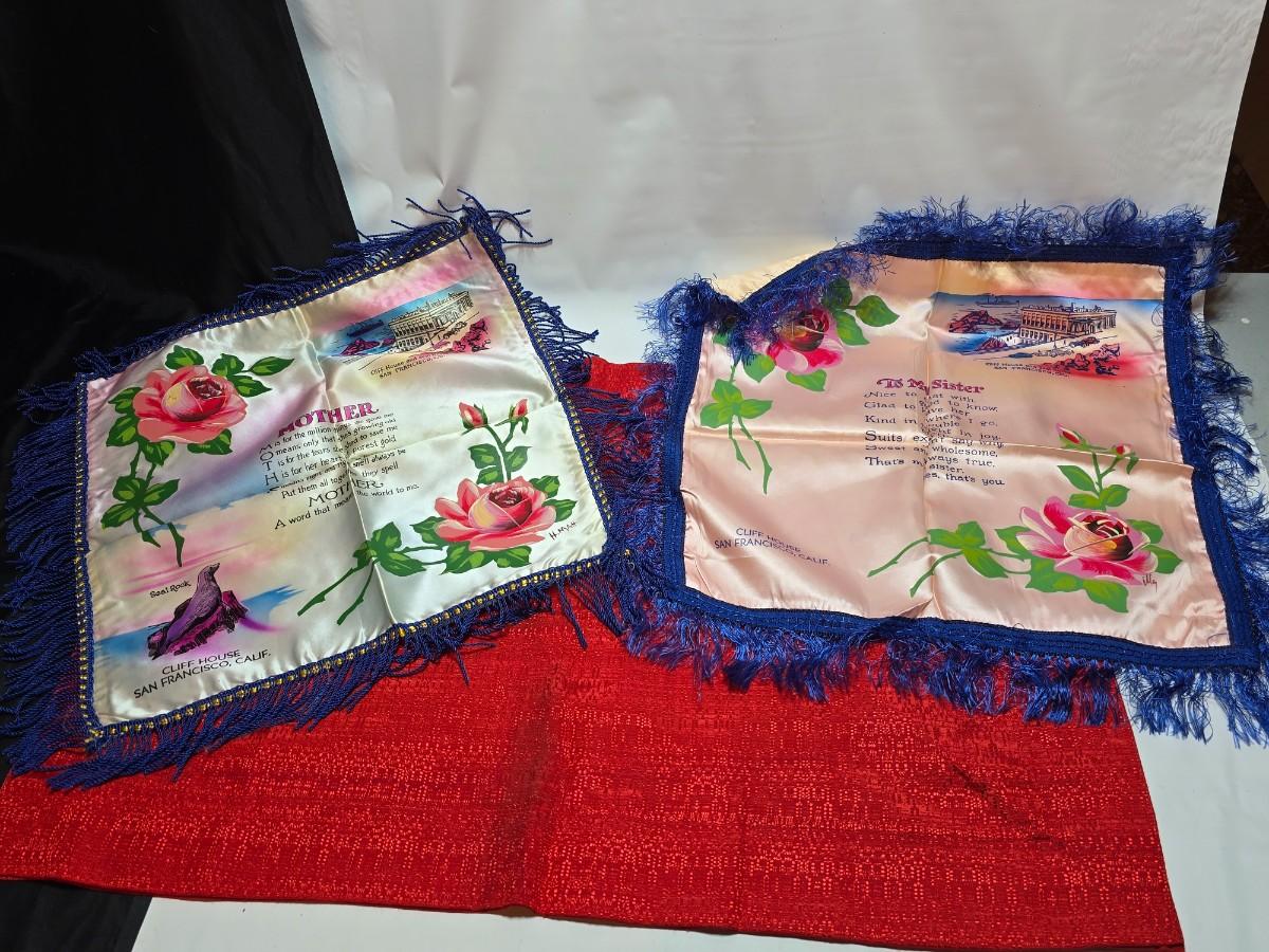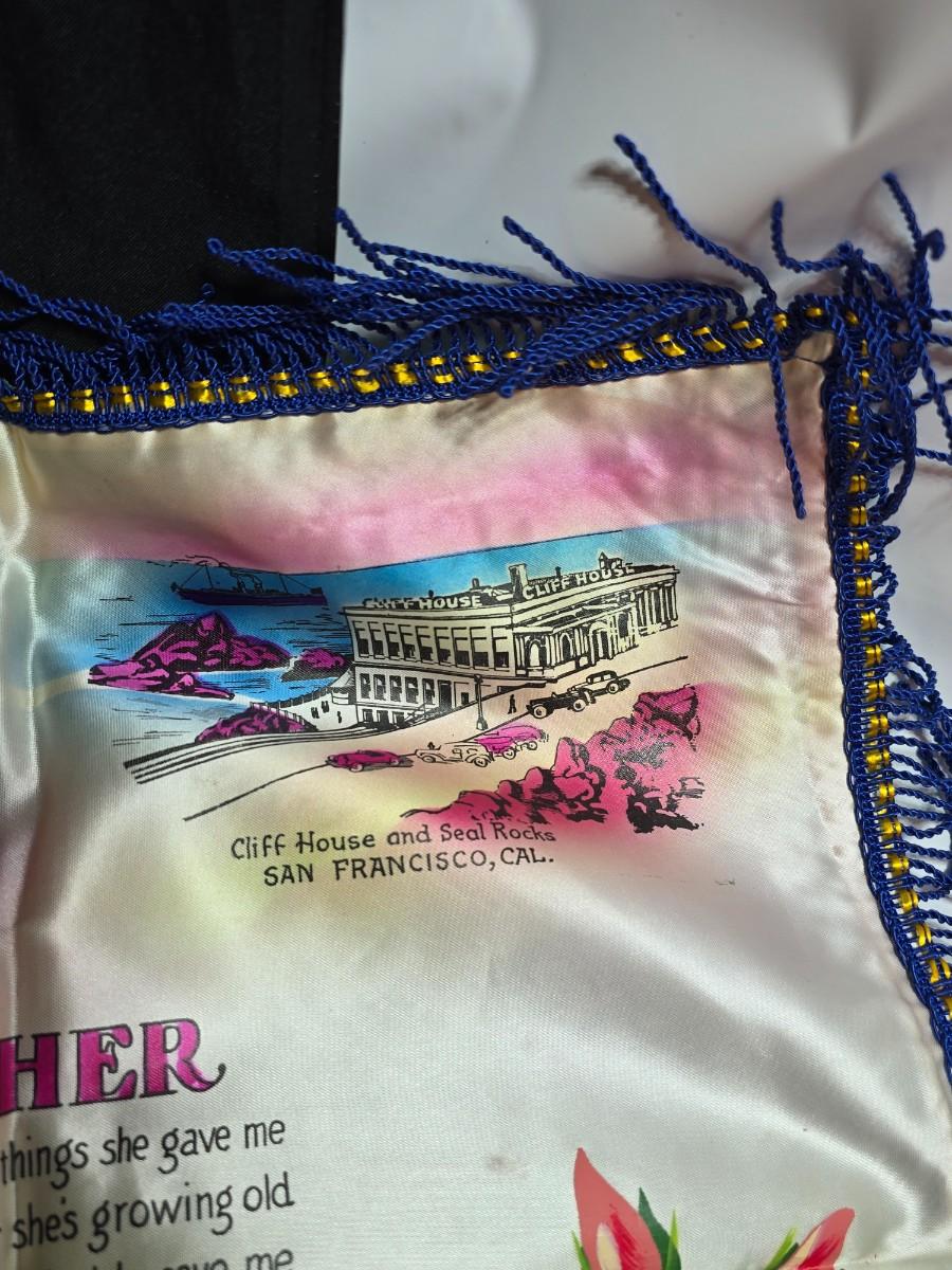 vintage souvenir satin pillowcases with a poems titled "To my Mother" and "To My Sister." These types of pillowcases were popular souvenirs, particularly during the World War II era, and were often sent by military personnel to loved ones.