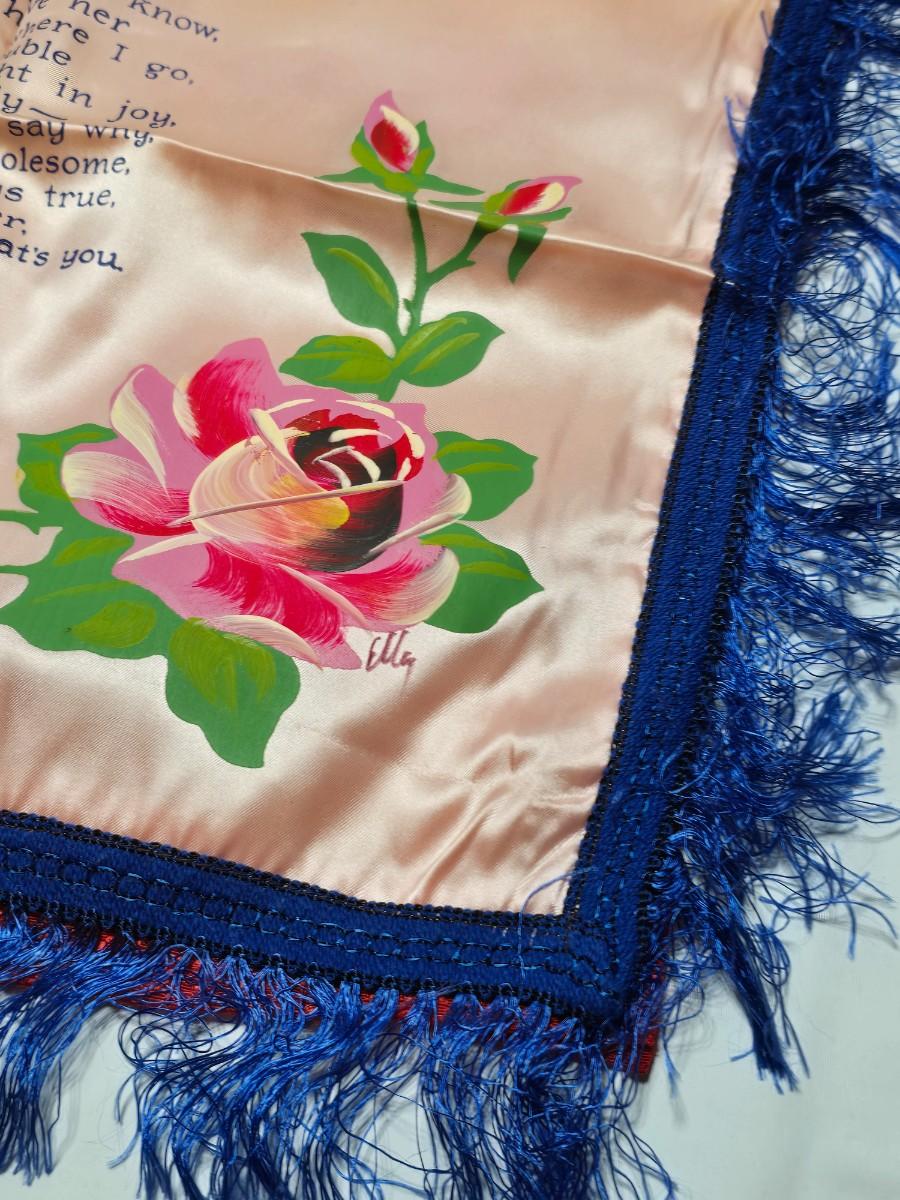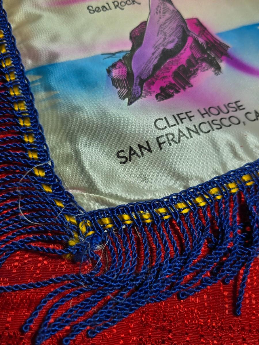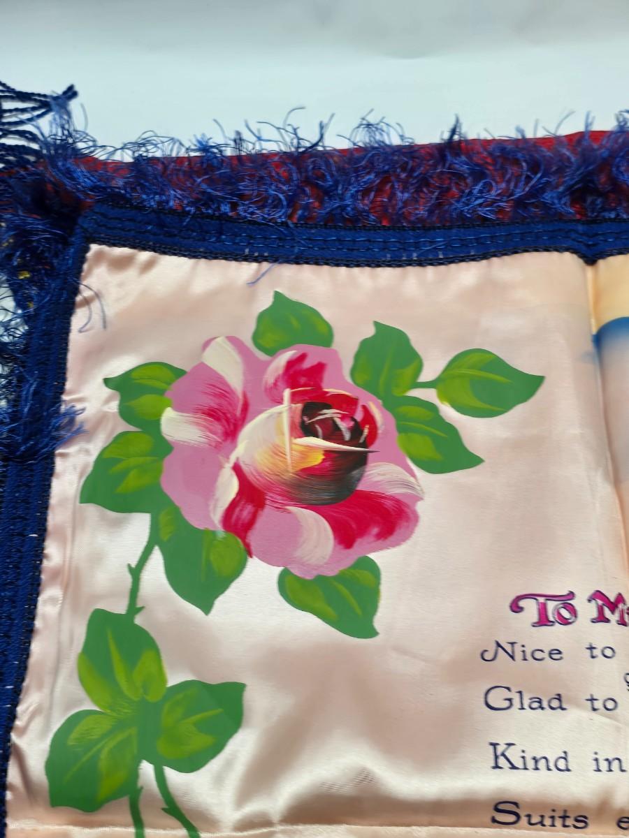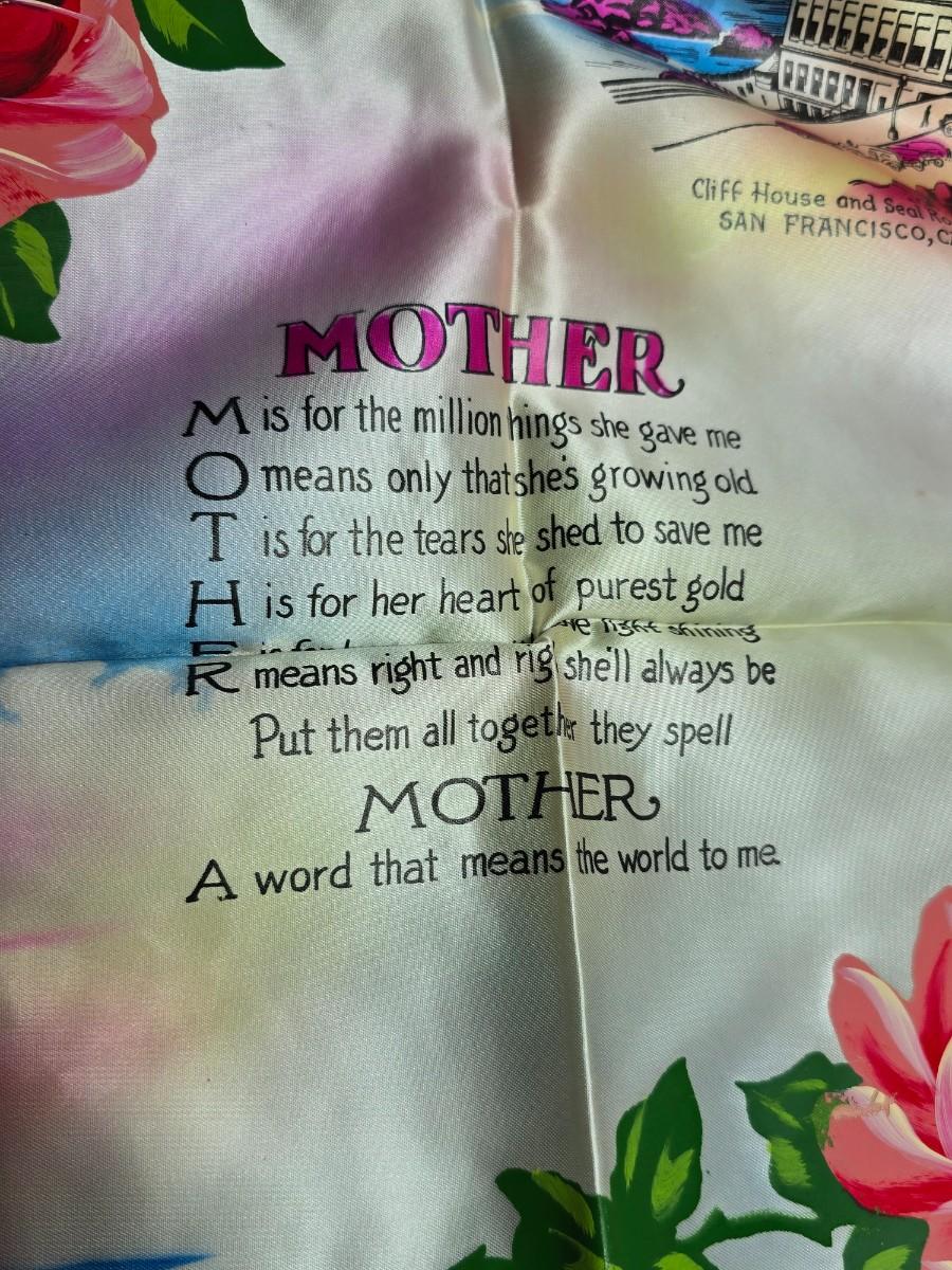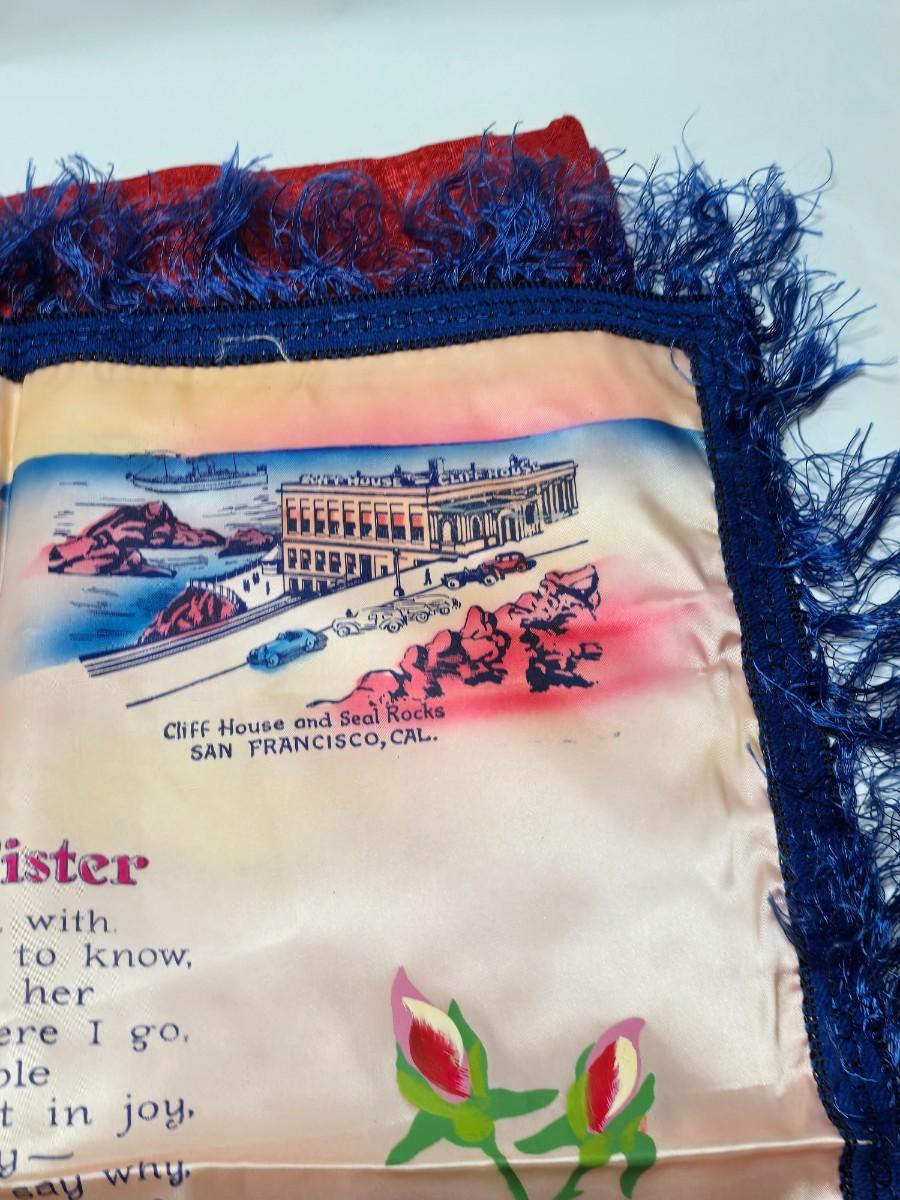 vintage souvenir satin pillowcases with a poems titled "To my Mother" and "To My Sister." These types of pillowcases were popular souvenirs, particularly during the World War II era, and were often sent by military personnel to loved ones.