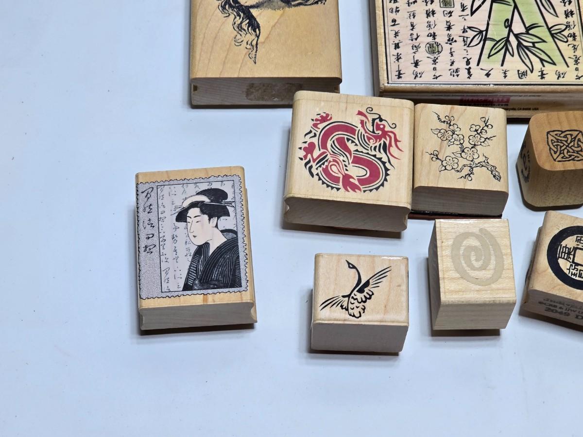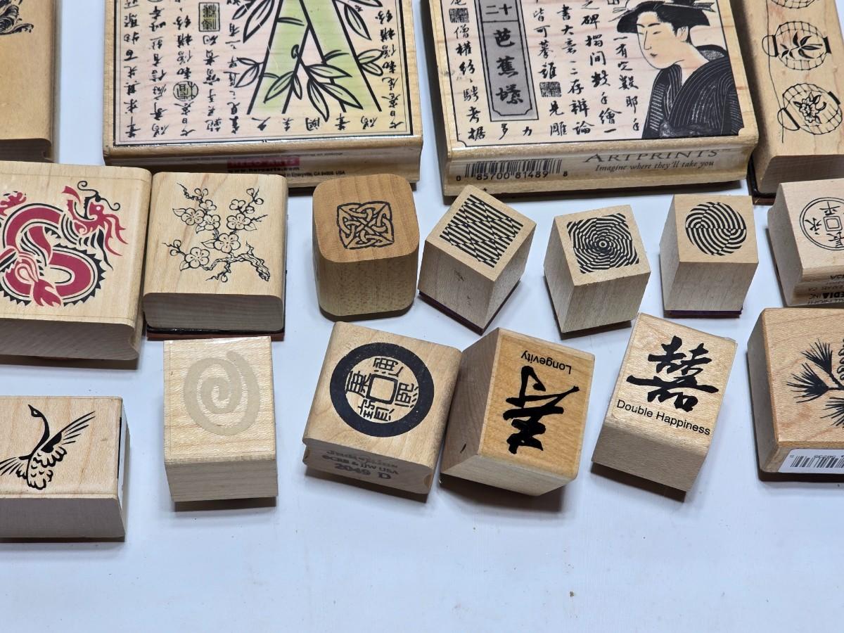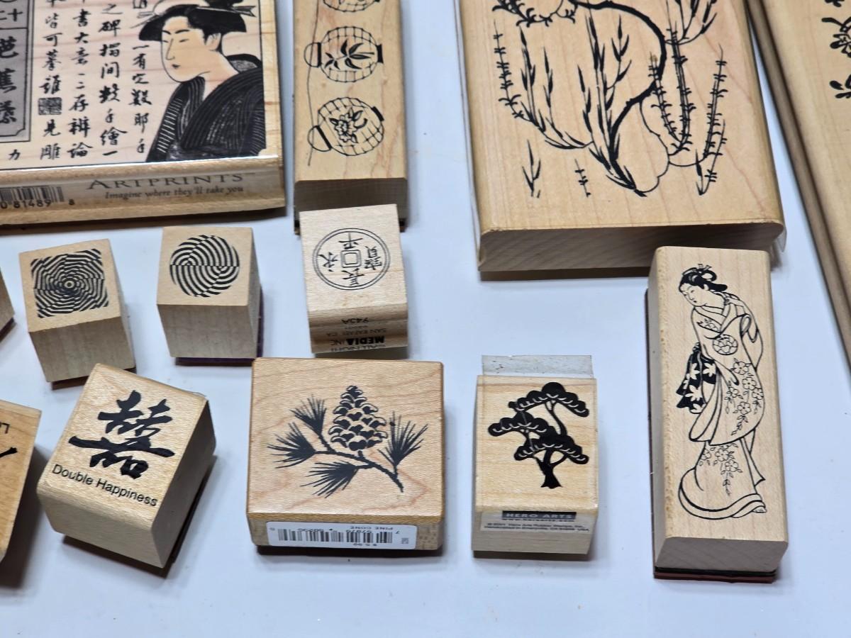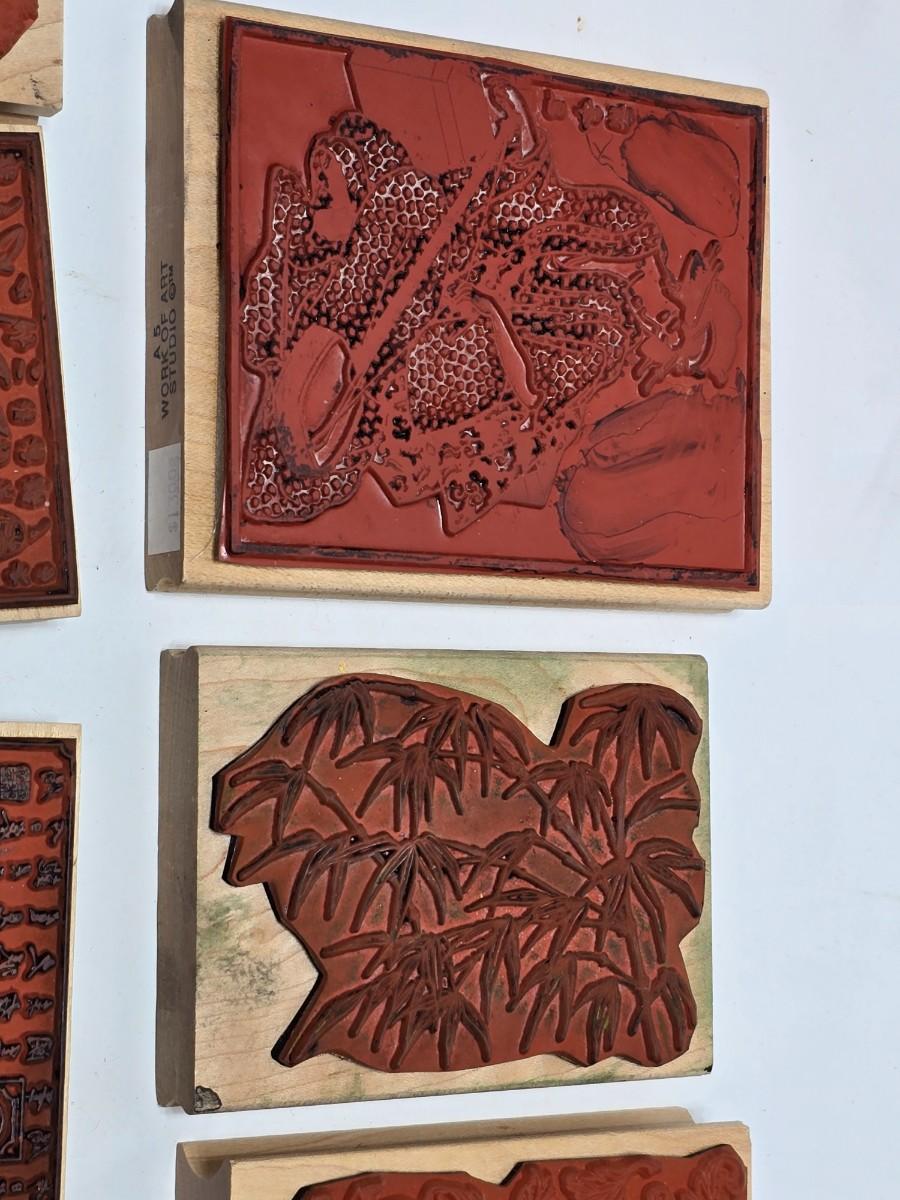 Stamps mounted on wood blocks - mostly Asian themed - bamboo - letters- and more