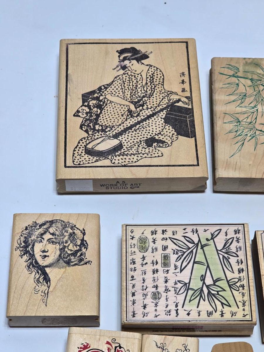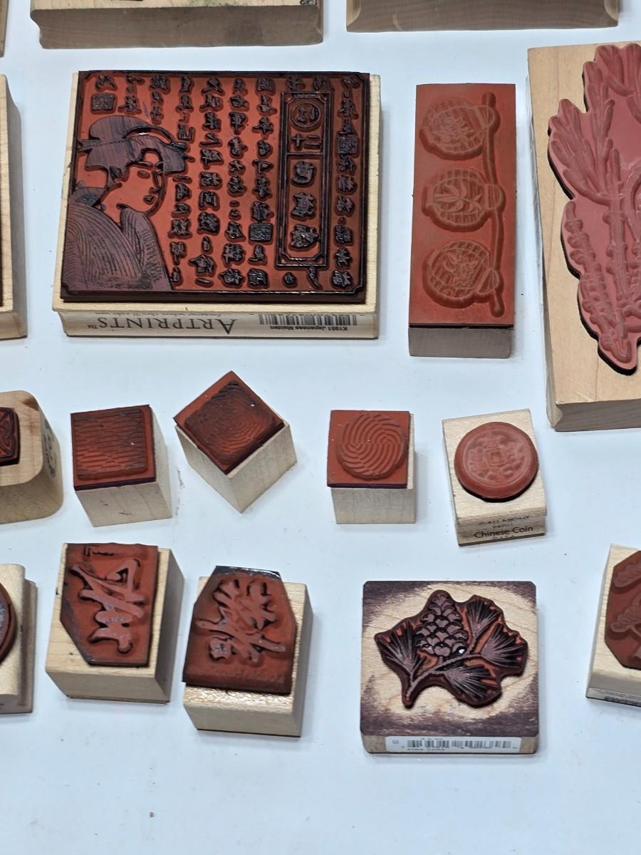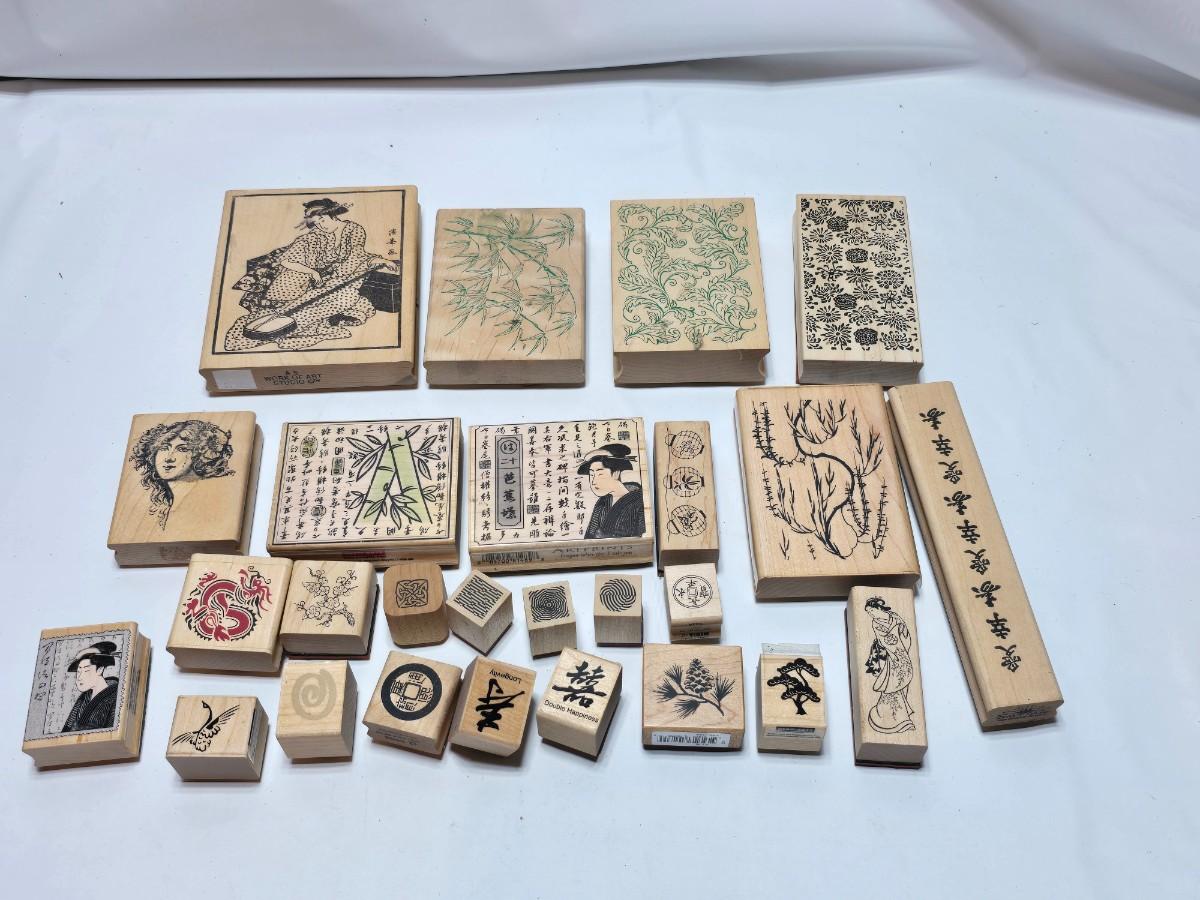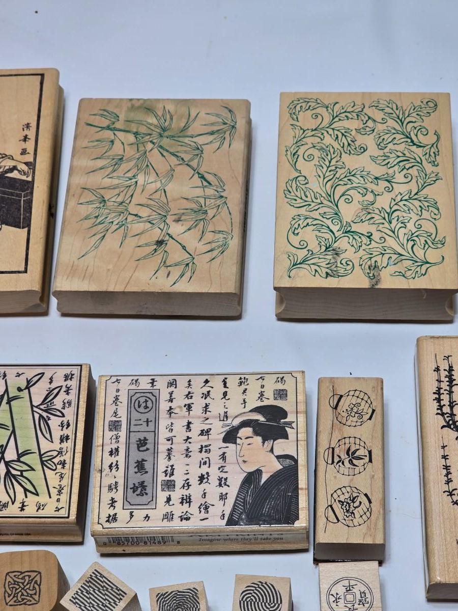 Stamps mounted on wood blocks - mostly Asian themed - bamboo - letters- and more