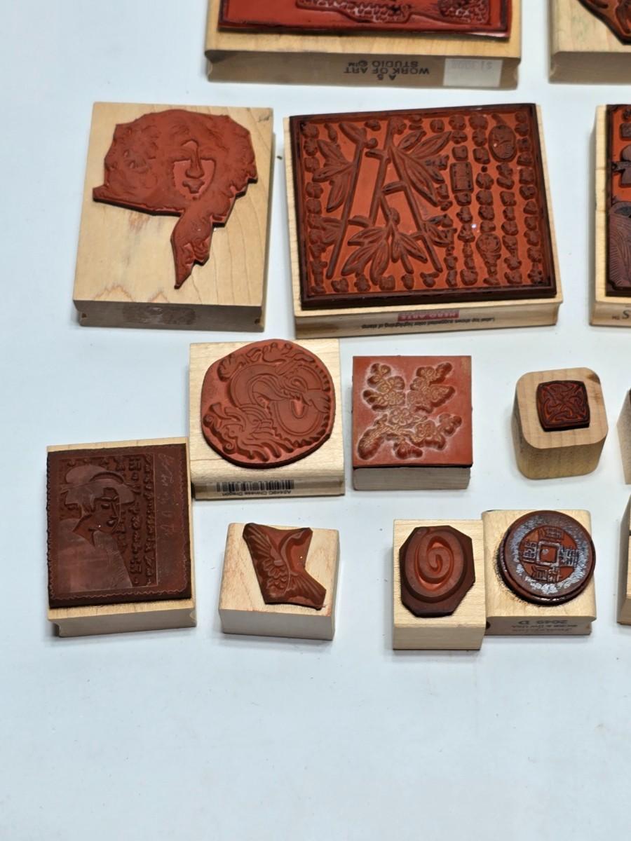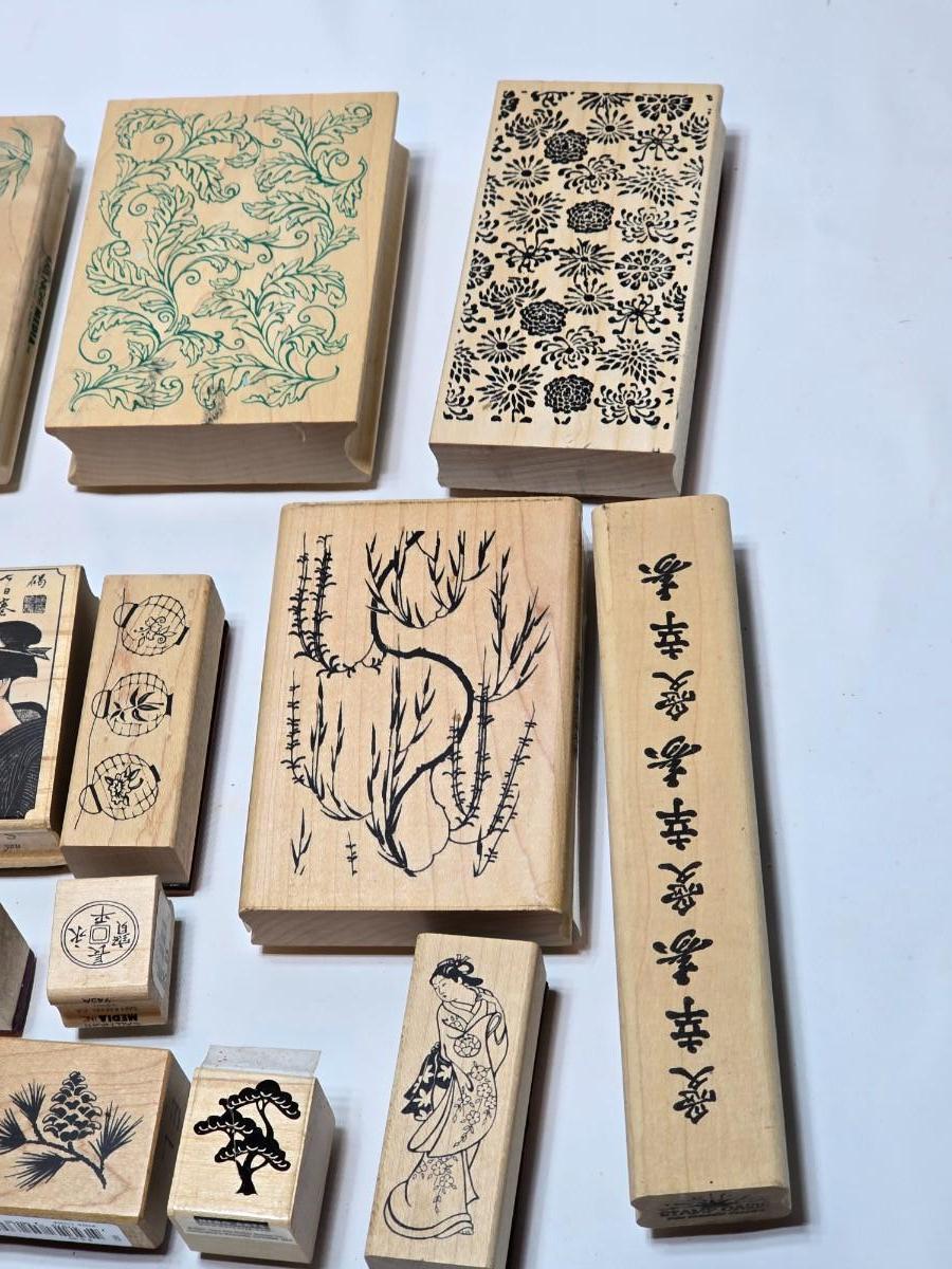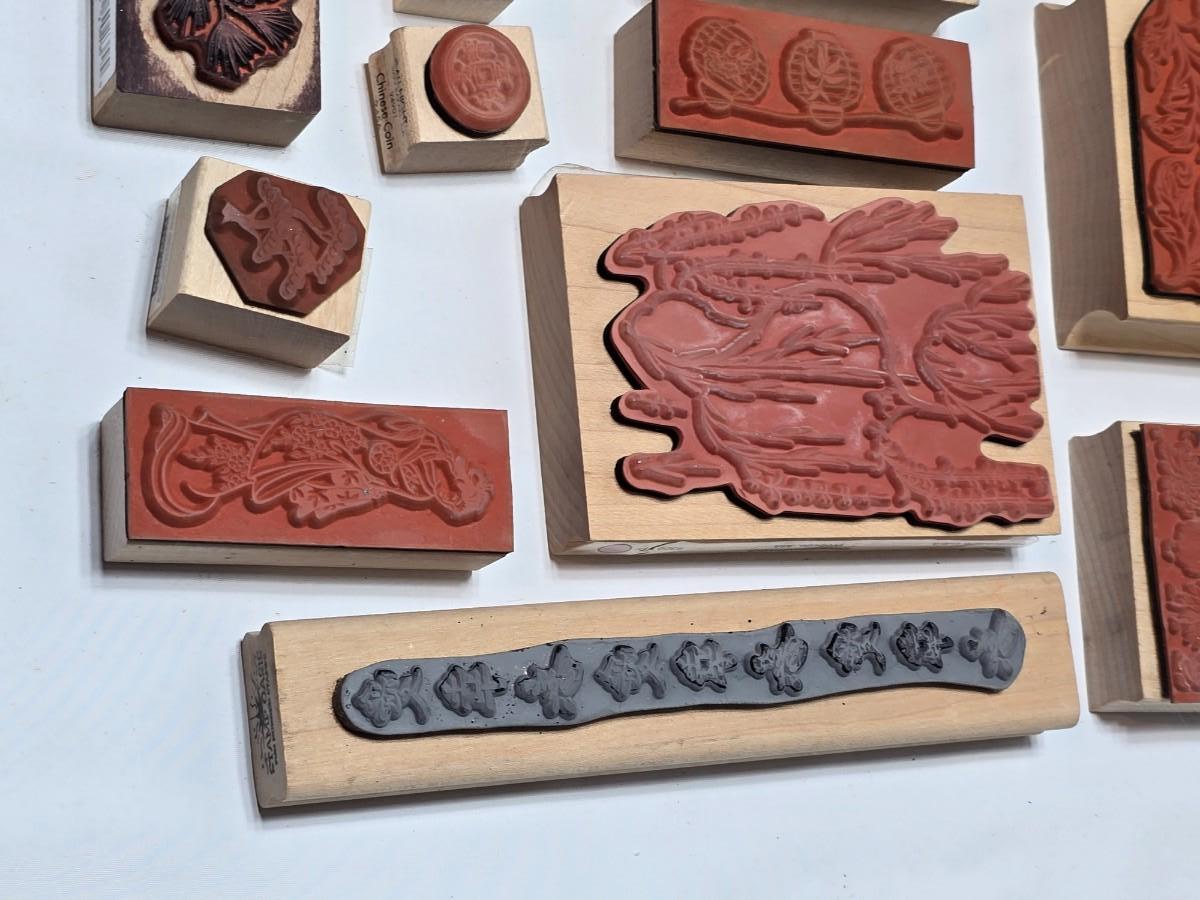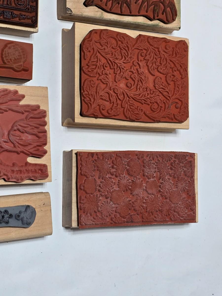 Stamps mounted on wood blocks - mostly Asian themed - bamboo - letters- and more