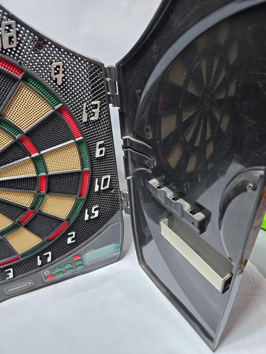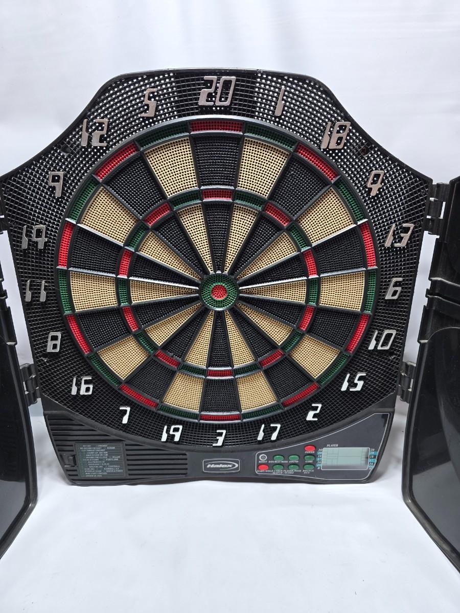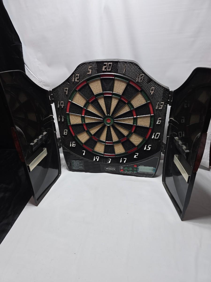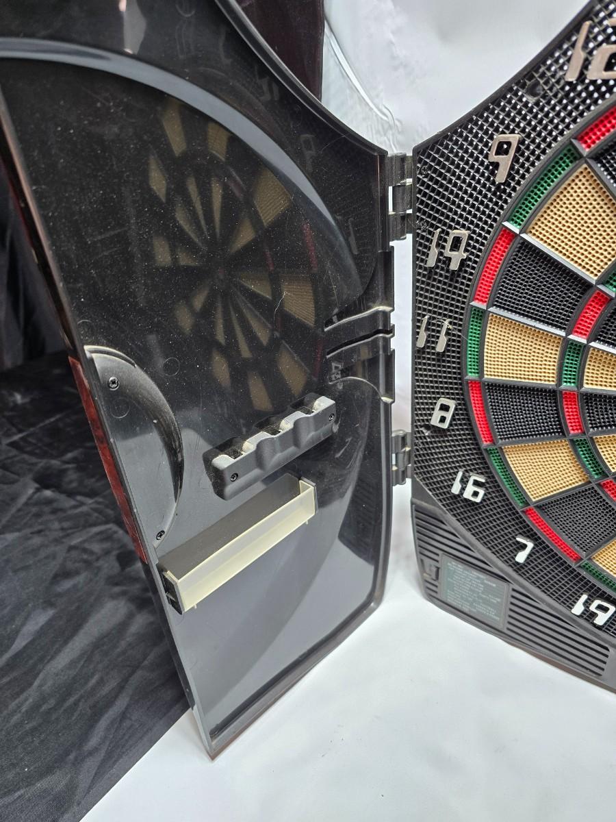 The dartboard is an electronic model, likely with a cabinet that can be closed for storage. These types of dartboards often feature multiple games and scoring options for several players. They are typically designed for indoor use - DC 9-volt cord not included