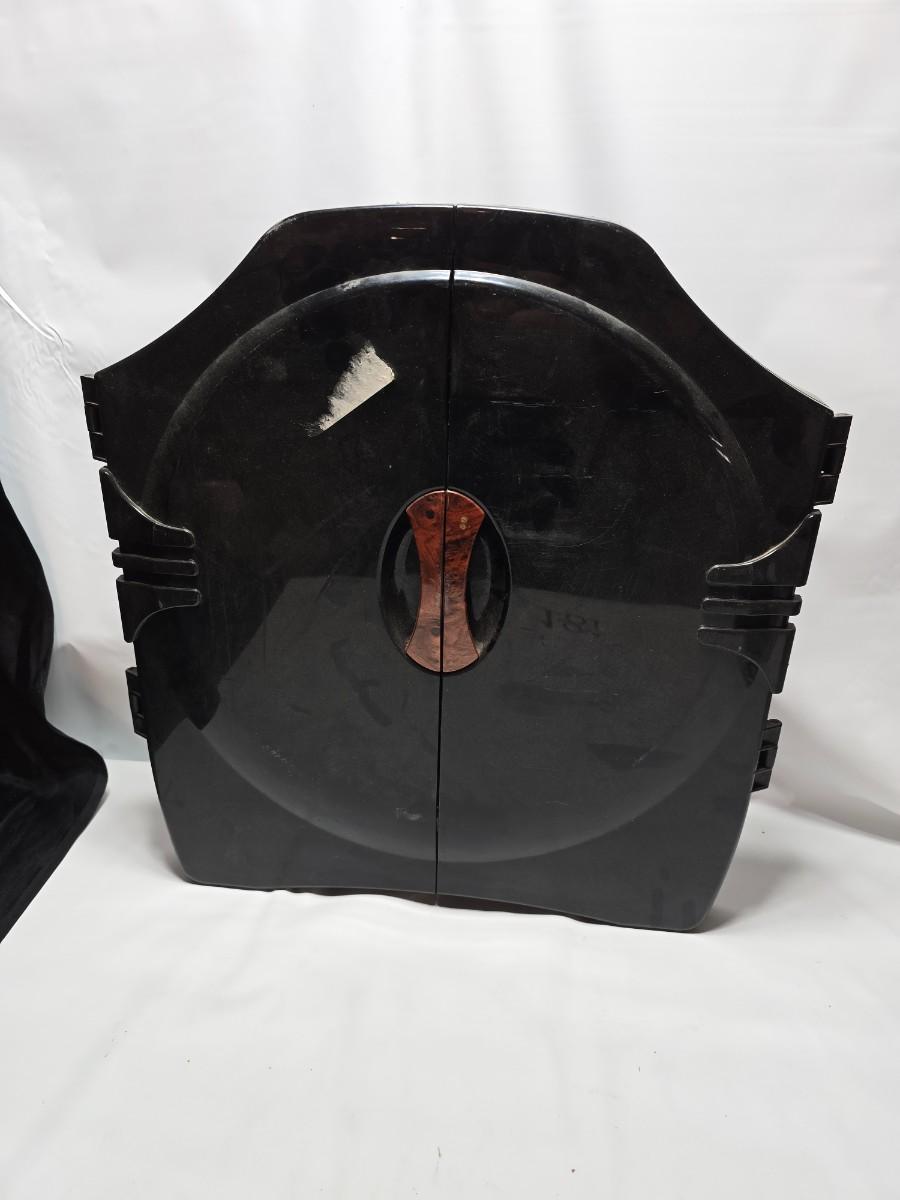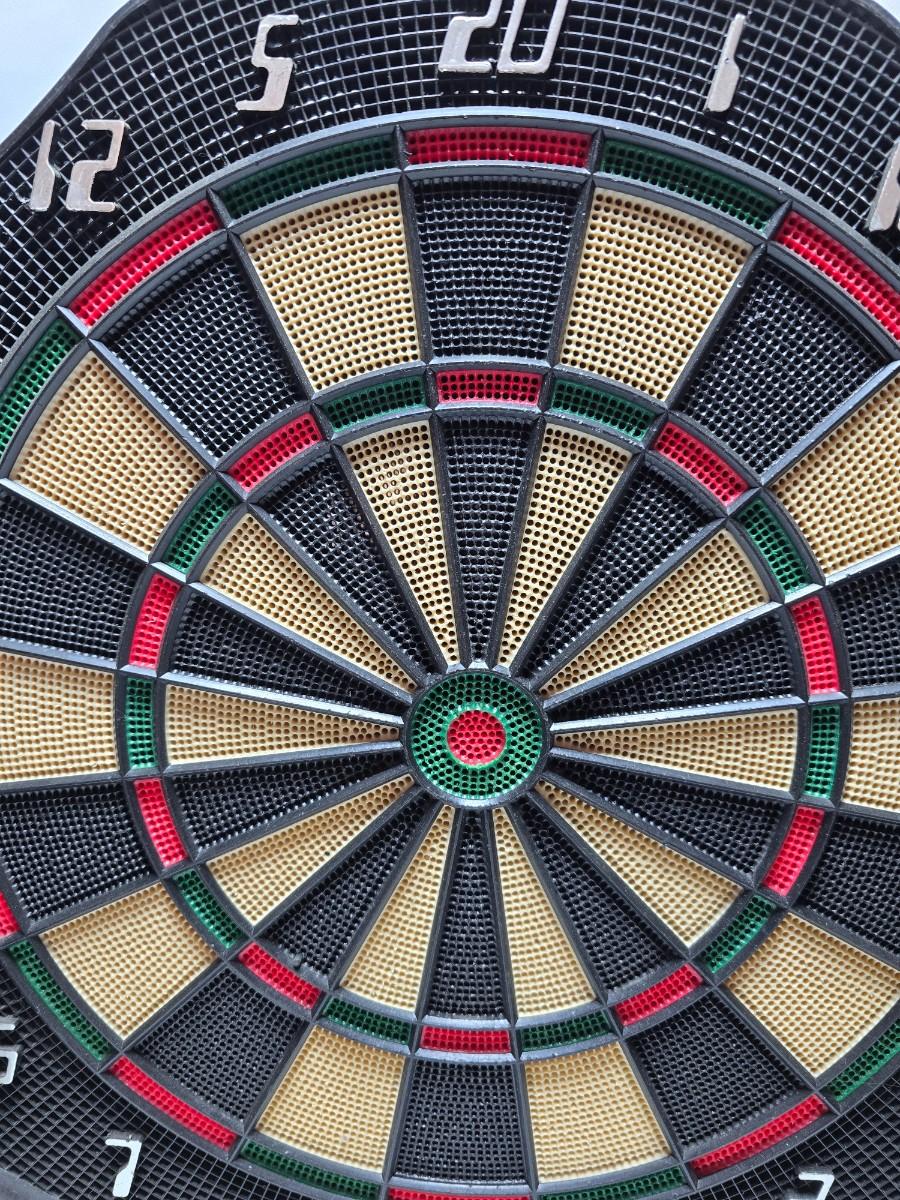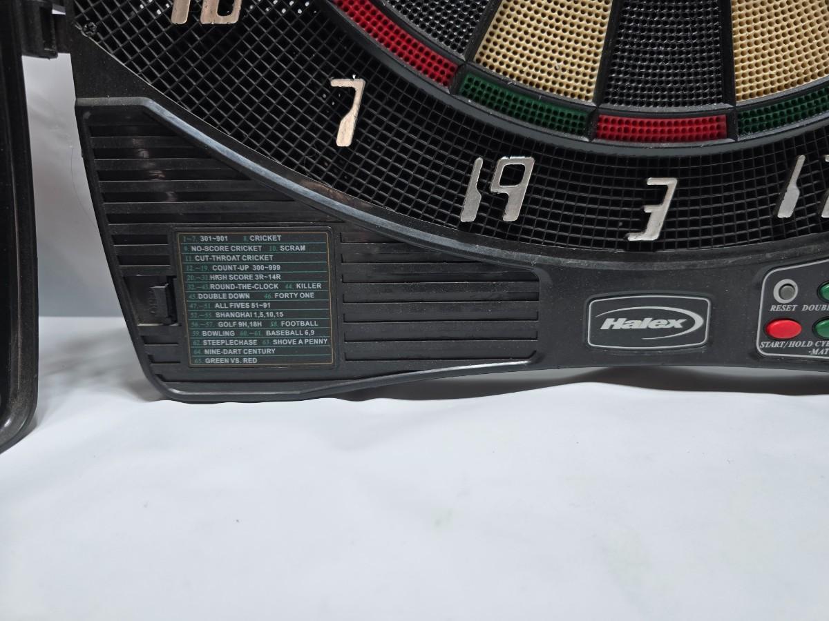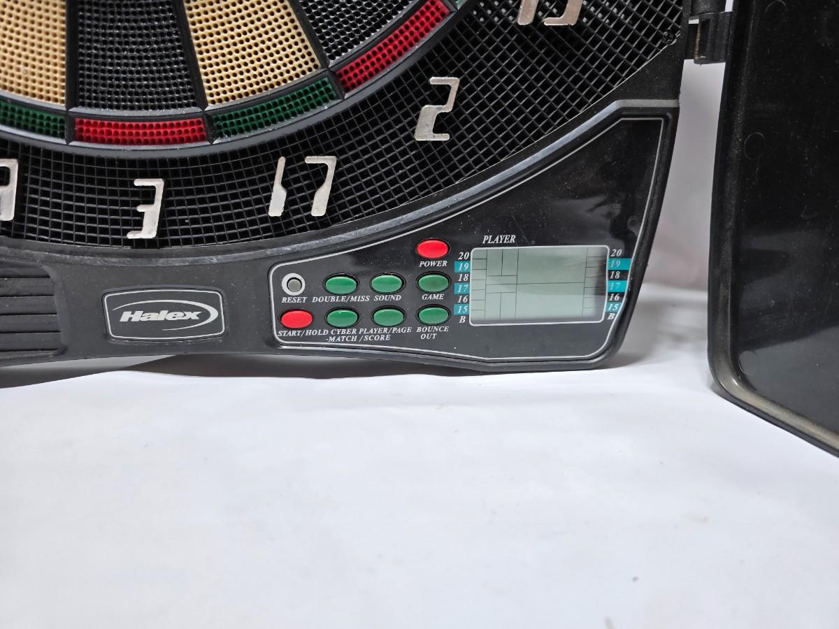 The dartboard is an electronic model, likely with a cabinet that can be closed for storage. These types of dartboards often feature multiple games and scoring options for several players. They are typically designed for indoor use - DC 9-volt cord not included