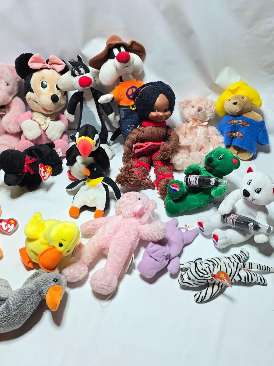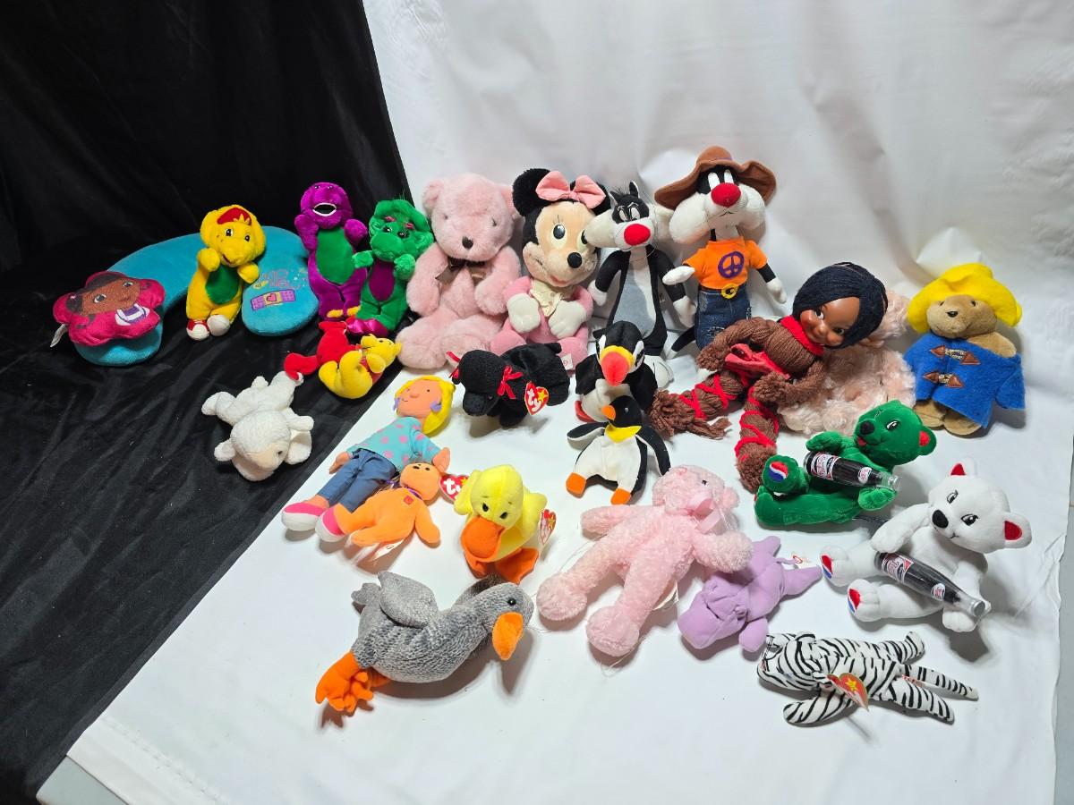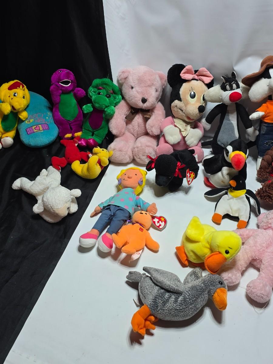 Huge assortment of plush characters - Disney - Looney toons - Barney % friends - animals - Ty and more