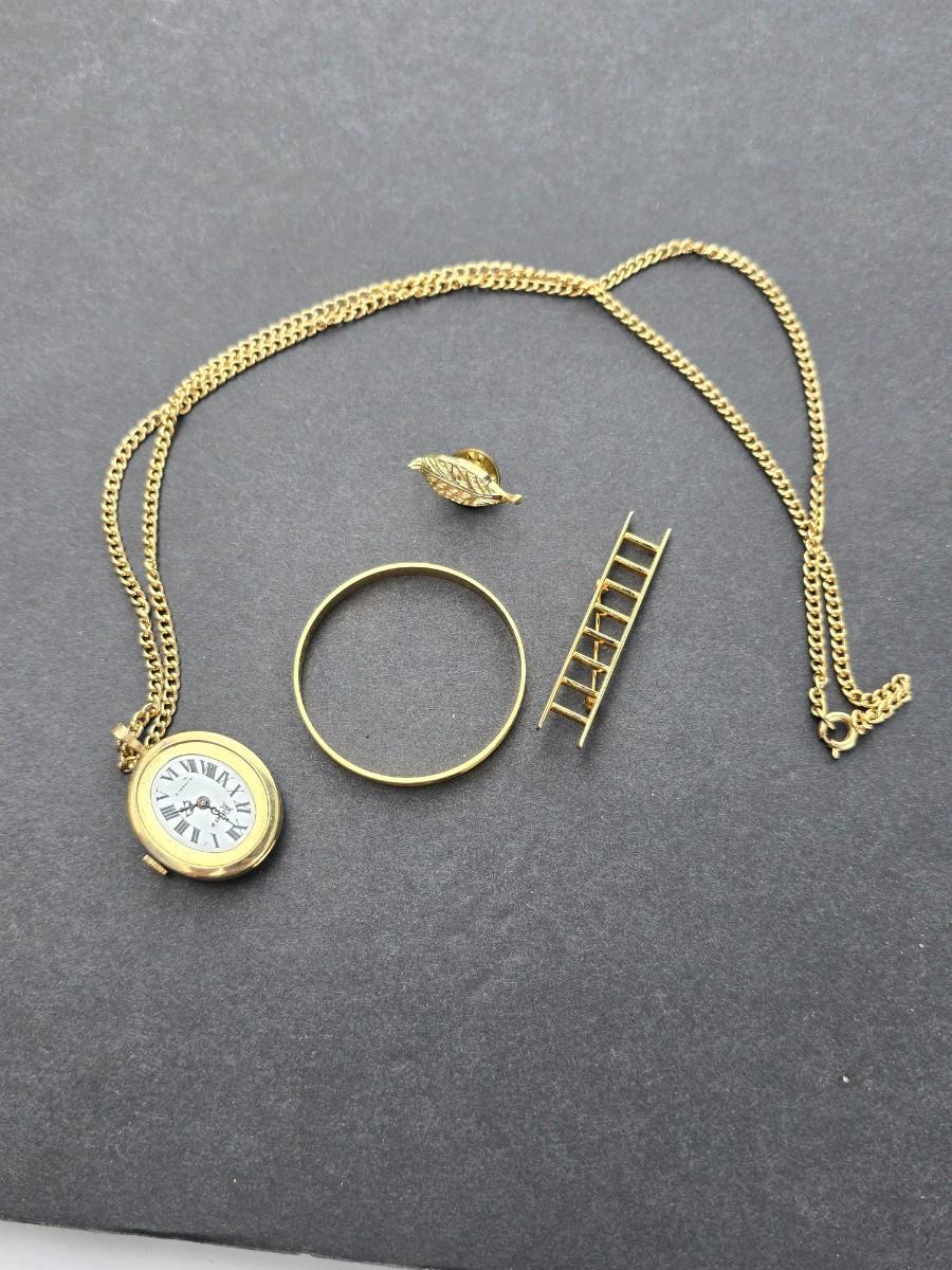 1970's Mary Kay ladder of success brooch - gold leaf lapel pin - watch necklace and a golden scarf ring