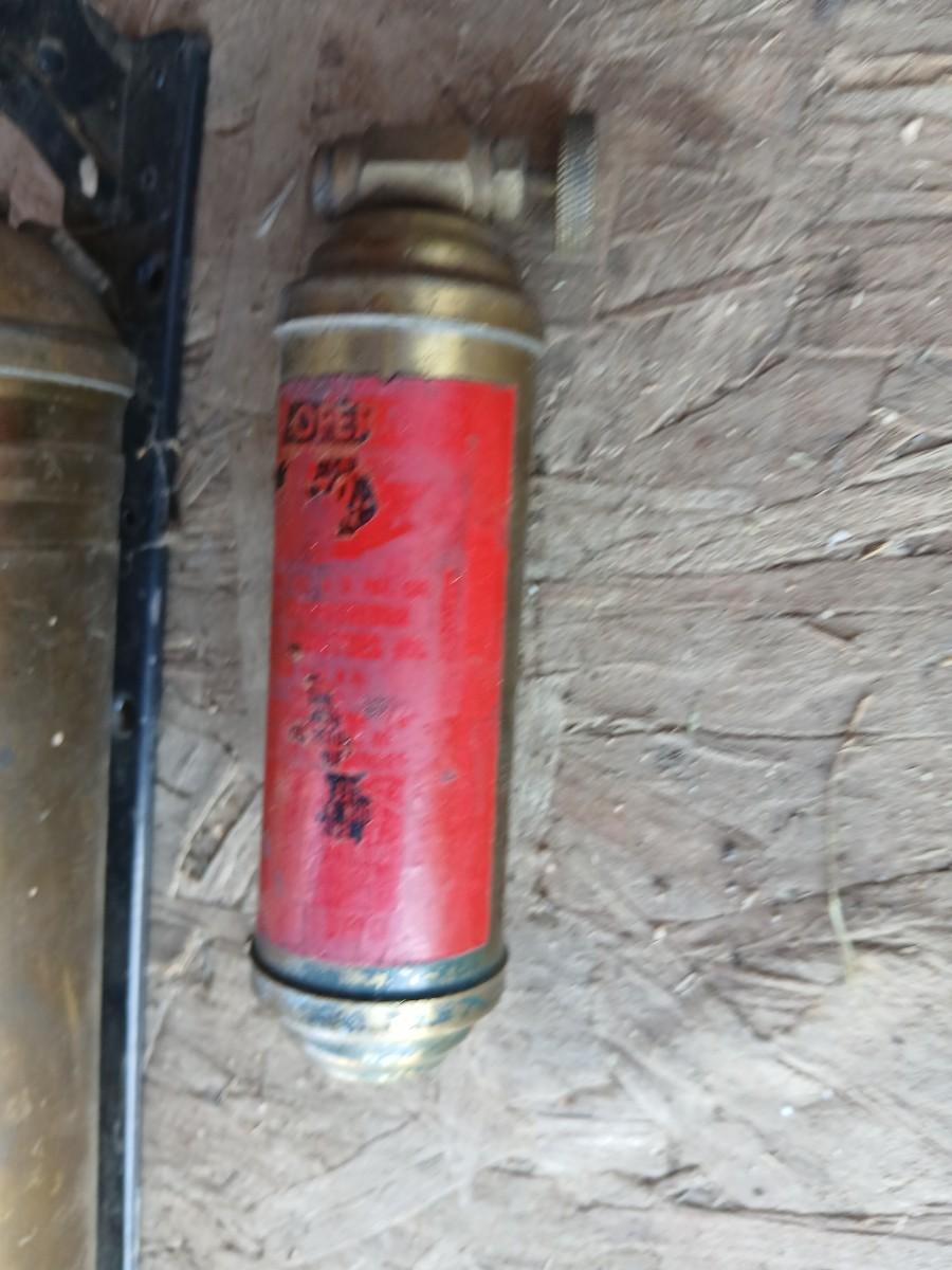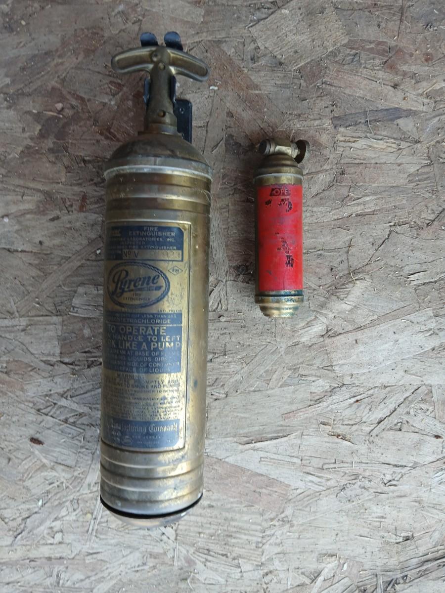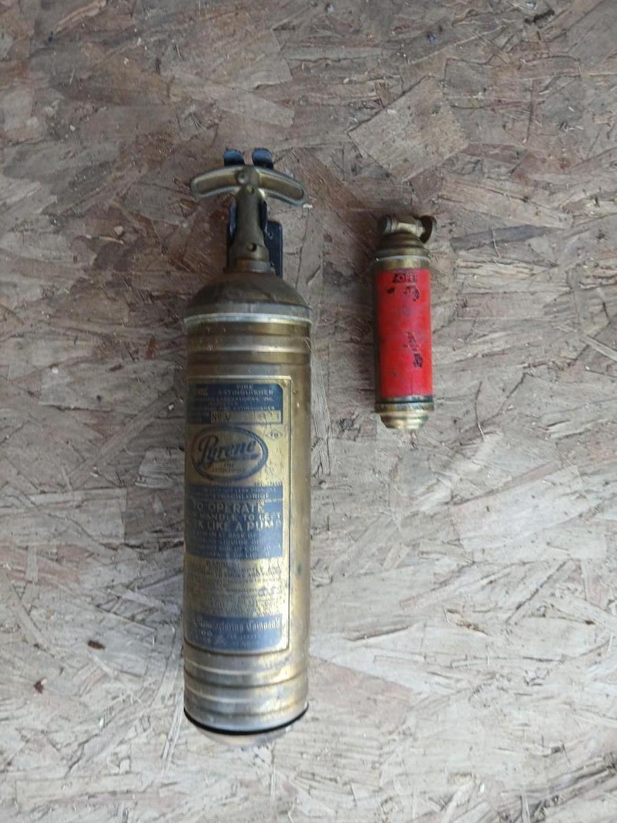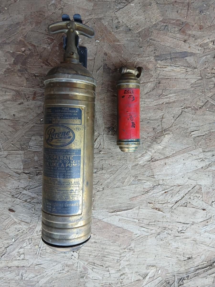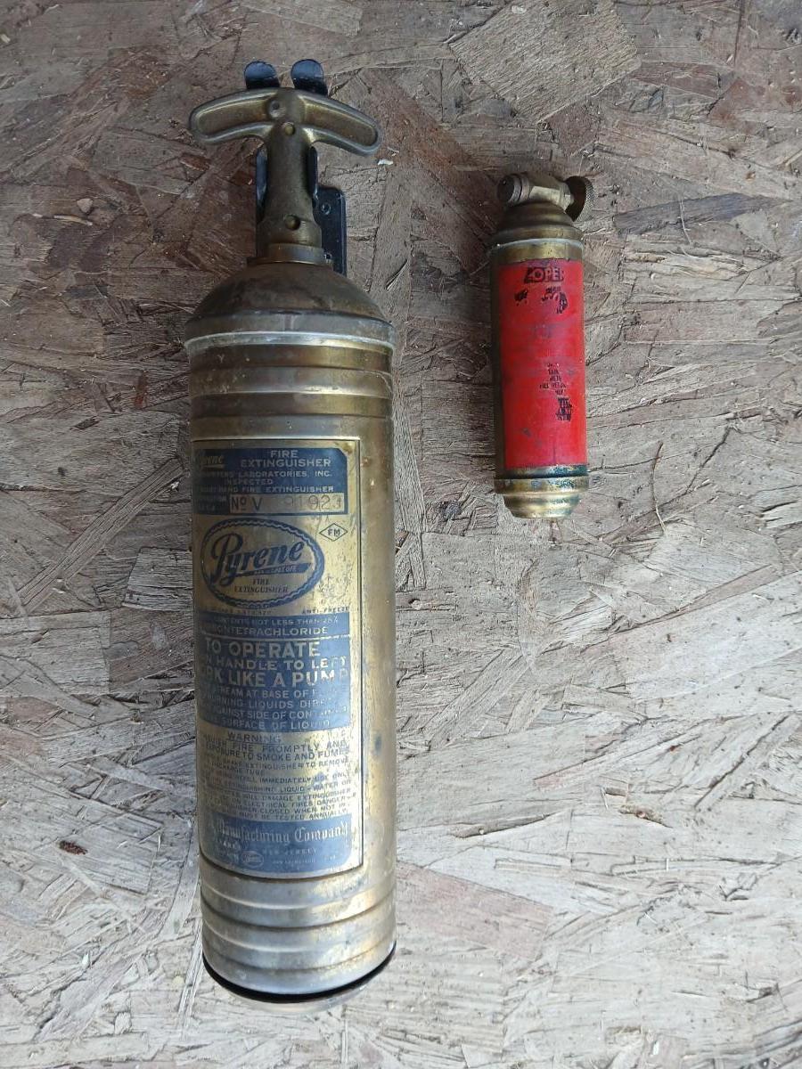 Vintage brass Fire Extinguishers - Pyrene manufacturing - and vintage Presto CB motorcycle fire extinguisher