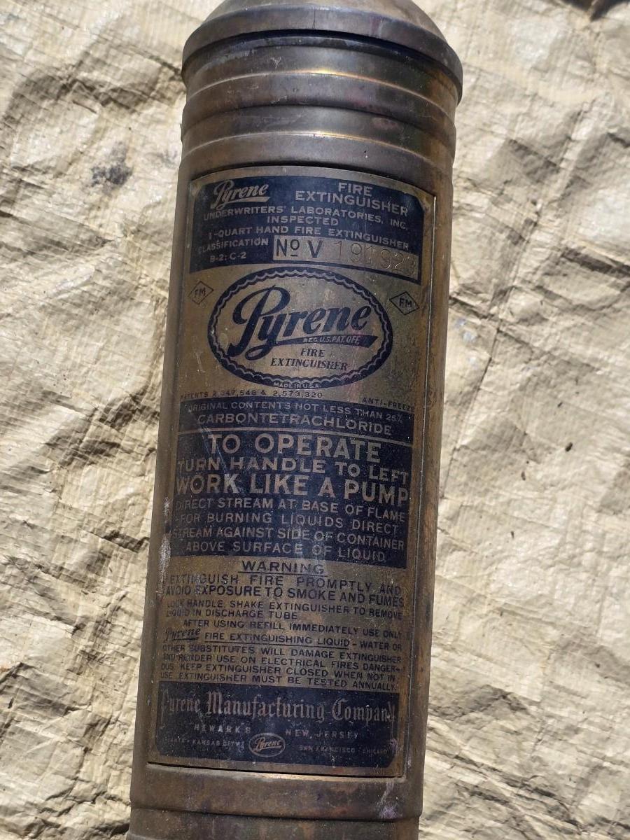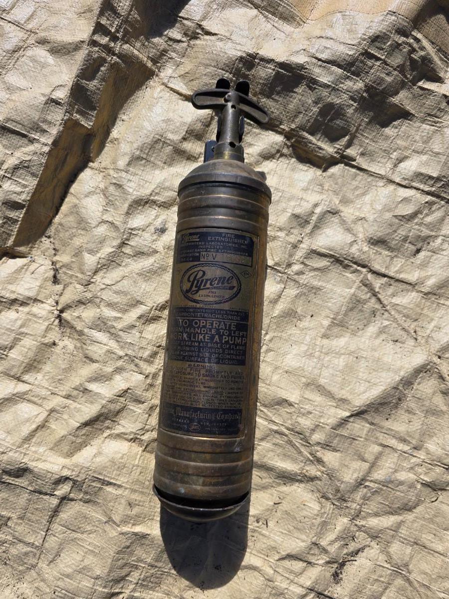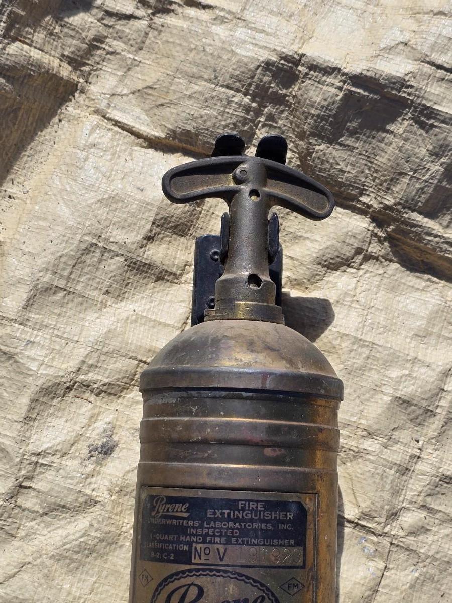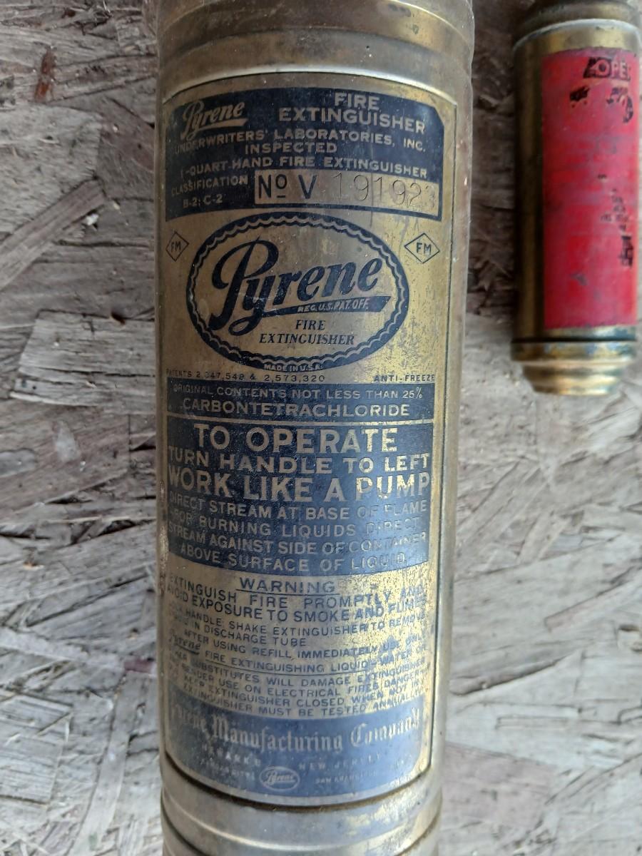 Vintage brass Fire Extinguishers - Pyrene manufacturing - and vintage Presto CB motorcycle fire extinguisher