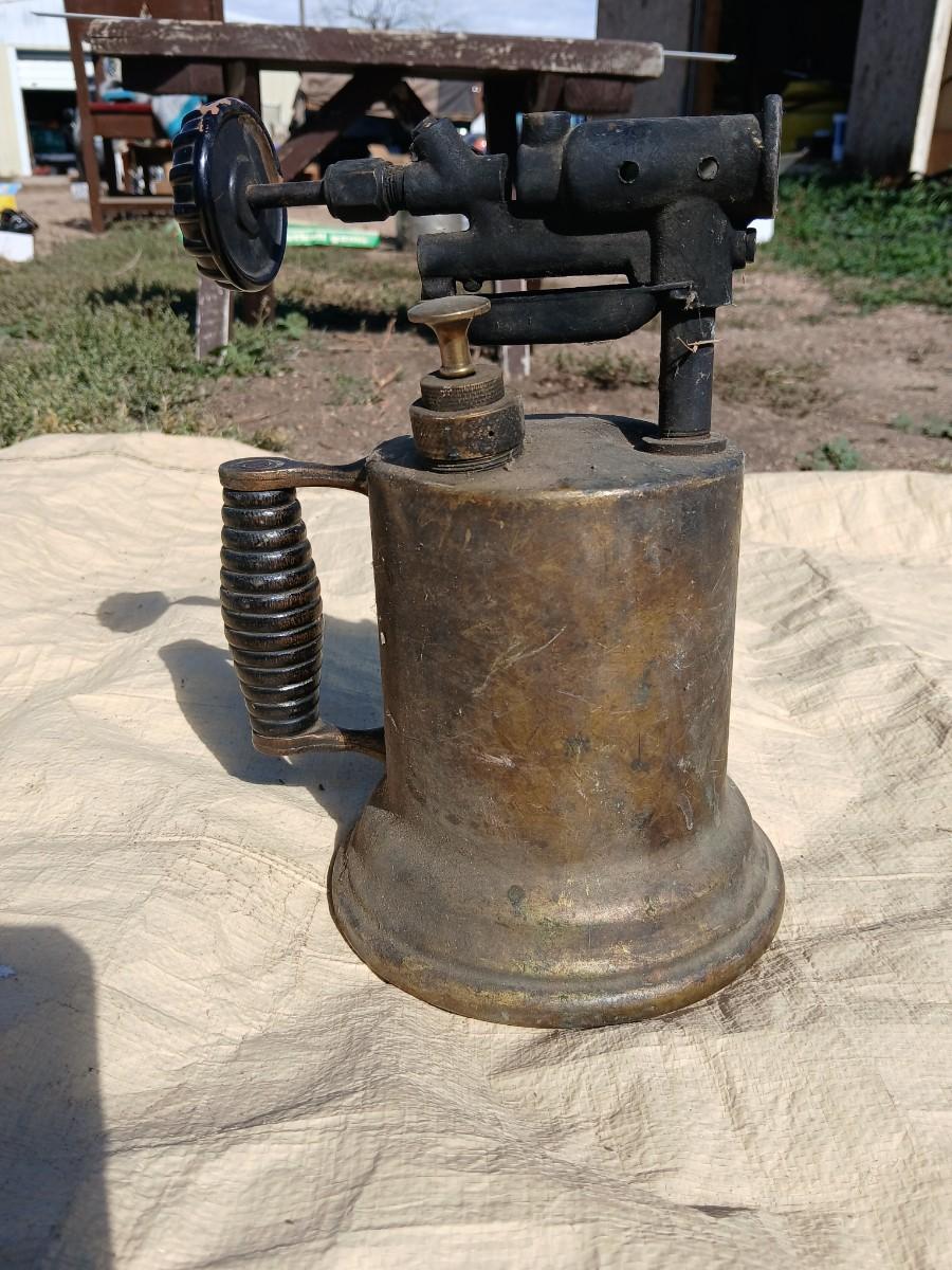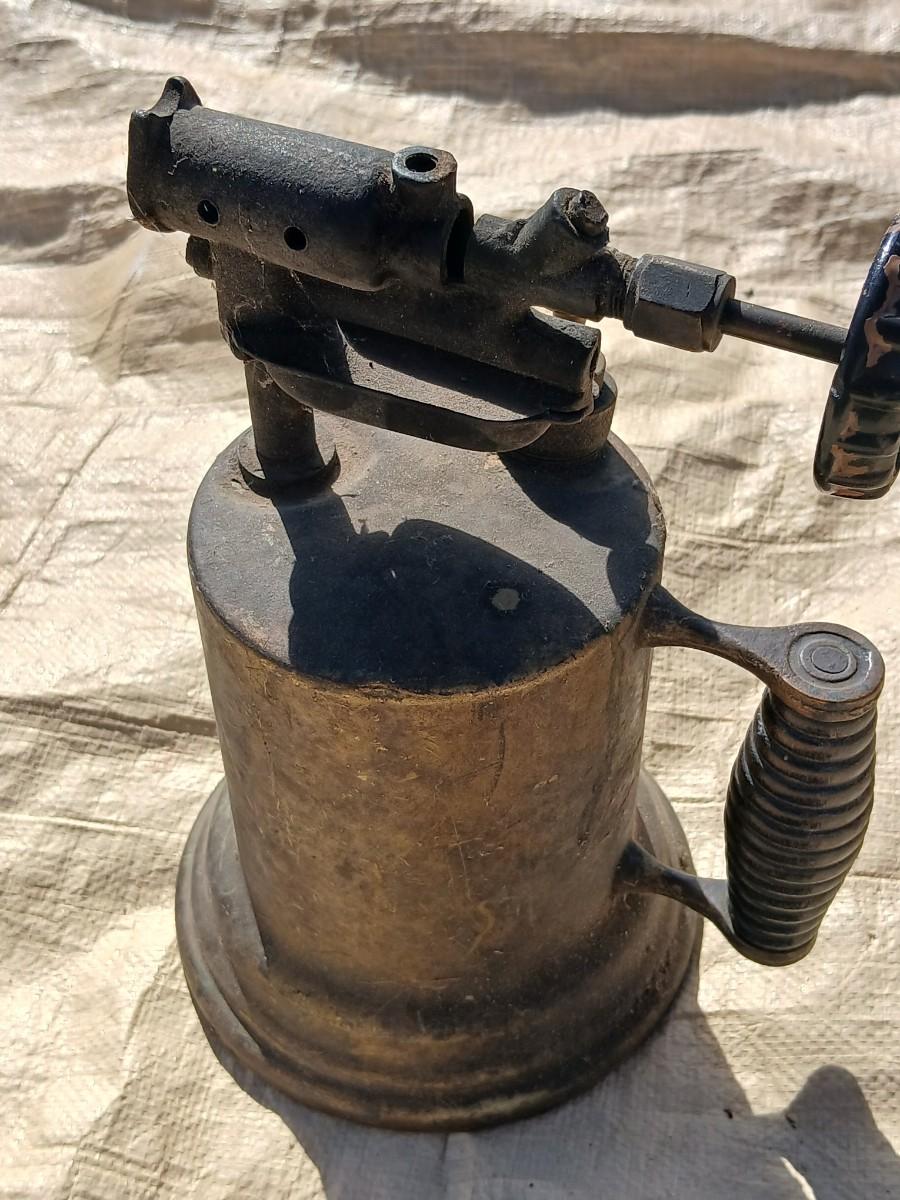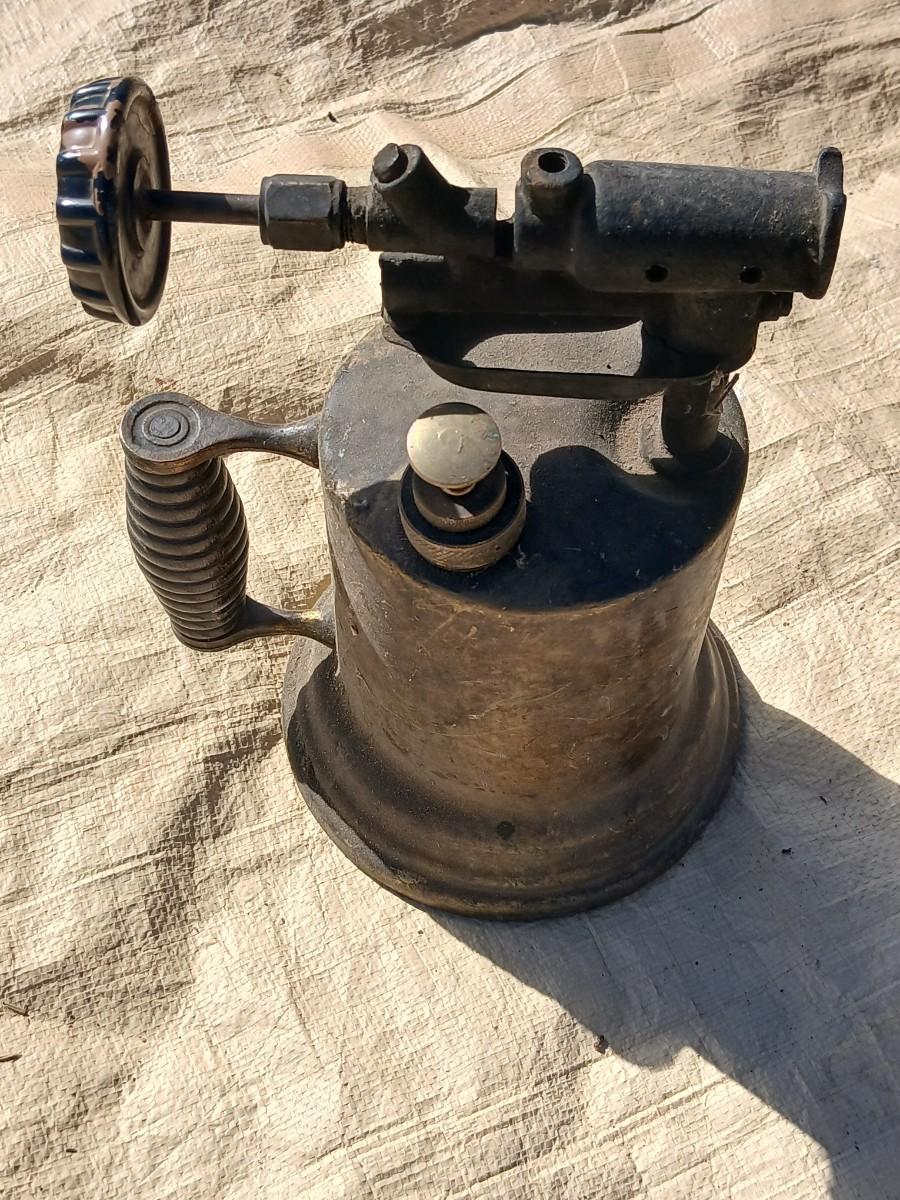 Antique Brass blow torch with wooden rustic handle Unrestored blow torch