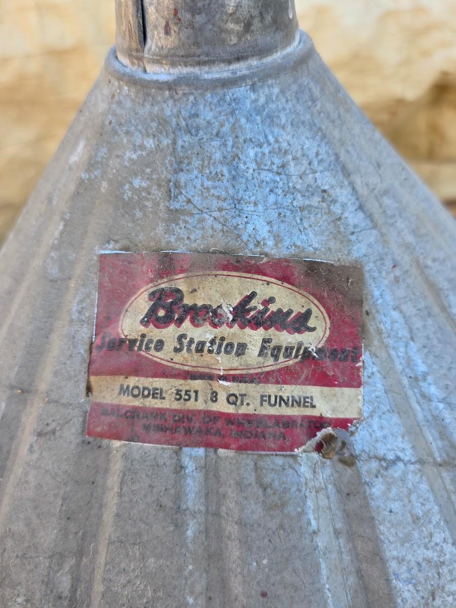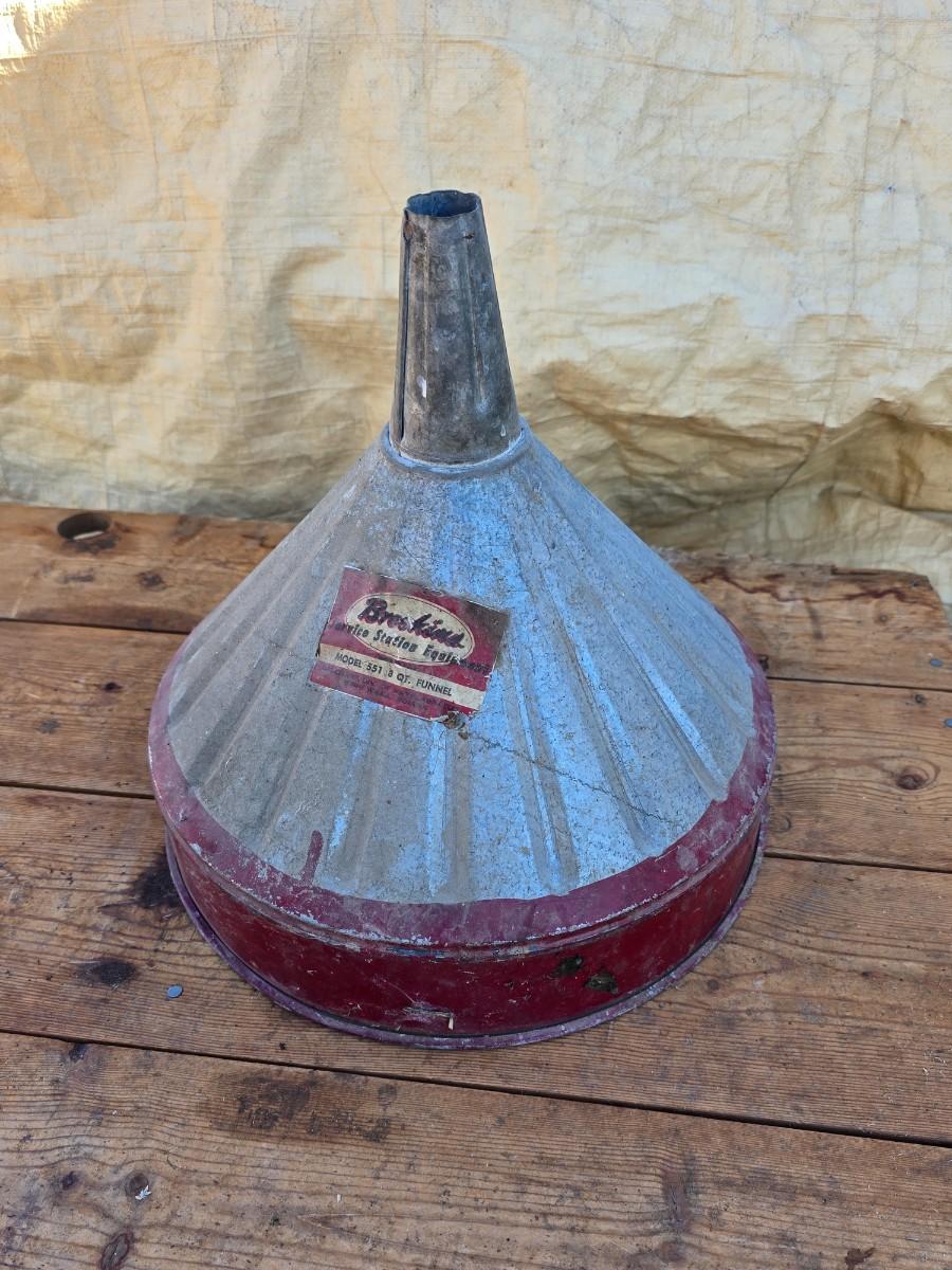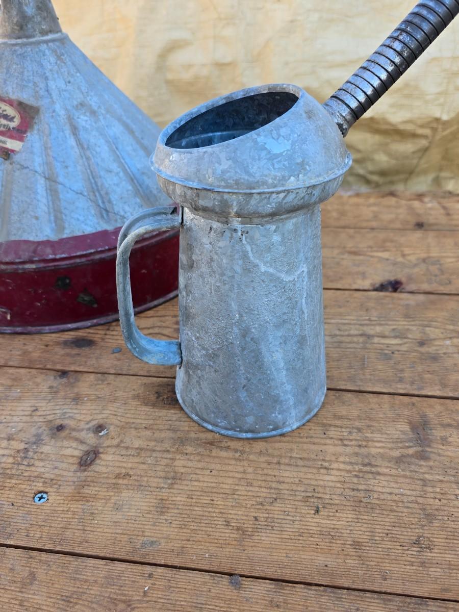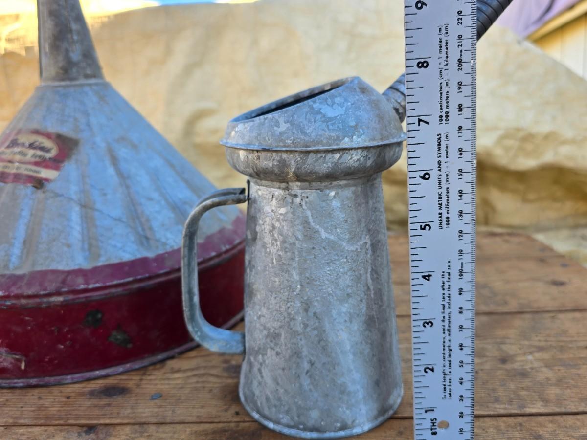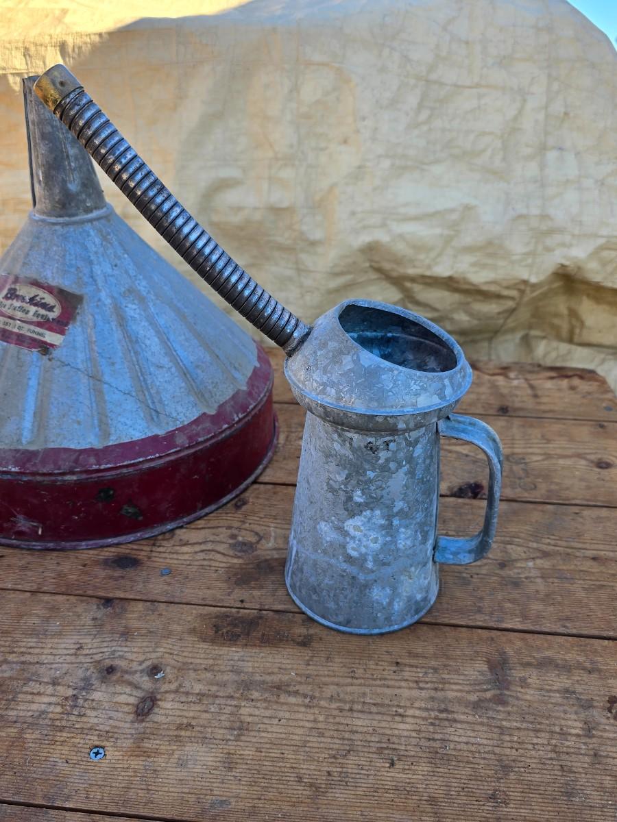 Vintage Brookins service station 8 Qt. metal funnel with metal oil can and a spout