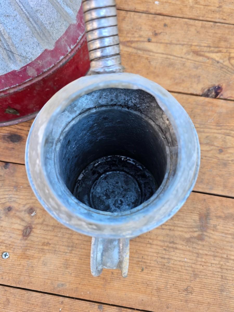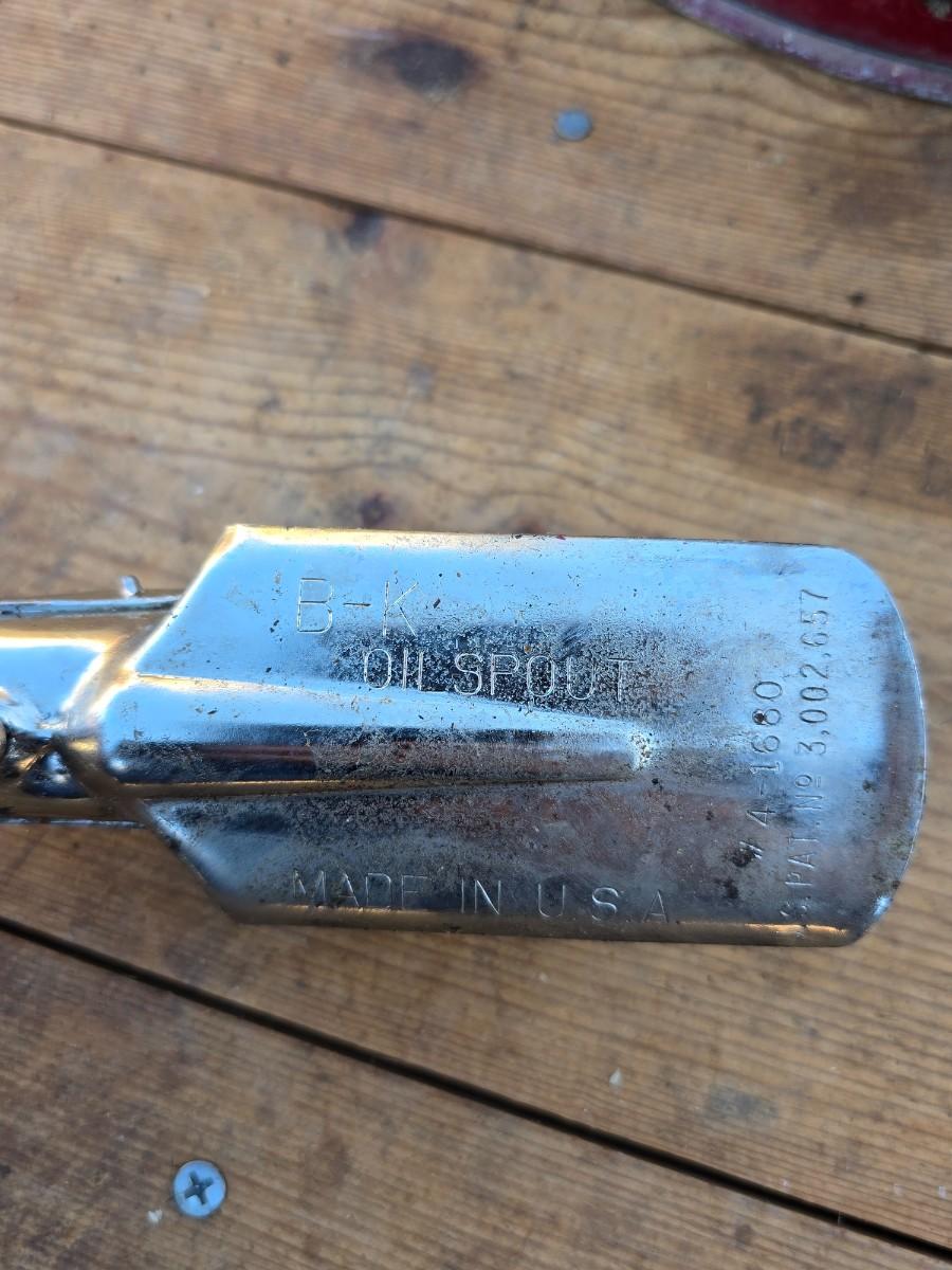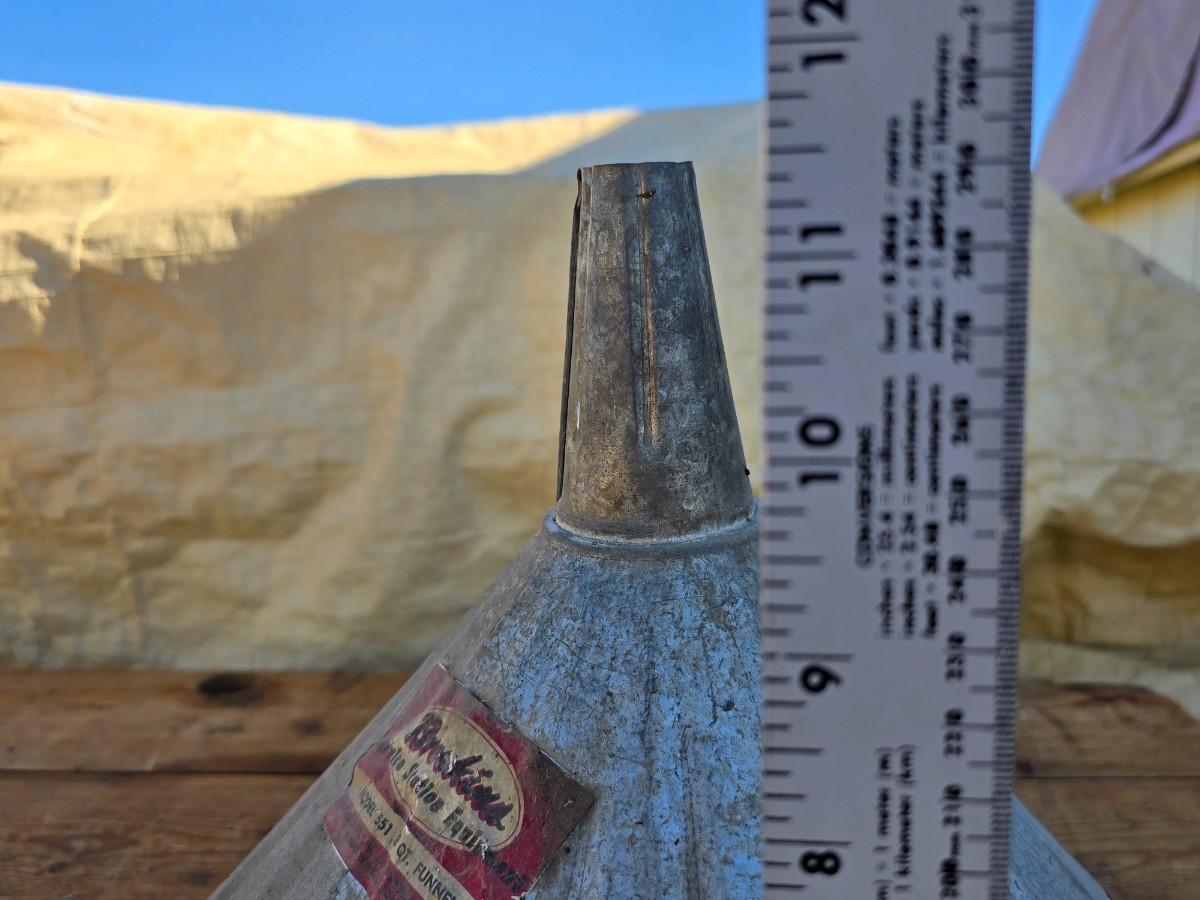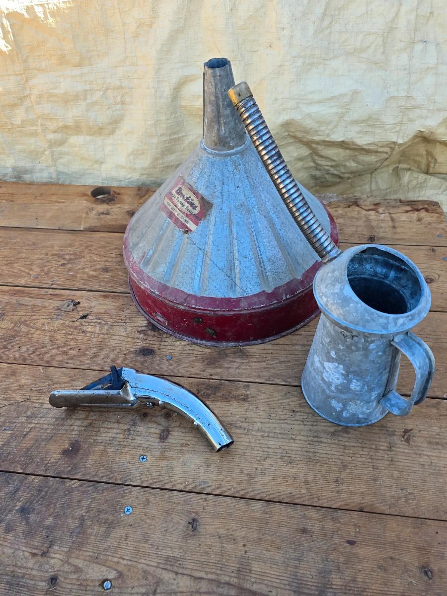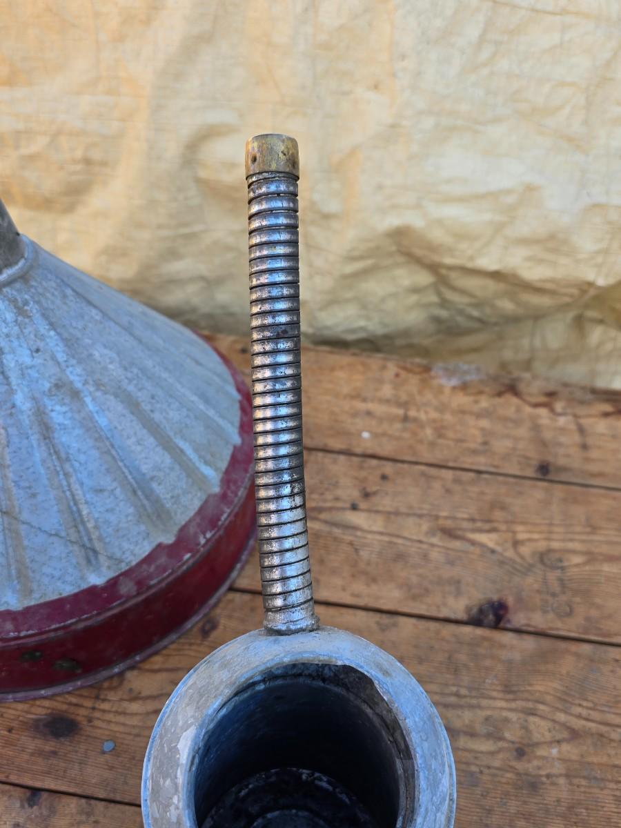 Vintage Brookins service station 8 Qt. metal funnel with metal oil can and a spout
