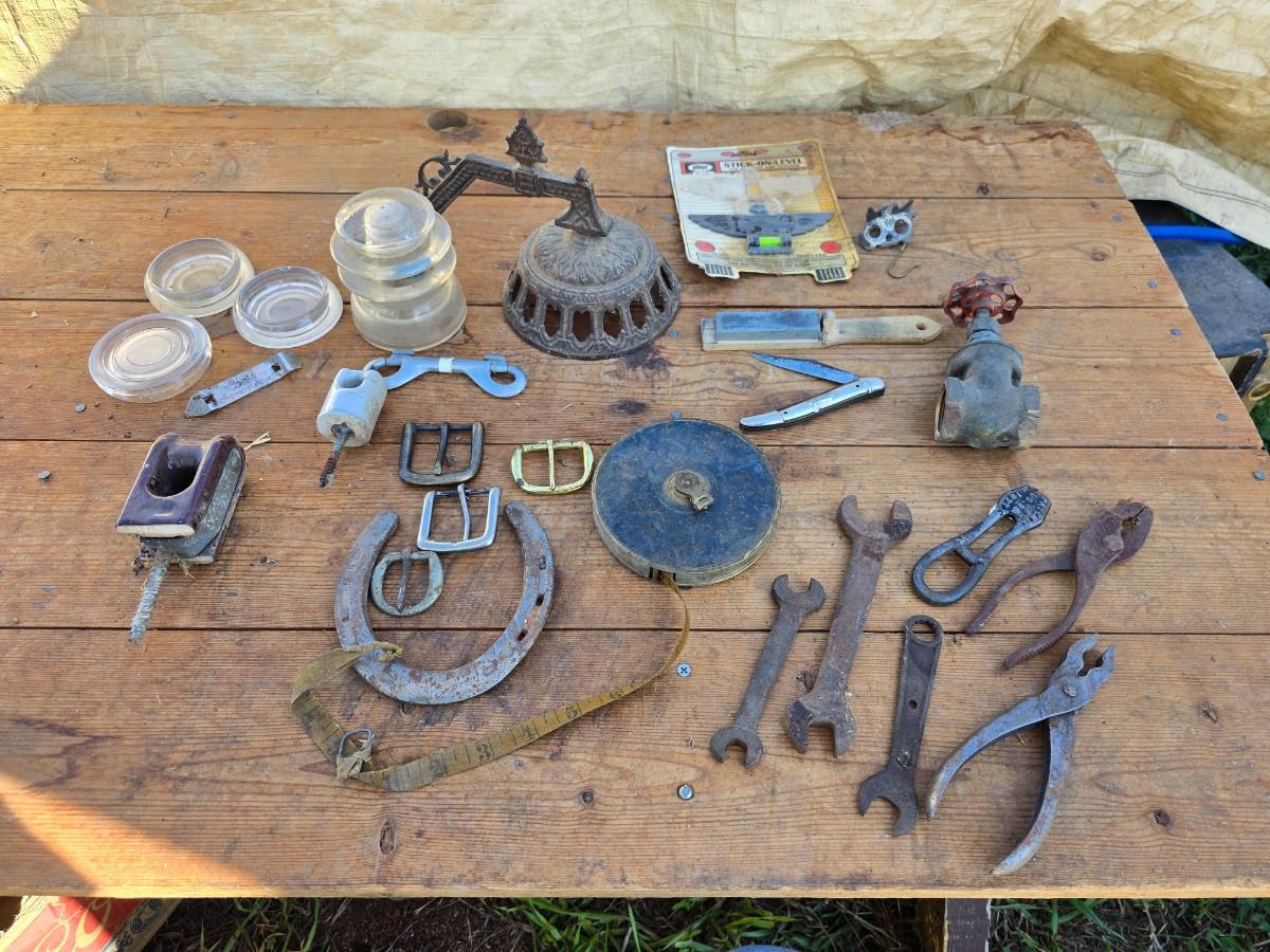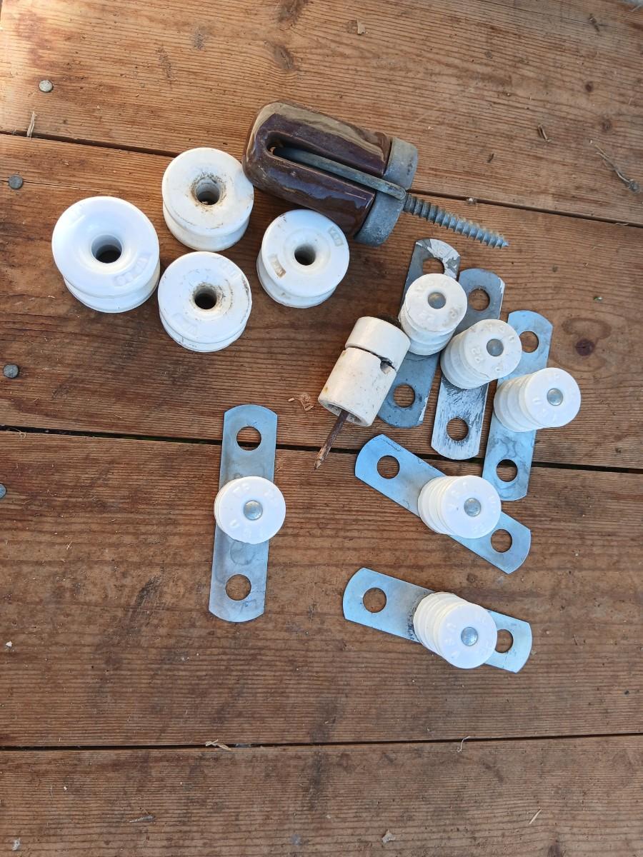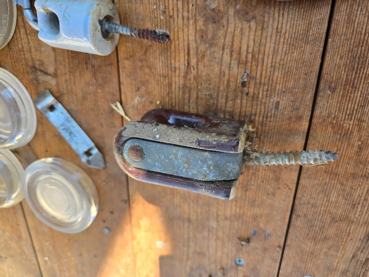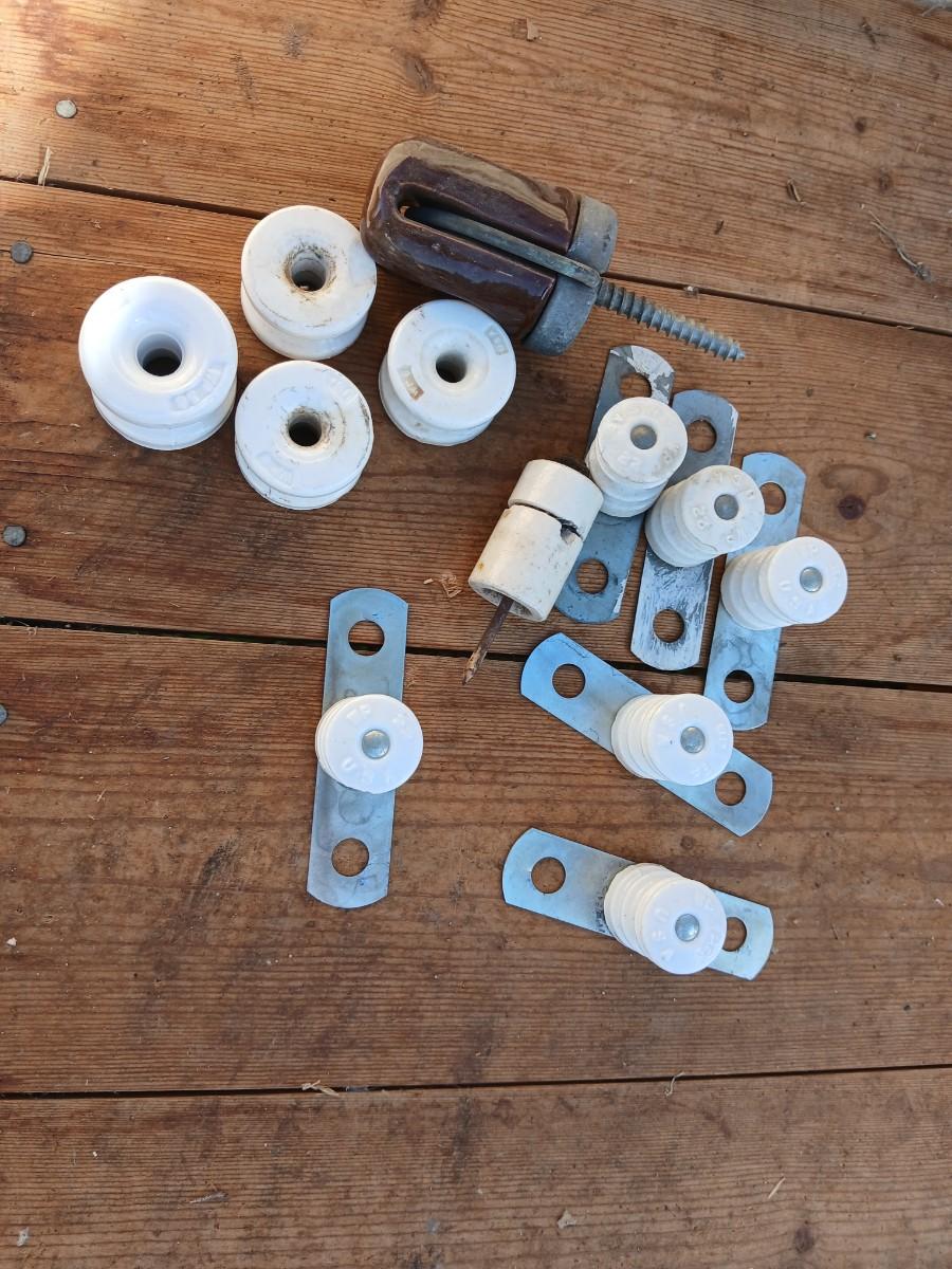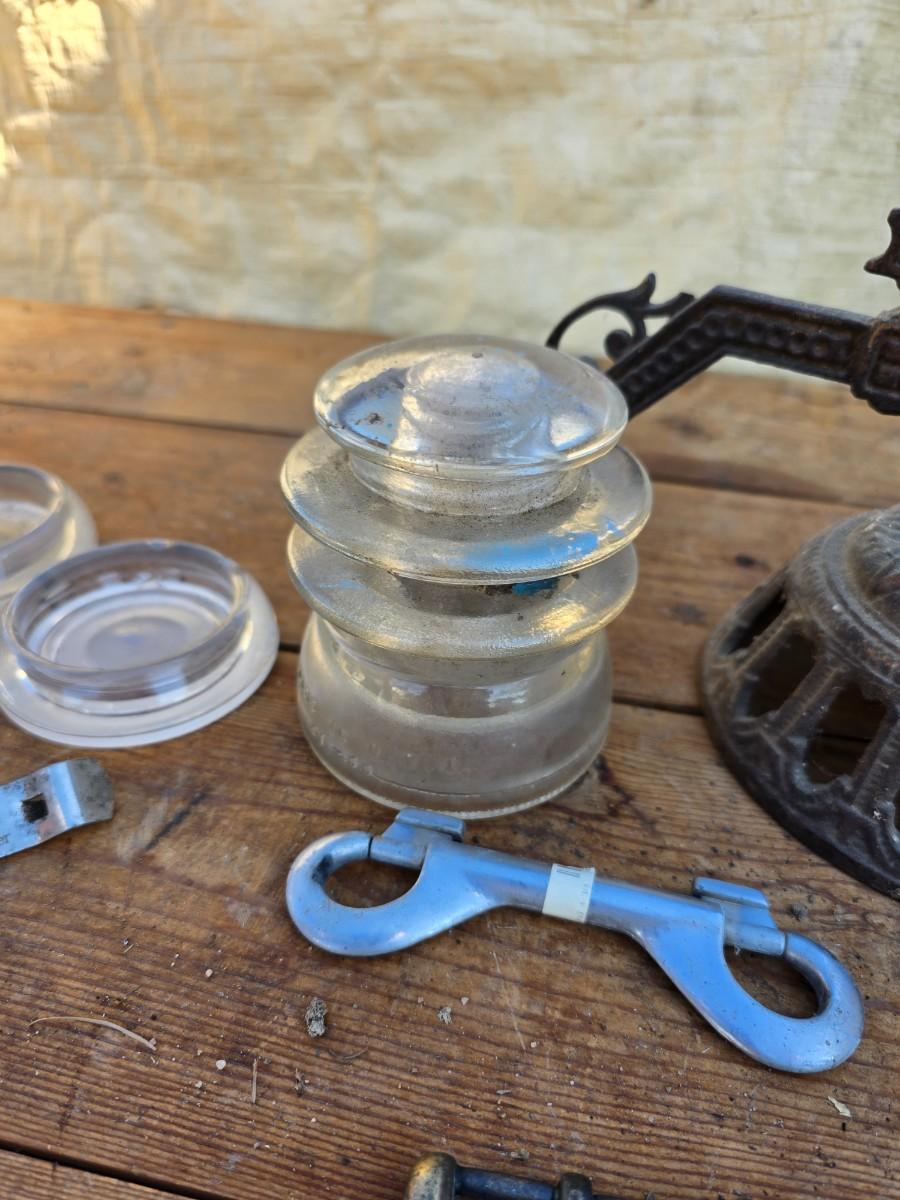Antique porcelain insulators - cast iron - wrenches - and other rustic farm items for the side of the farm shed!