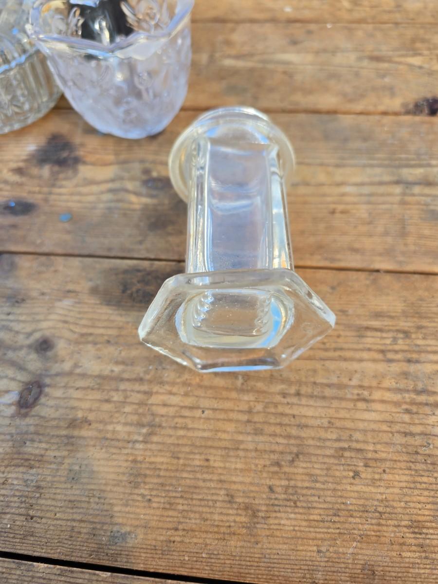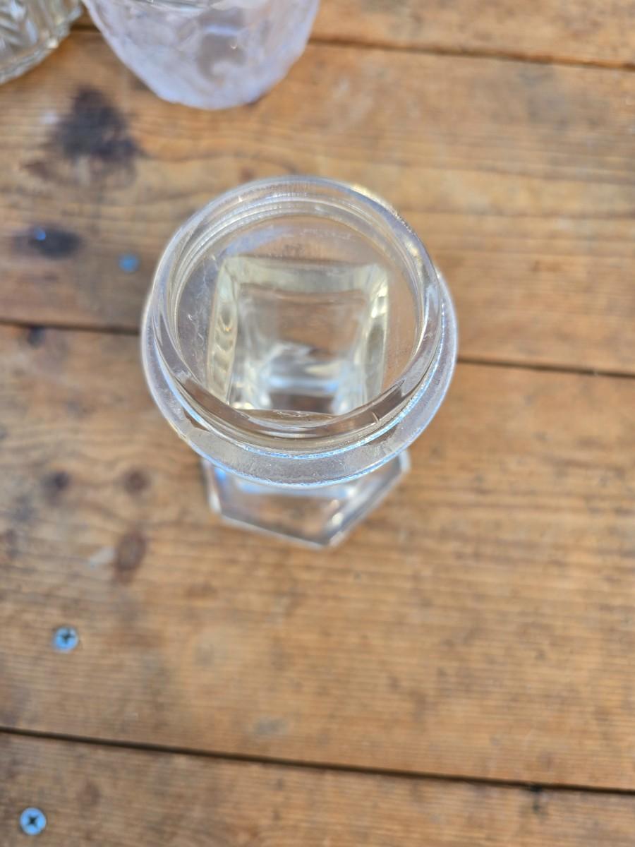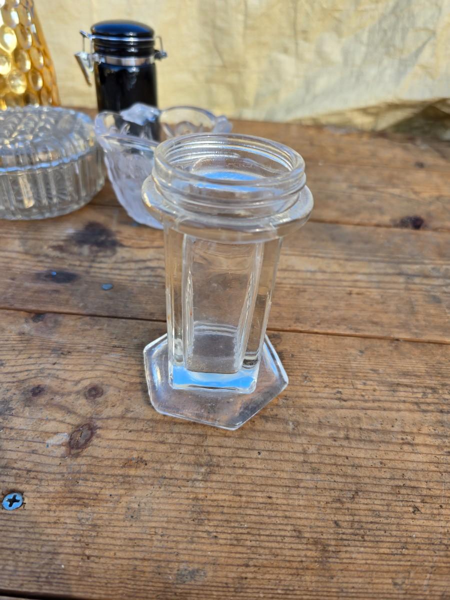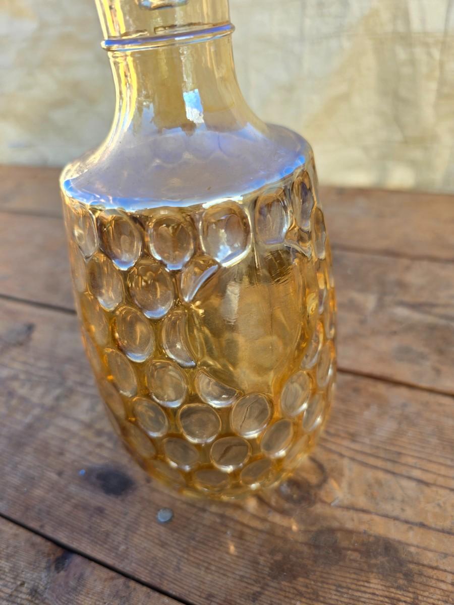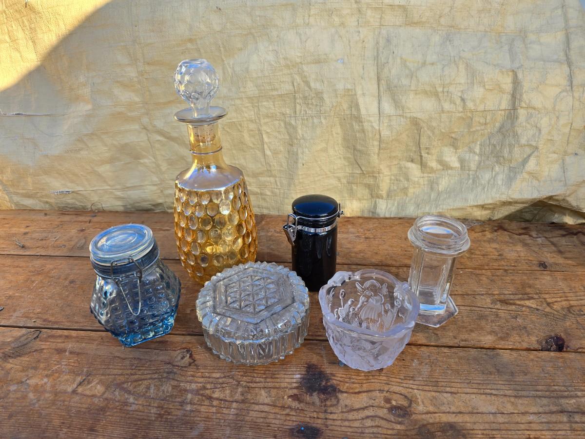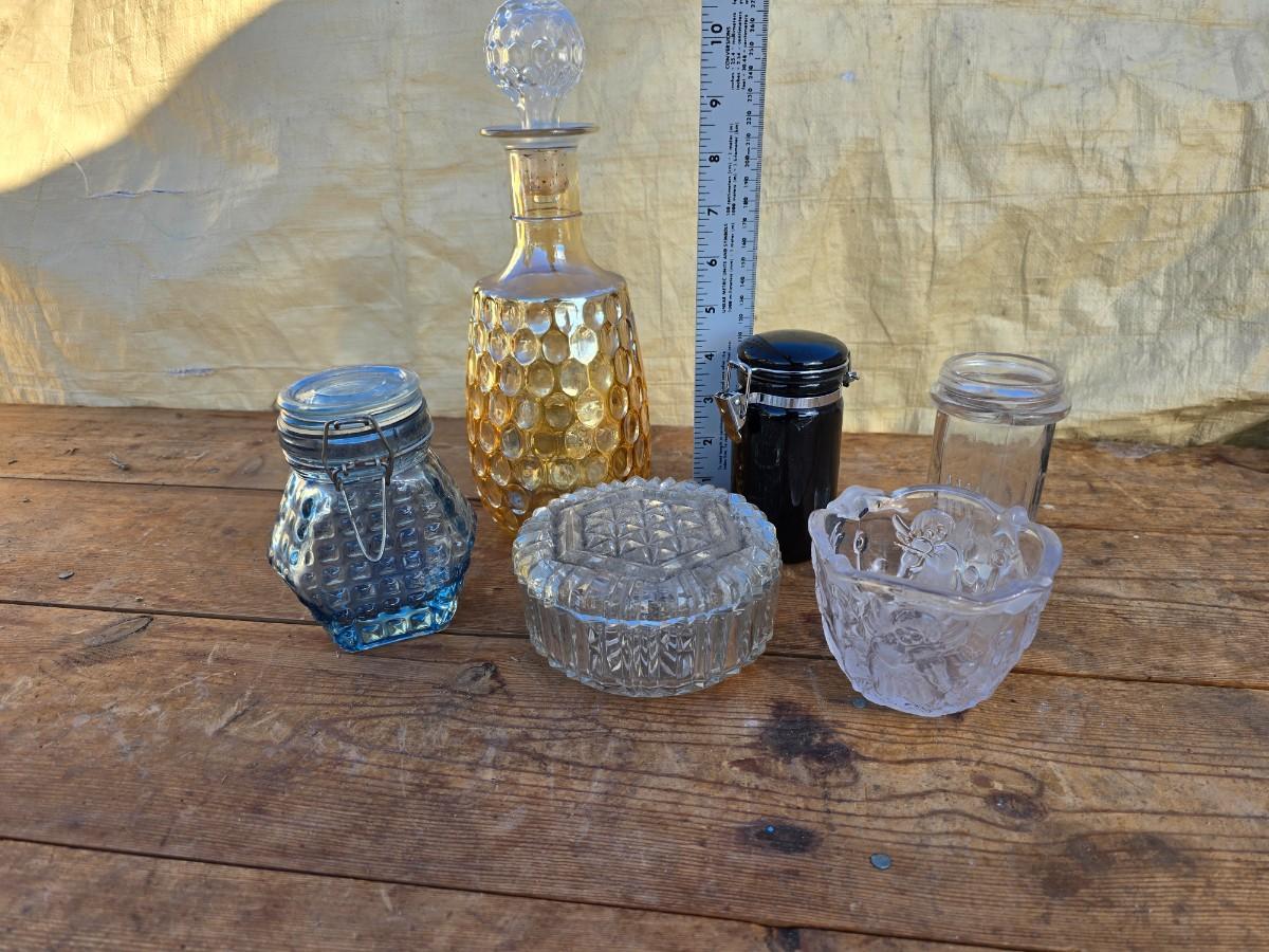 Collection of glassware - MCM Forester Marigold carnival glass decanter - Coplin style glass staining jar - assortment of other jars and dishes