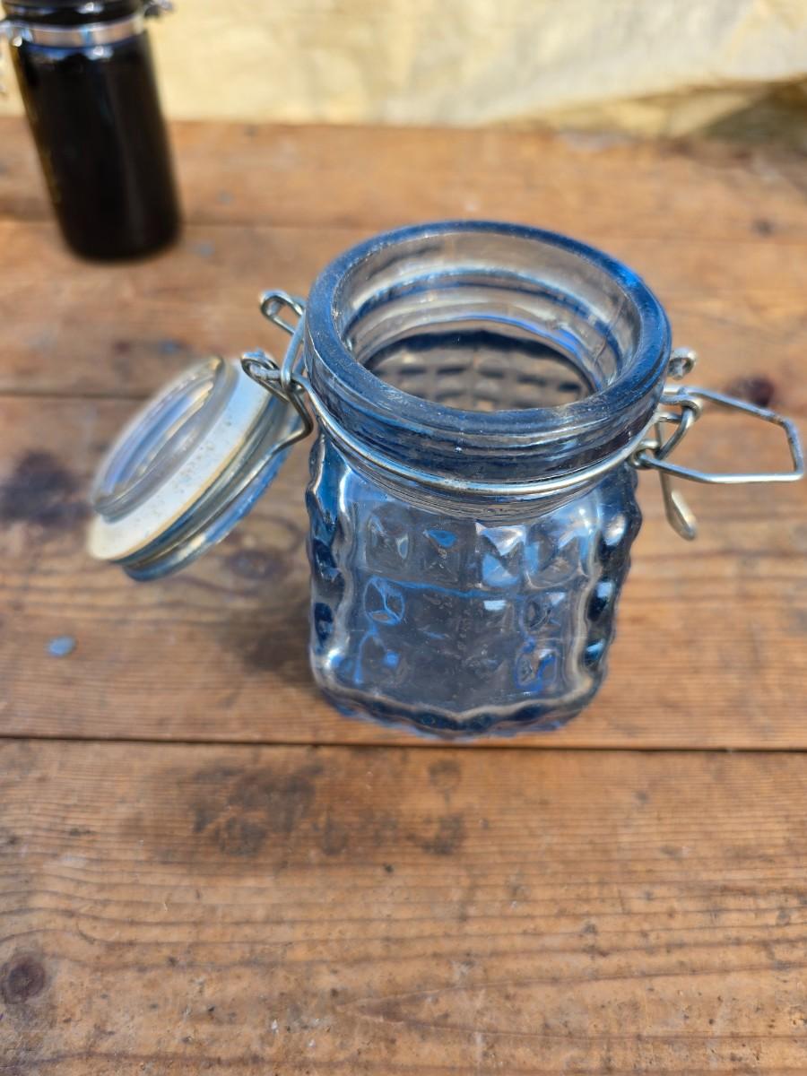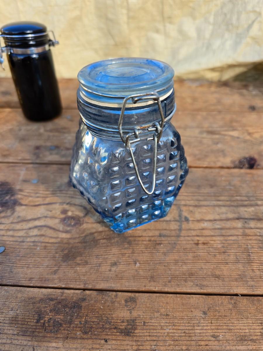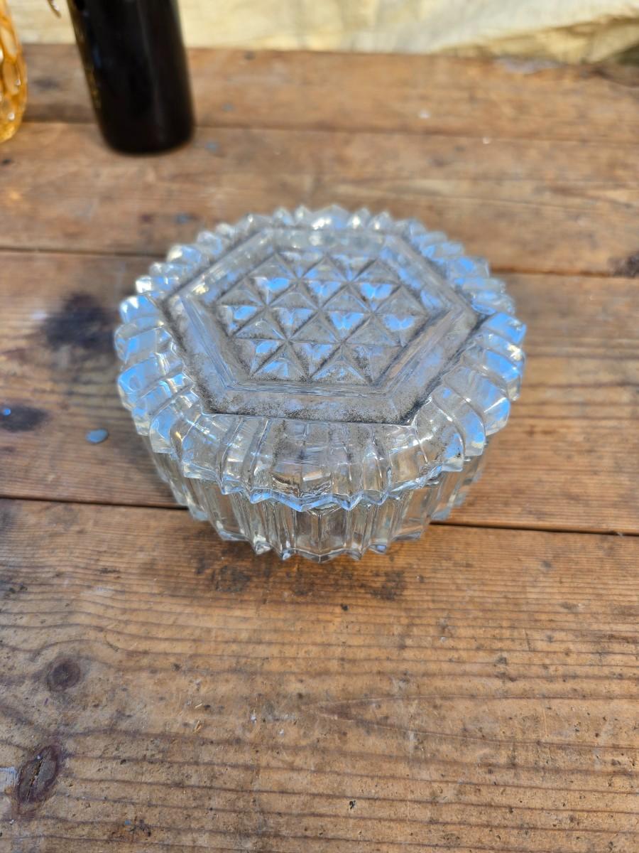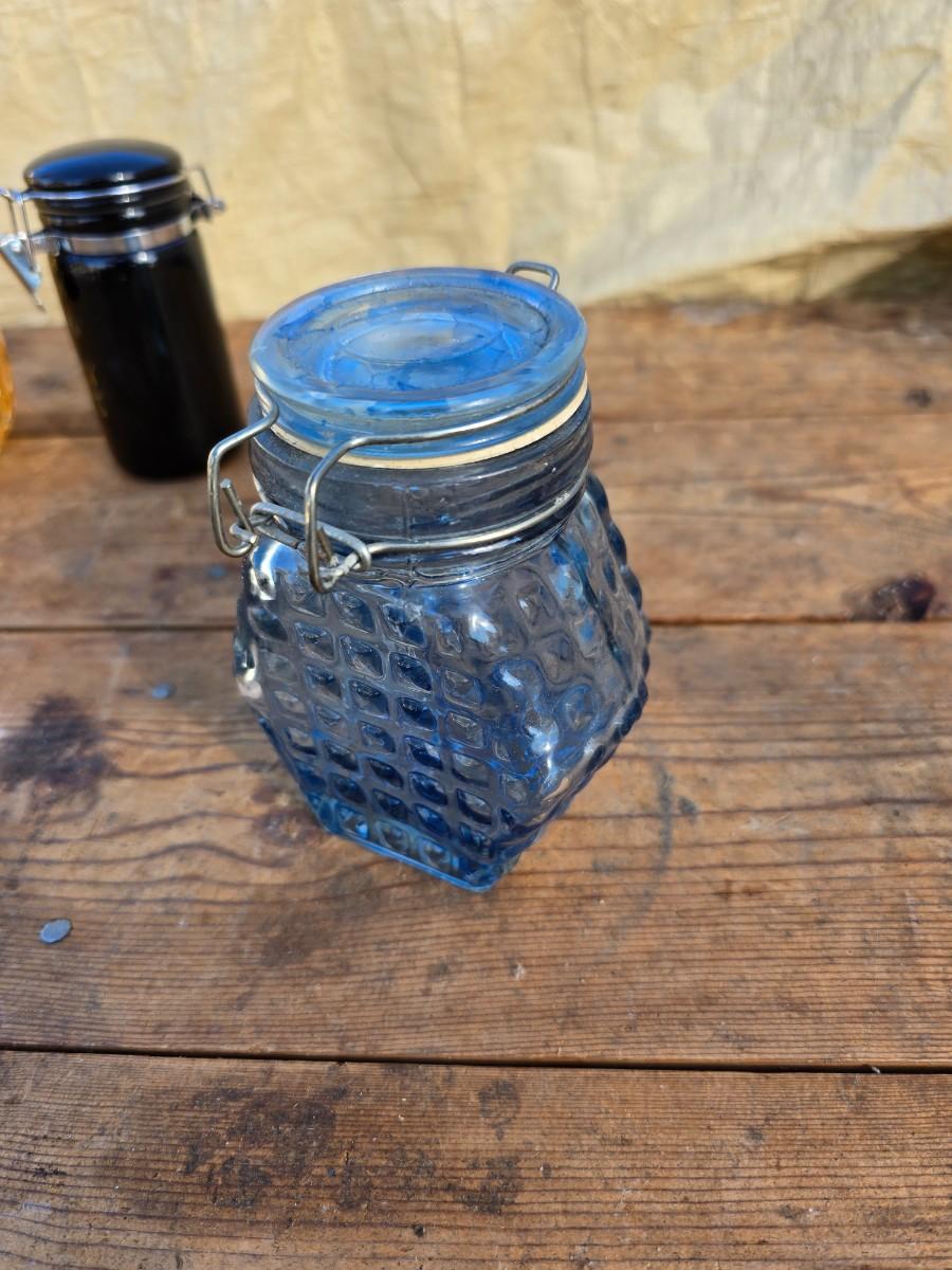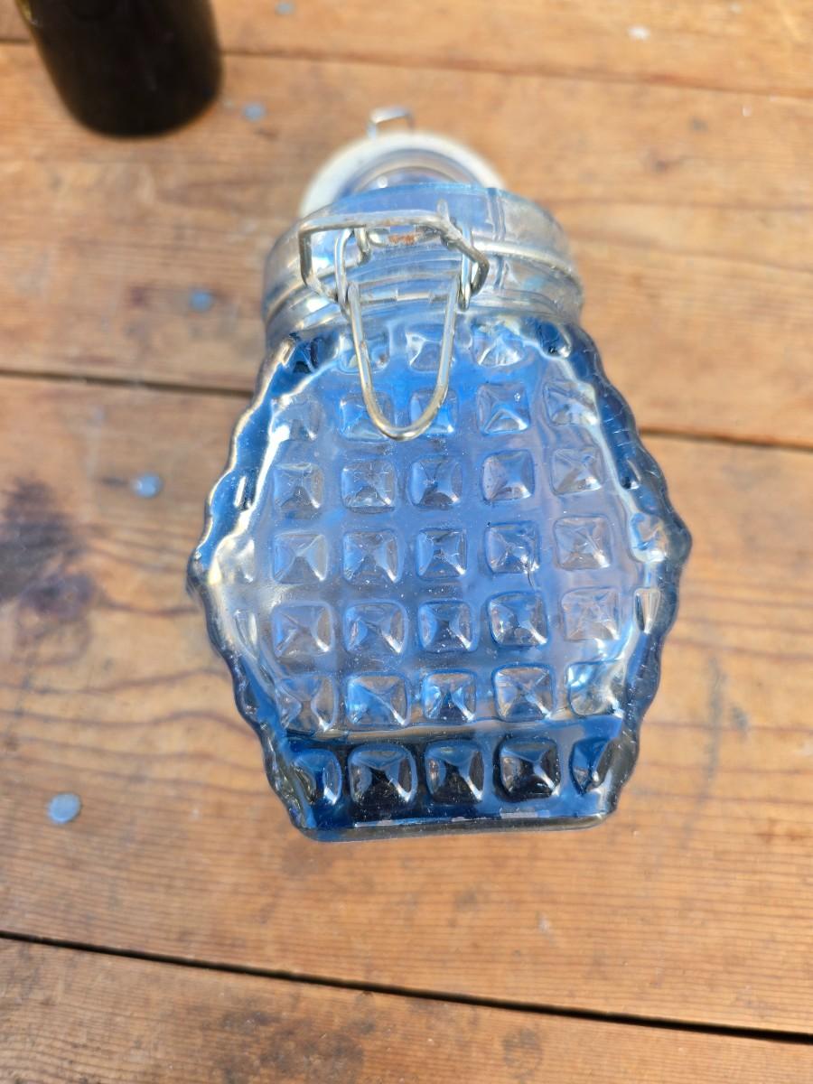 Collection of glassware - MCM Forester Marigold carnival glass decanter - Coplin style glass staining jar - assortment of other jars and dishes