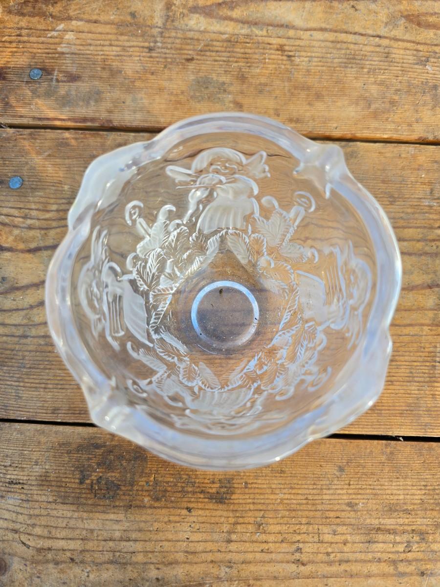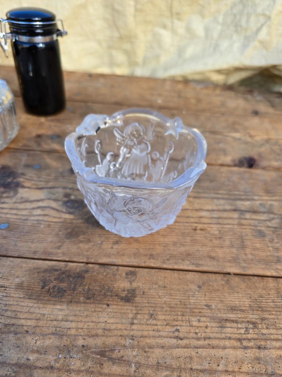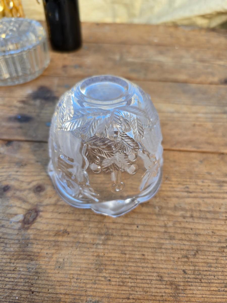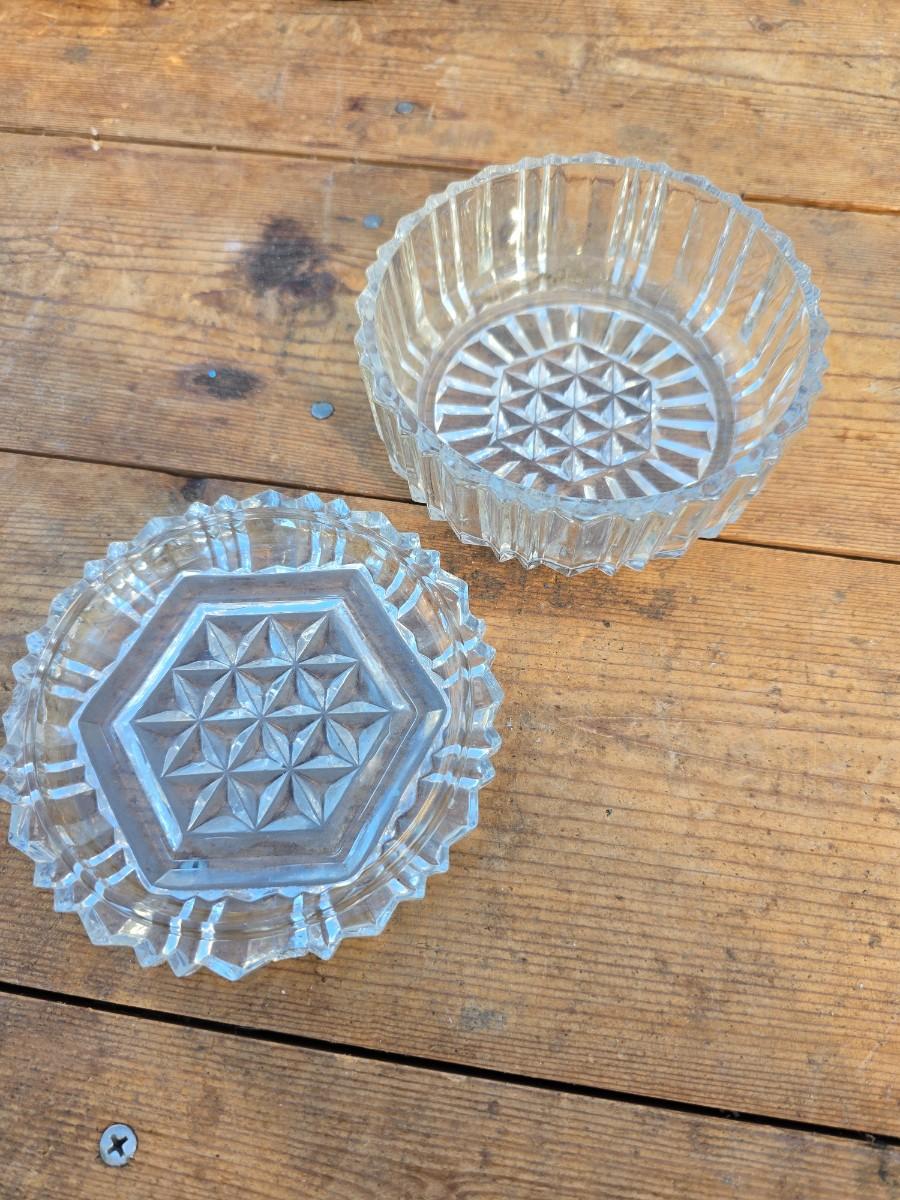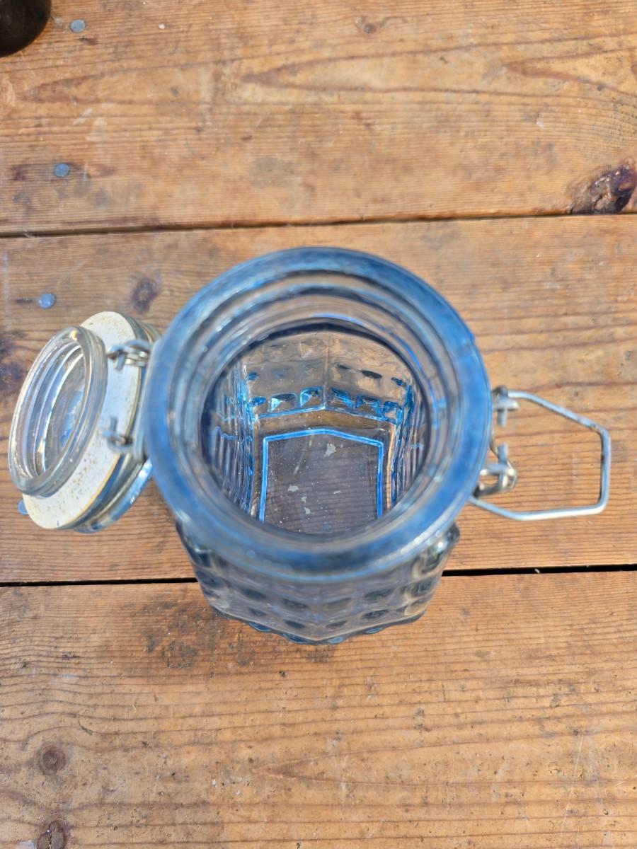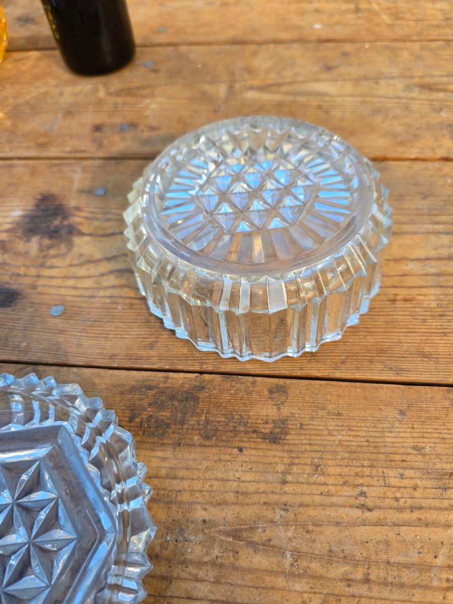 Collection of glassware - MCM Forester Marigold carnival glass decanter - Coplin style glass staining jar - assortment of other jars and dishes