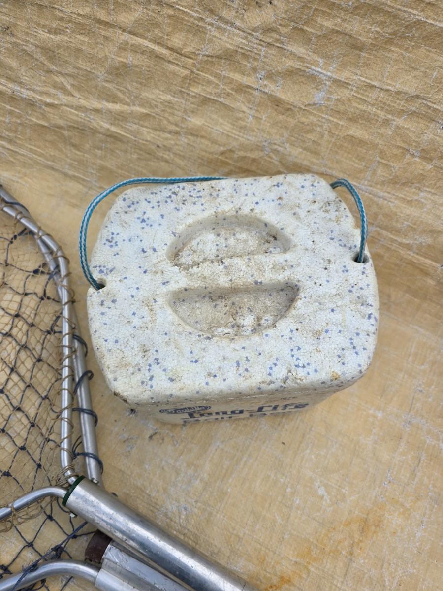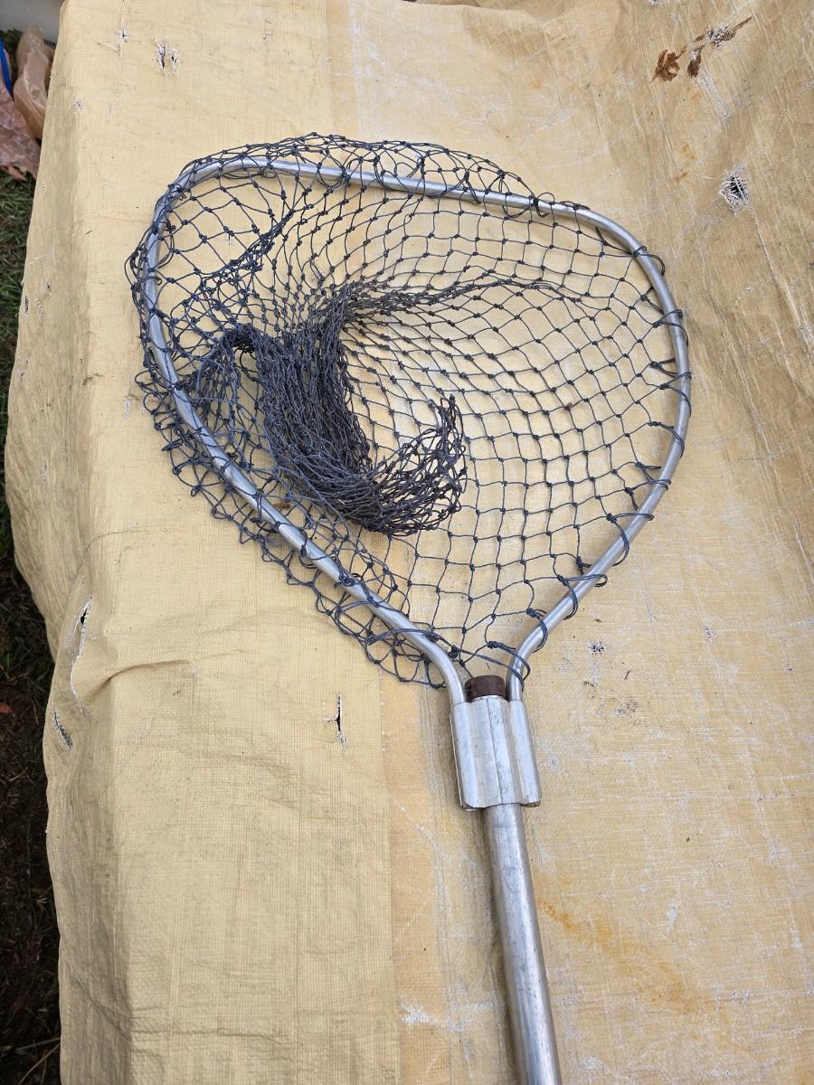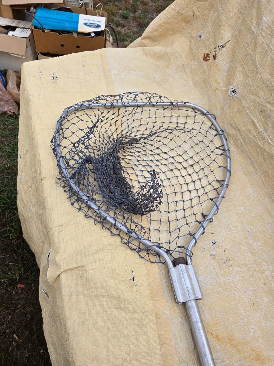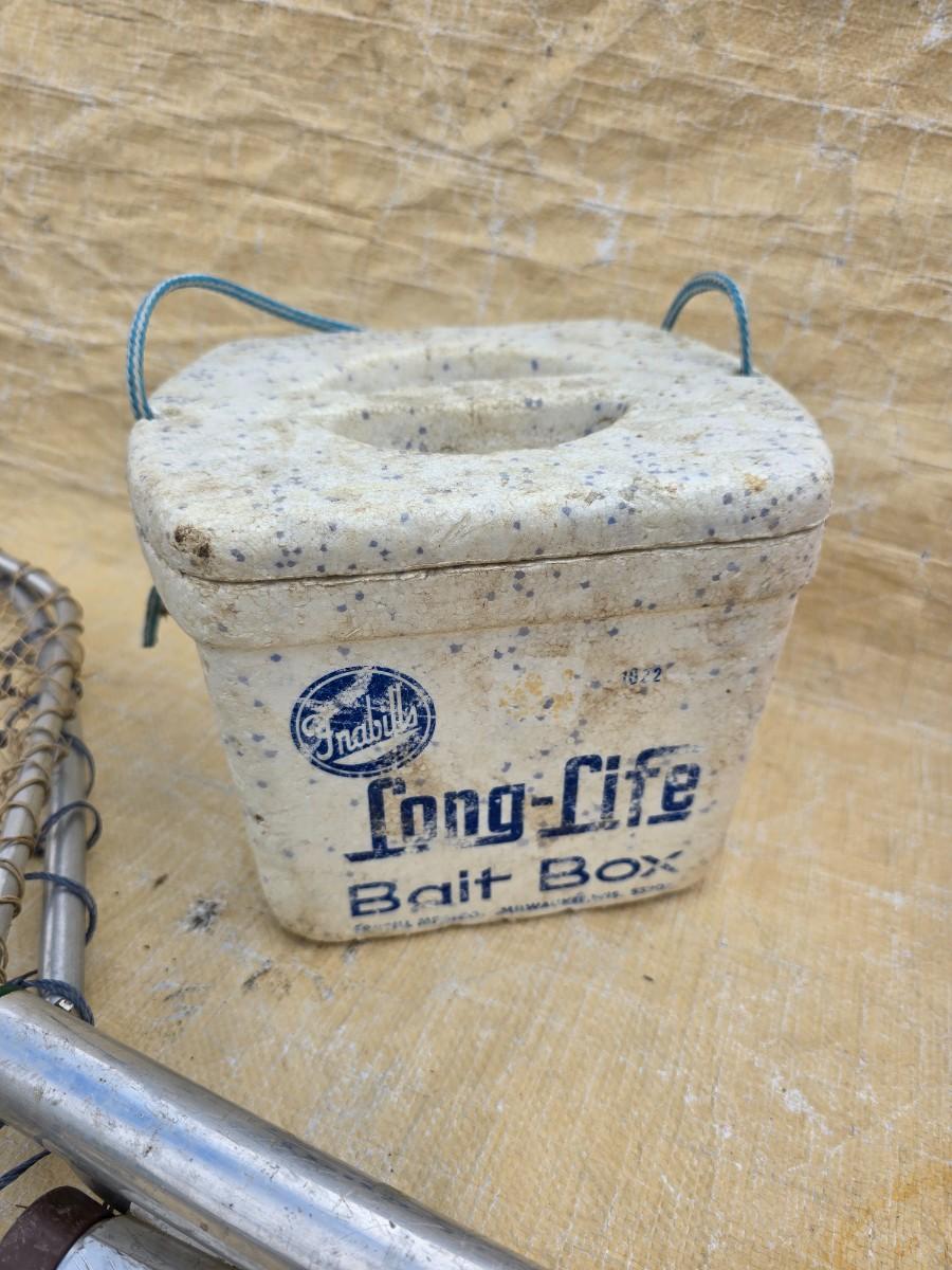 Two long, large fish nets - bob bet bait box- thermos, and a water bottle