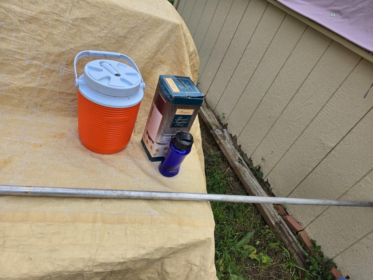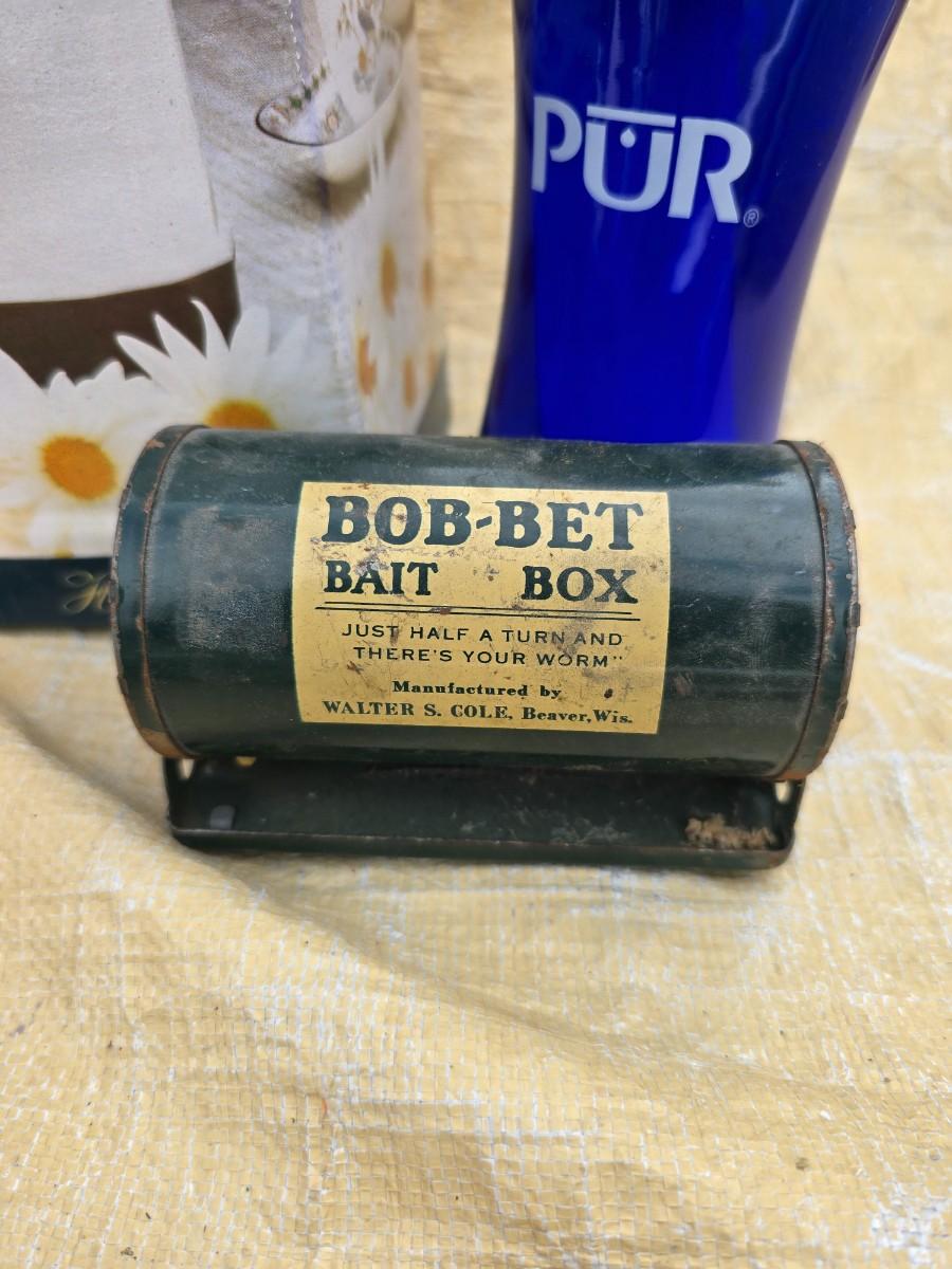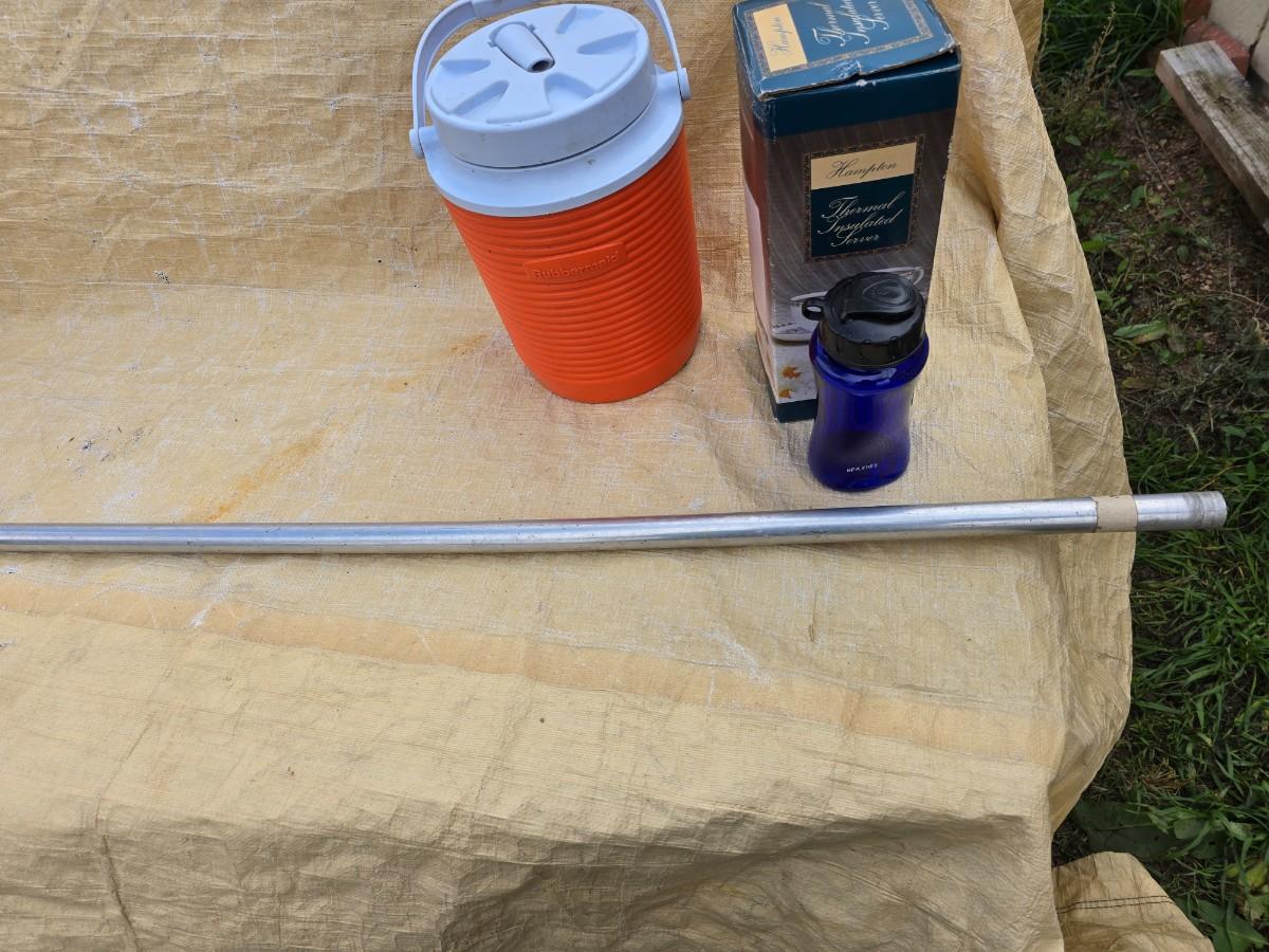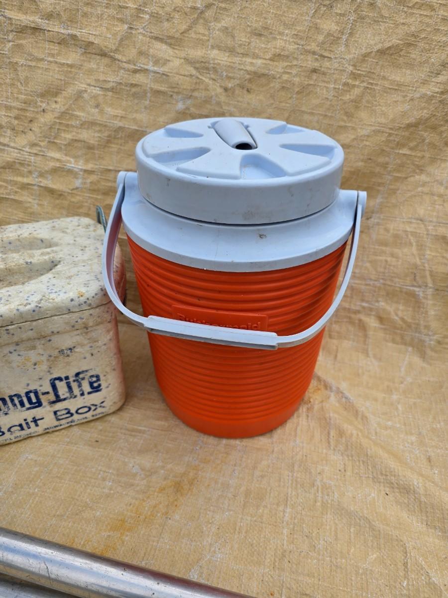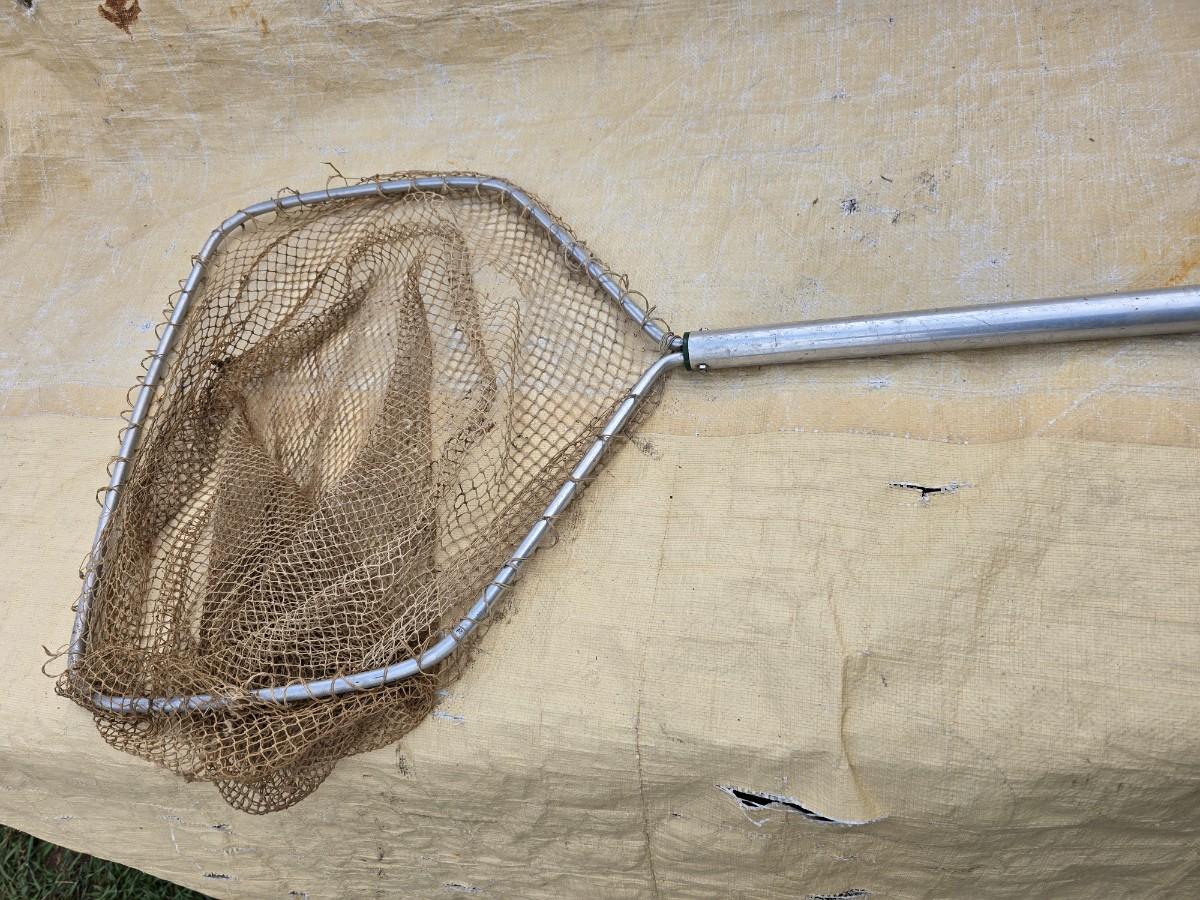 Two long, large fish nets - bob bet bait box- thermos, and a water bottle