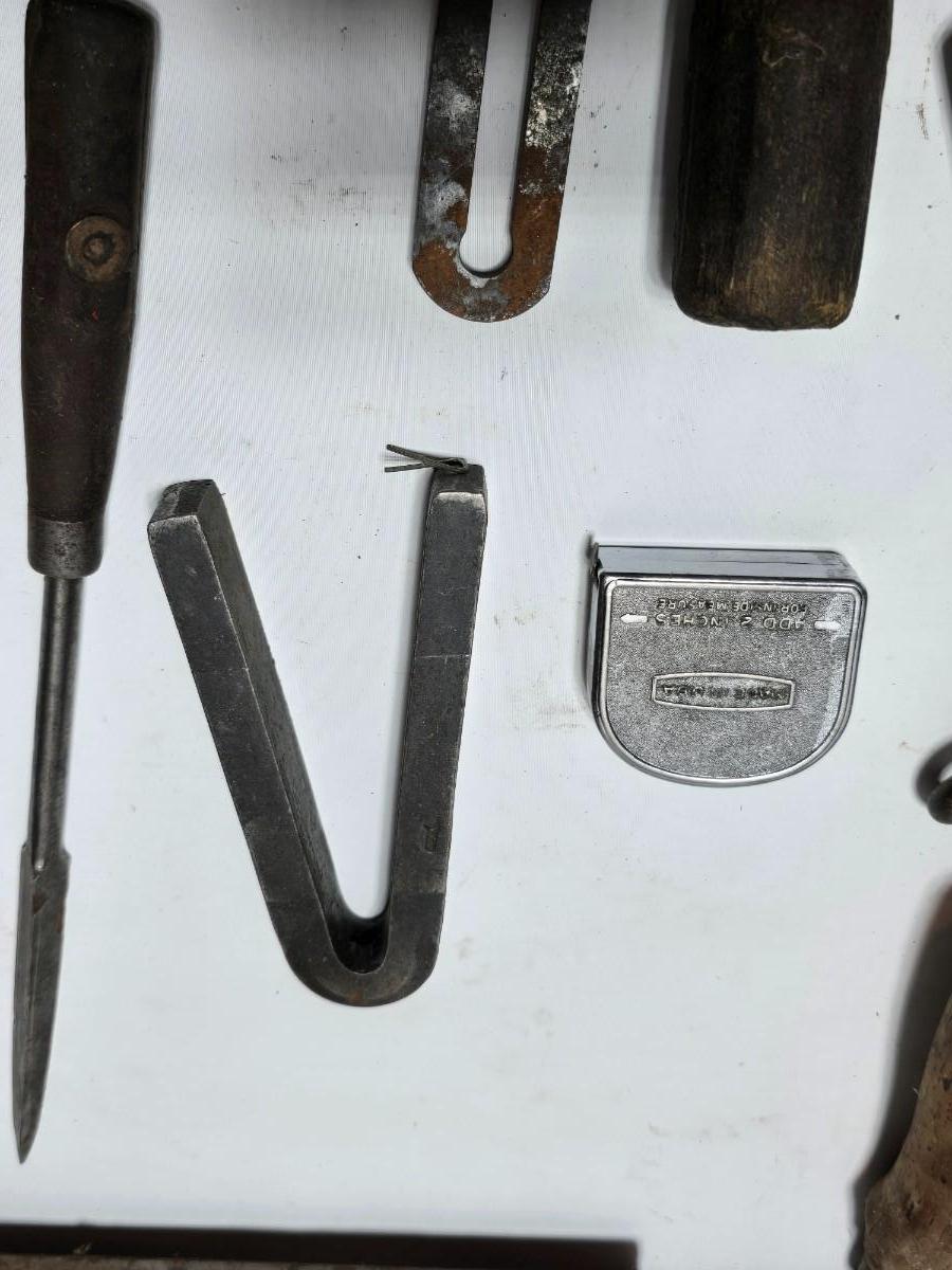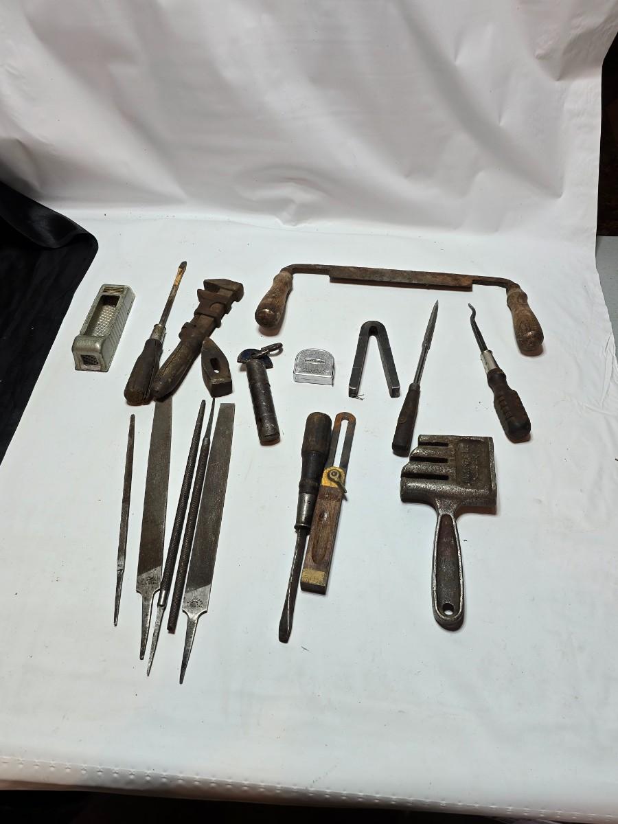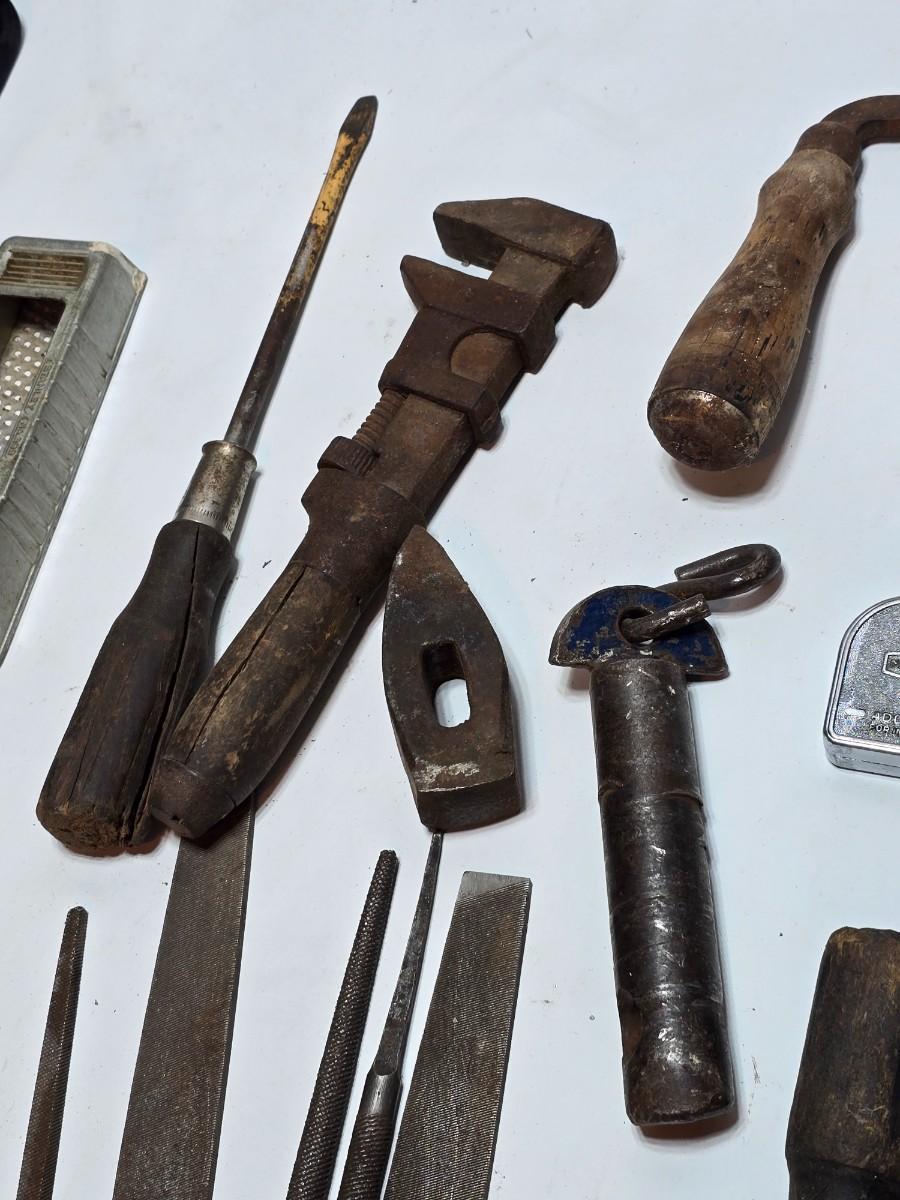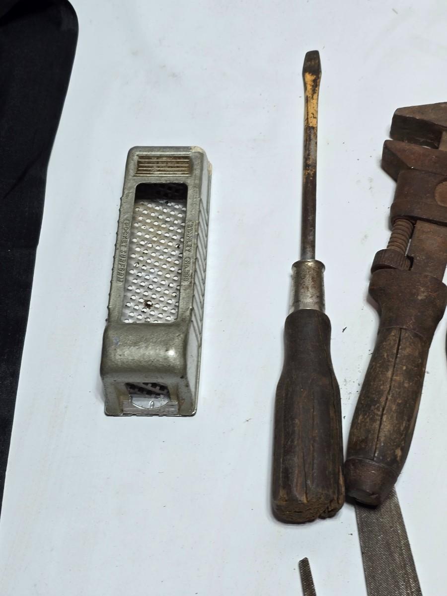 Antique farm tools - drawbar - Monkey wrench - screwdrivers - Rasp - Hershel chain break detacher - and more