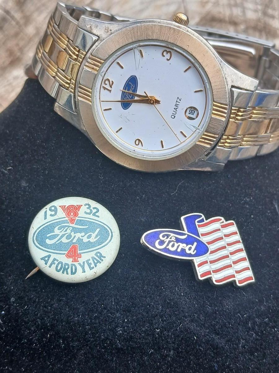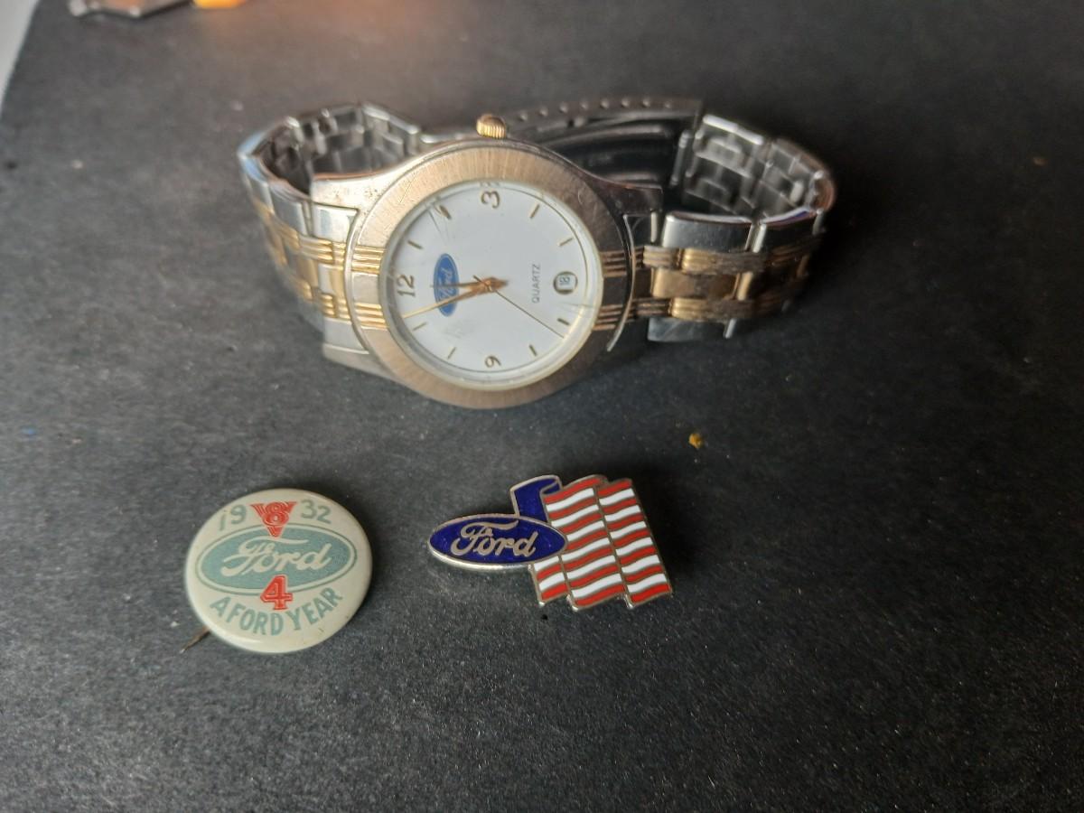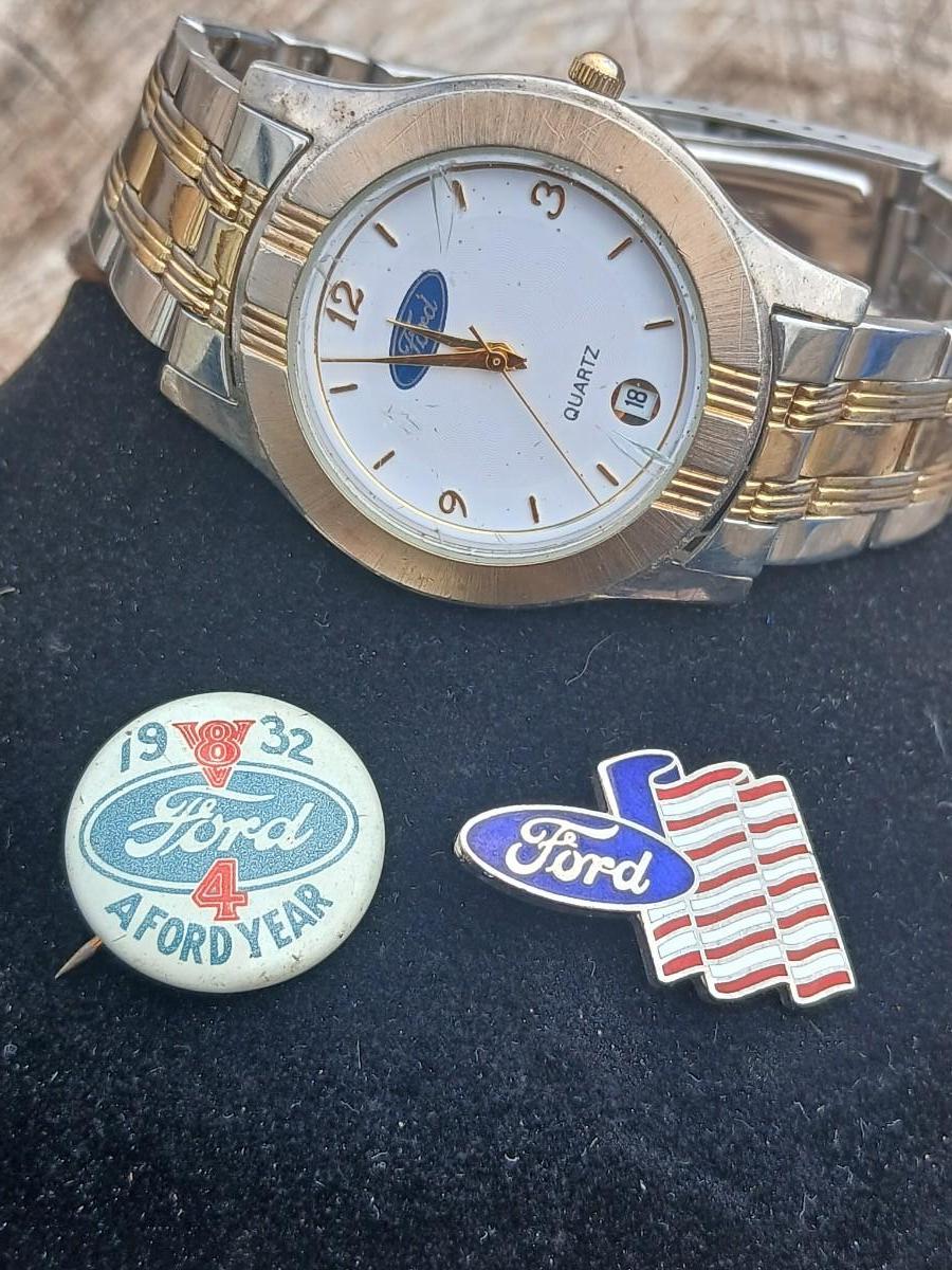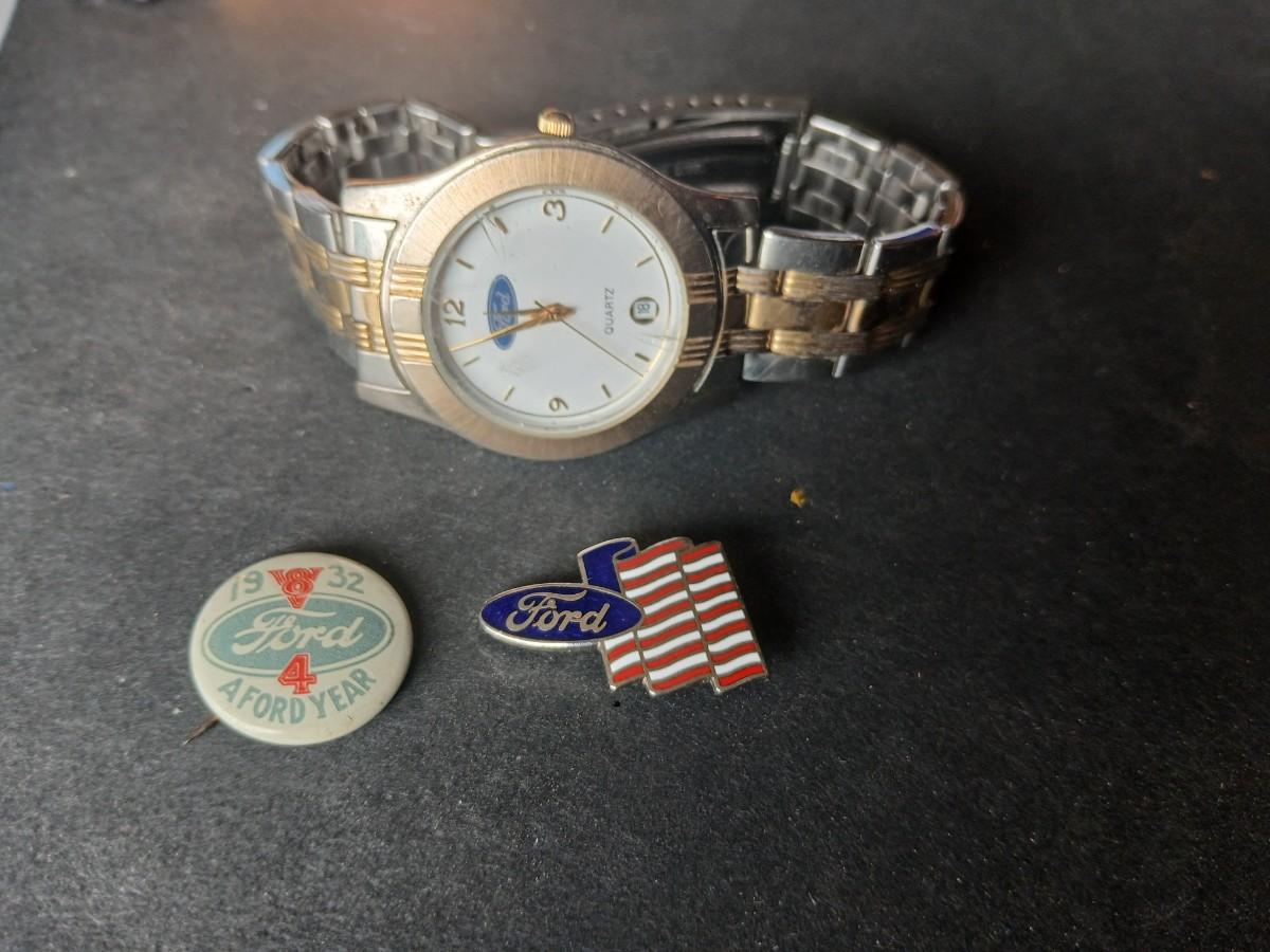 For the love of Ford - Ford logo quartz Wristwatch - 1938 V8 Ford 4 a Ford year pin = Ford and American flag hat pin