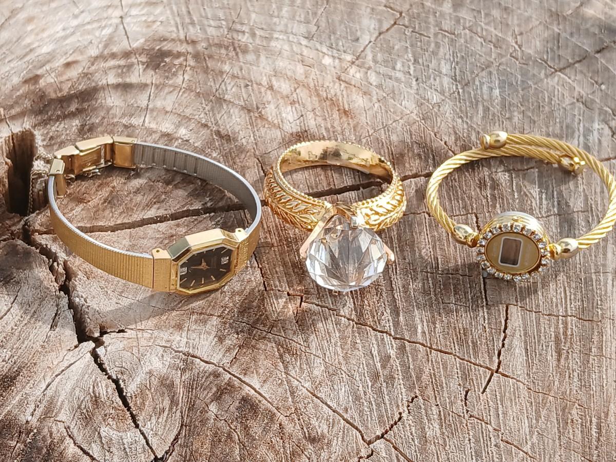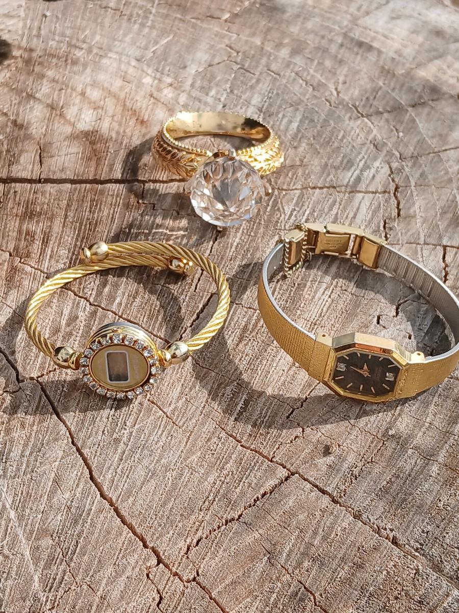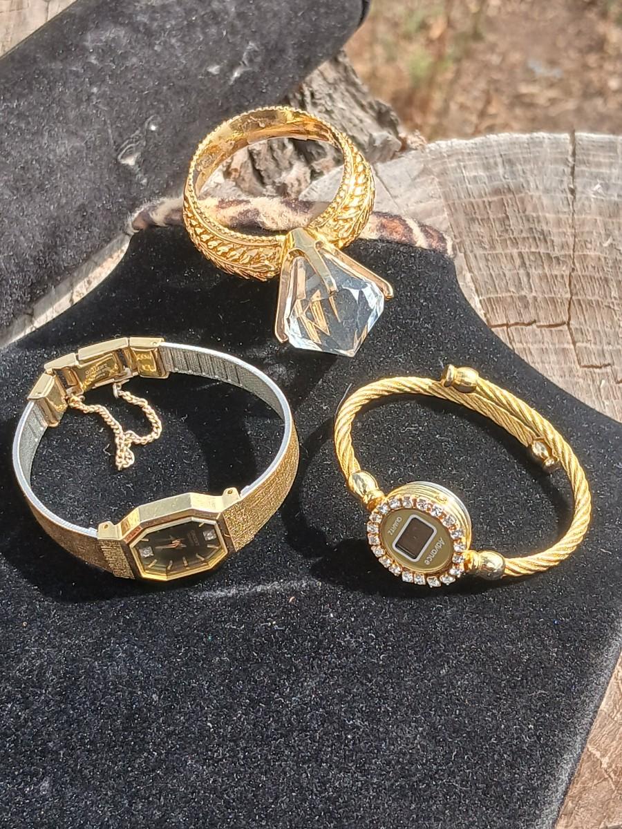 Two womens watches with faux diamonds and a Big huge faux diamond ring