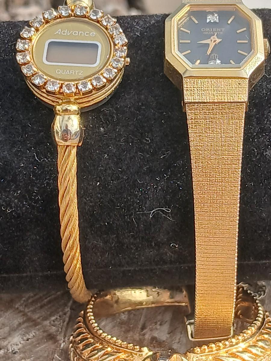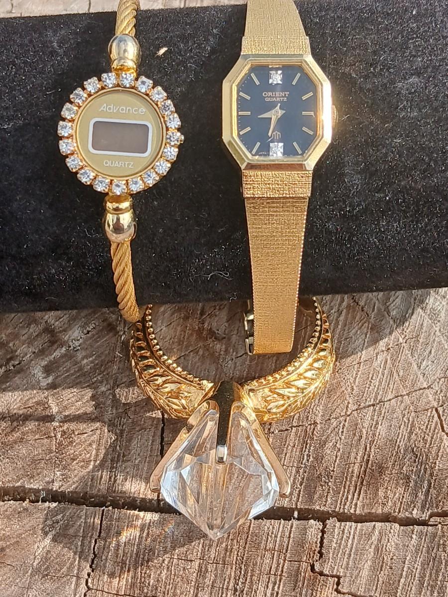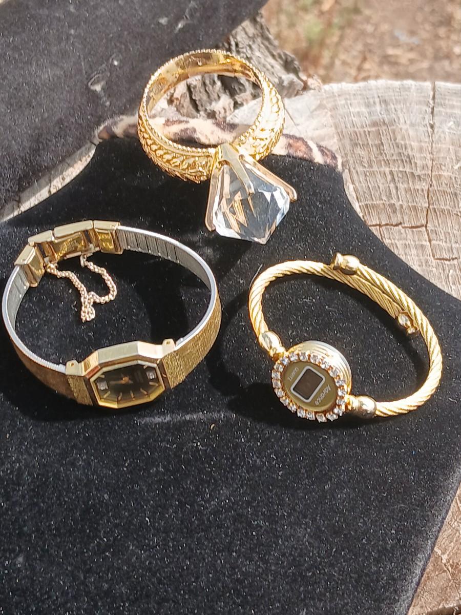 Two womens watches with faux diamonds and a Big huge faux diamond ring