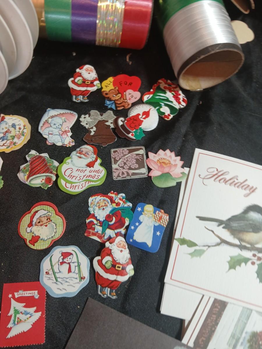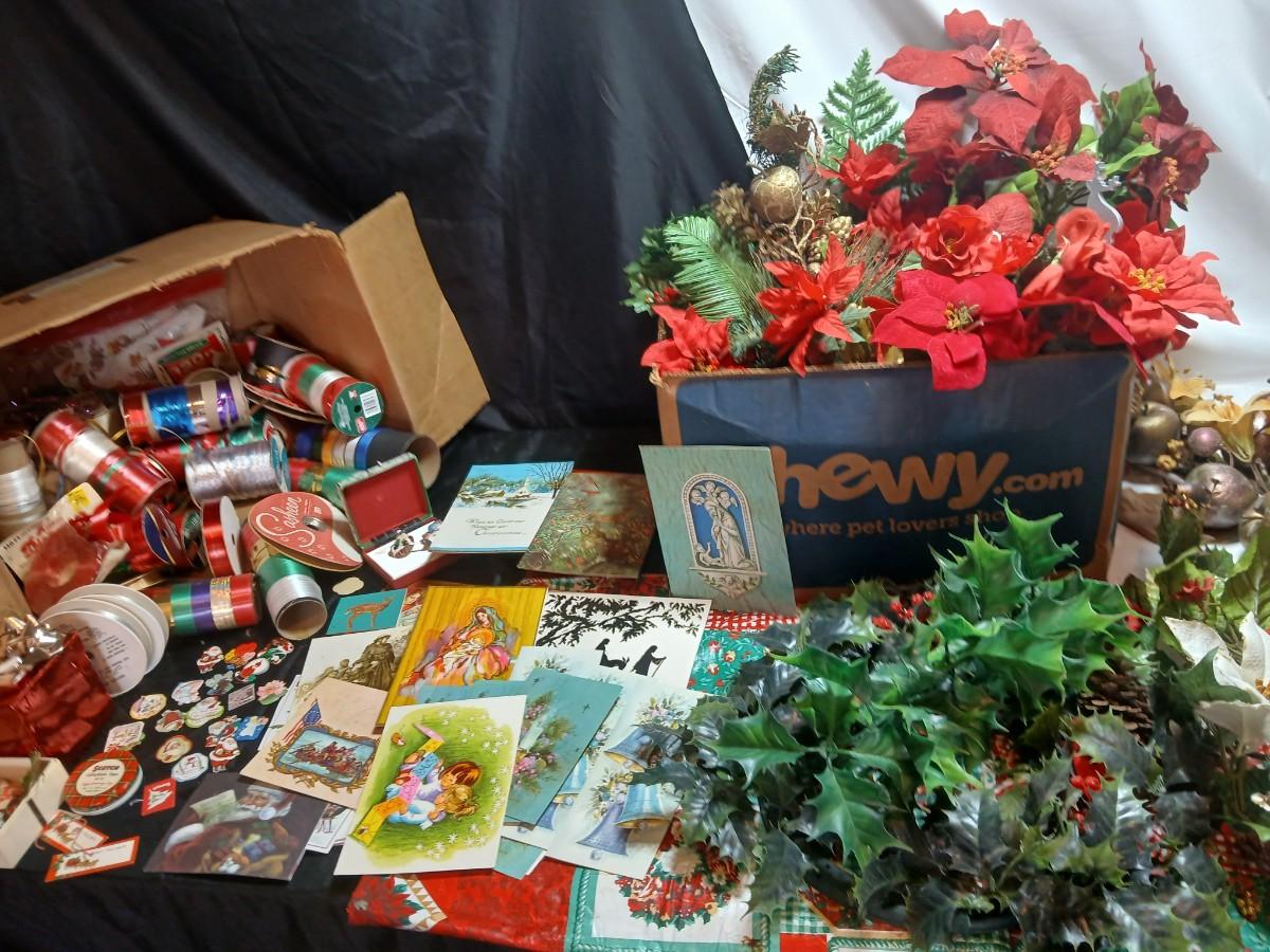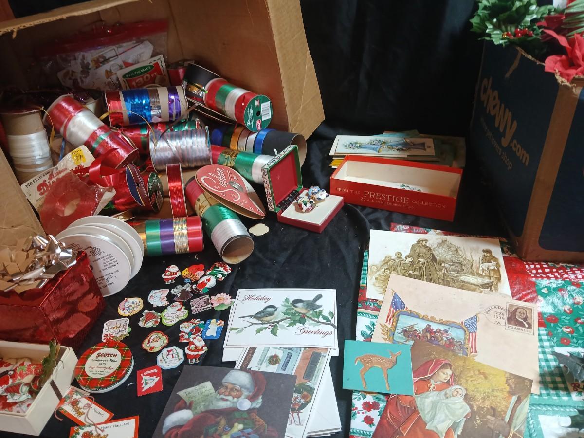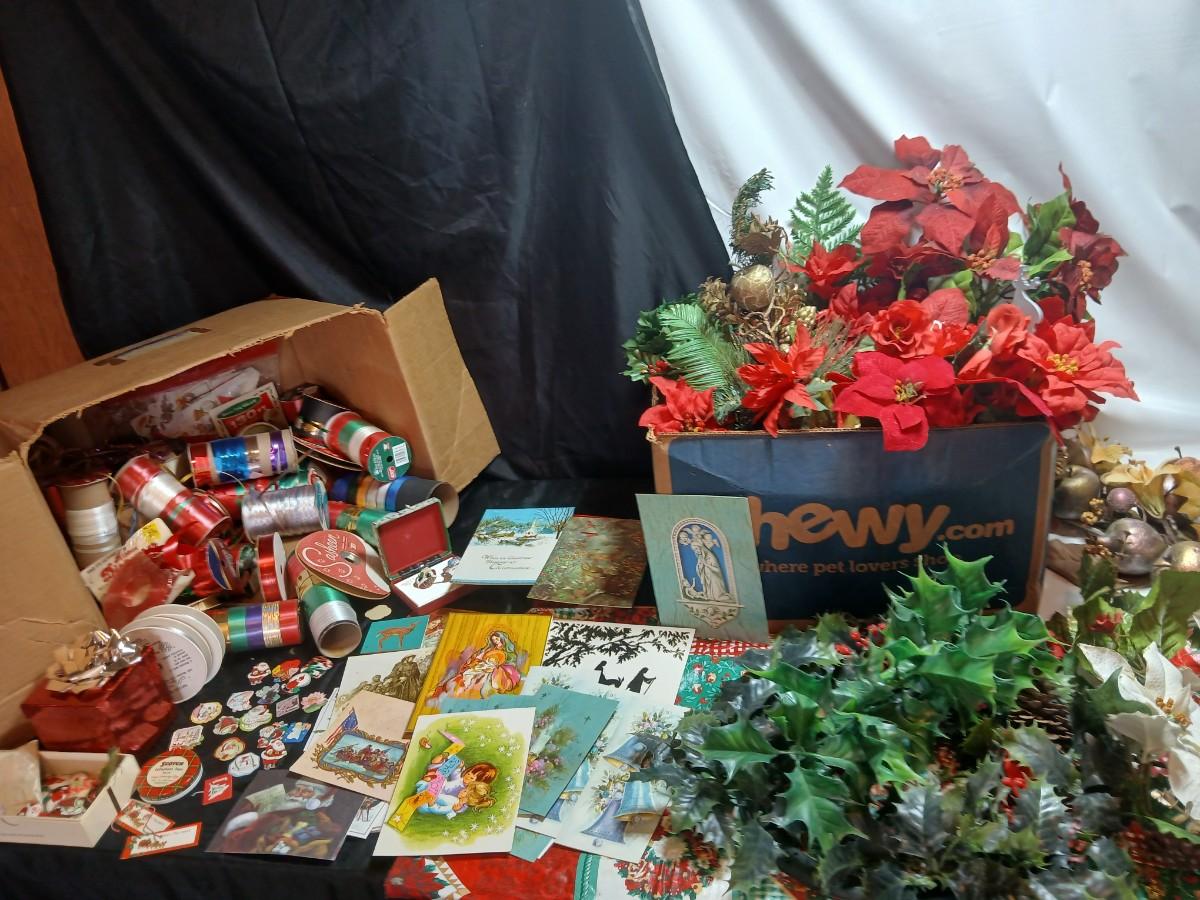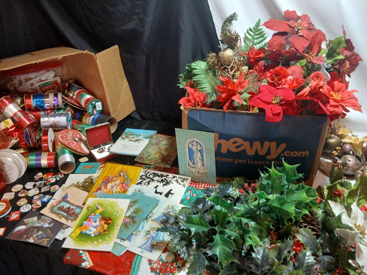 Christmas greenery, Wreath making twigs, cards, Vintage cute stickers, and a box of assorted ribbon