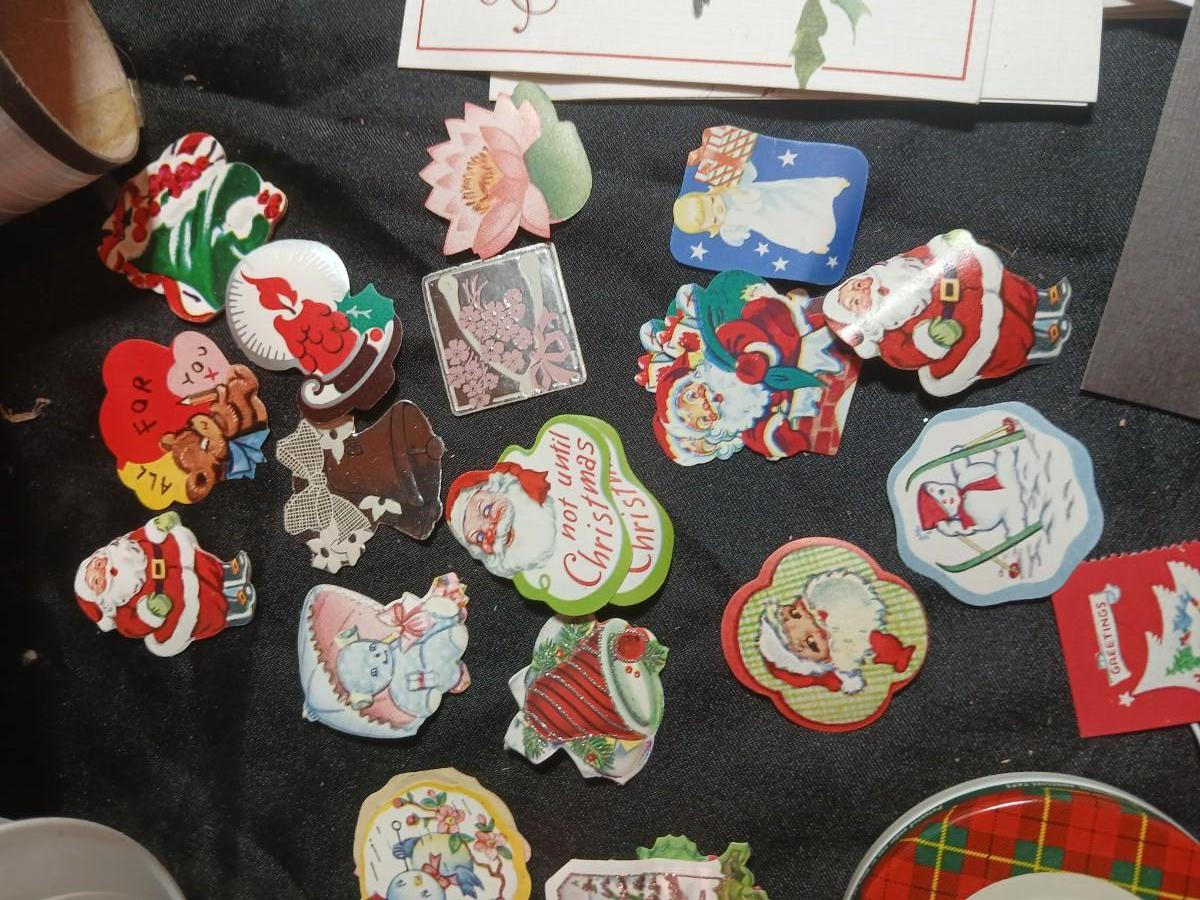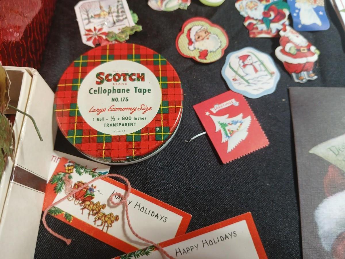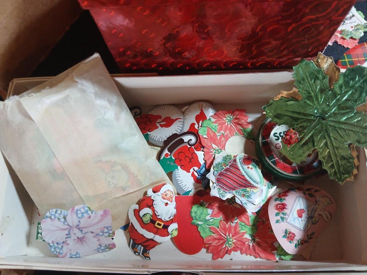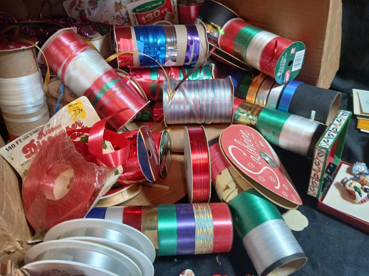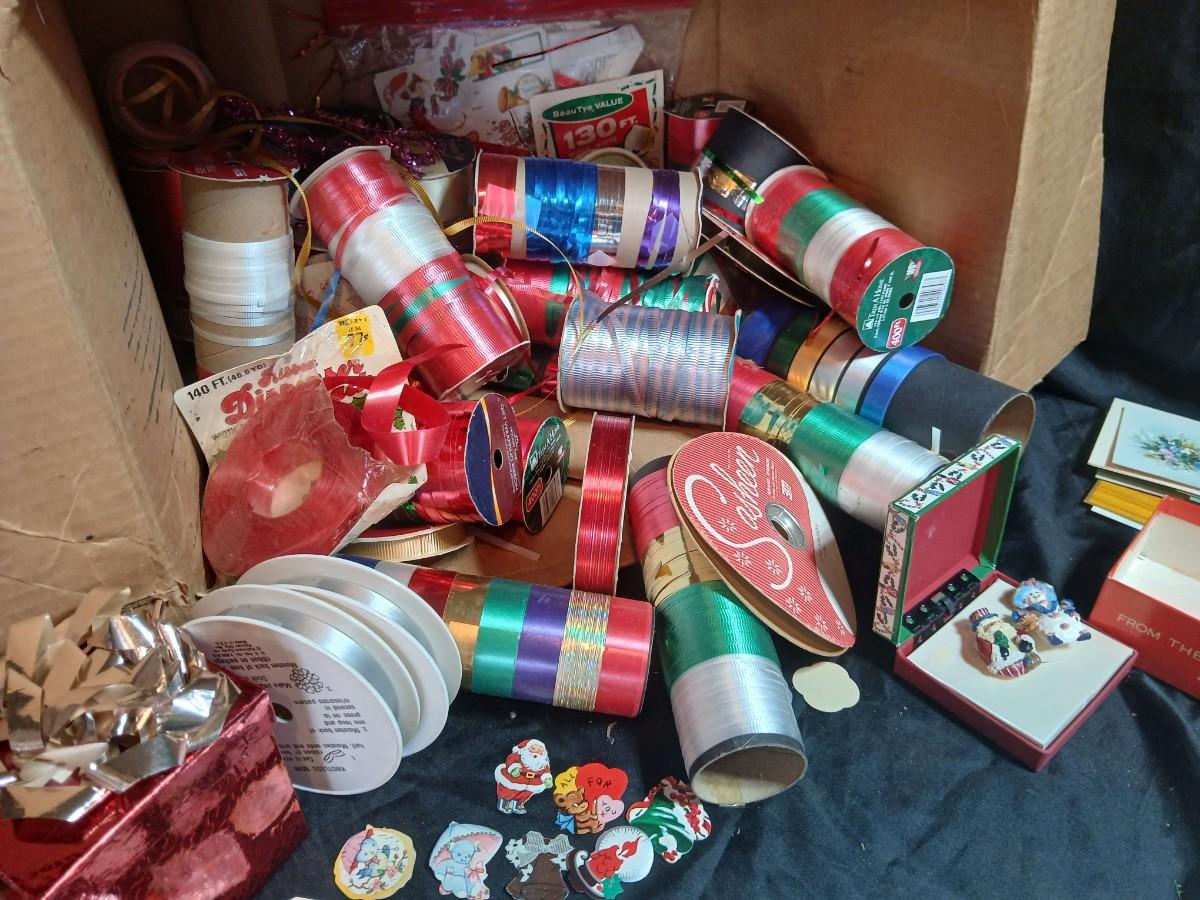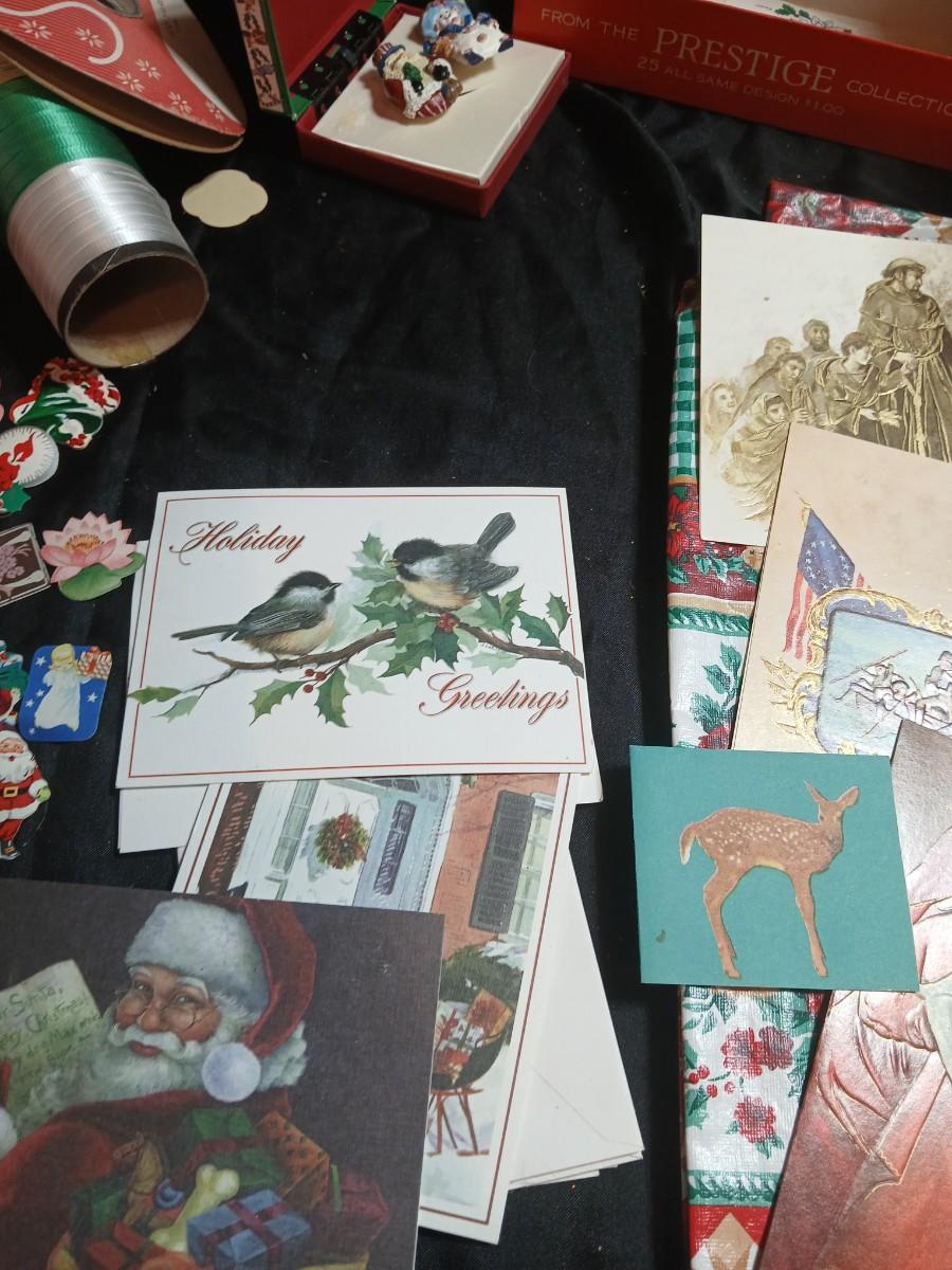 Christmas greenery, Wreath making twigs, cards, Vintage cute stickers, and a box of assorted ribbon