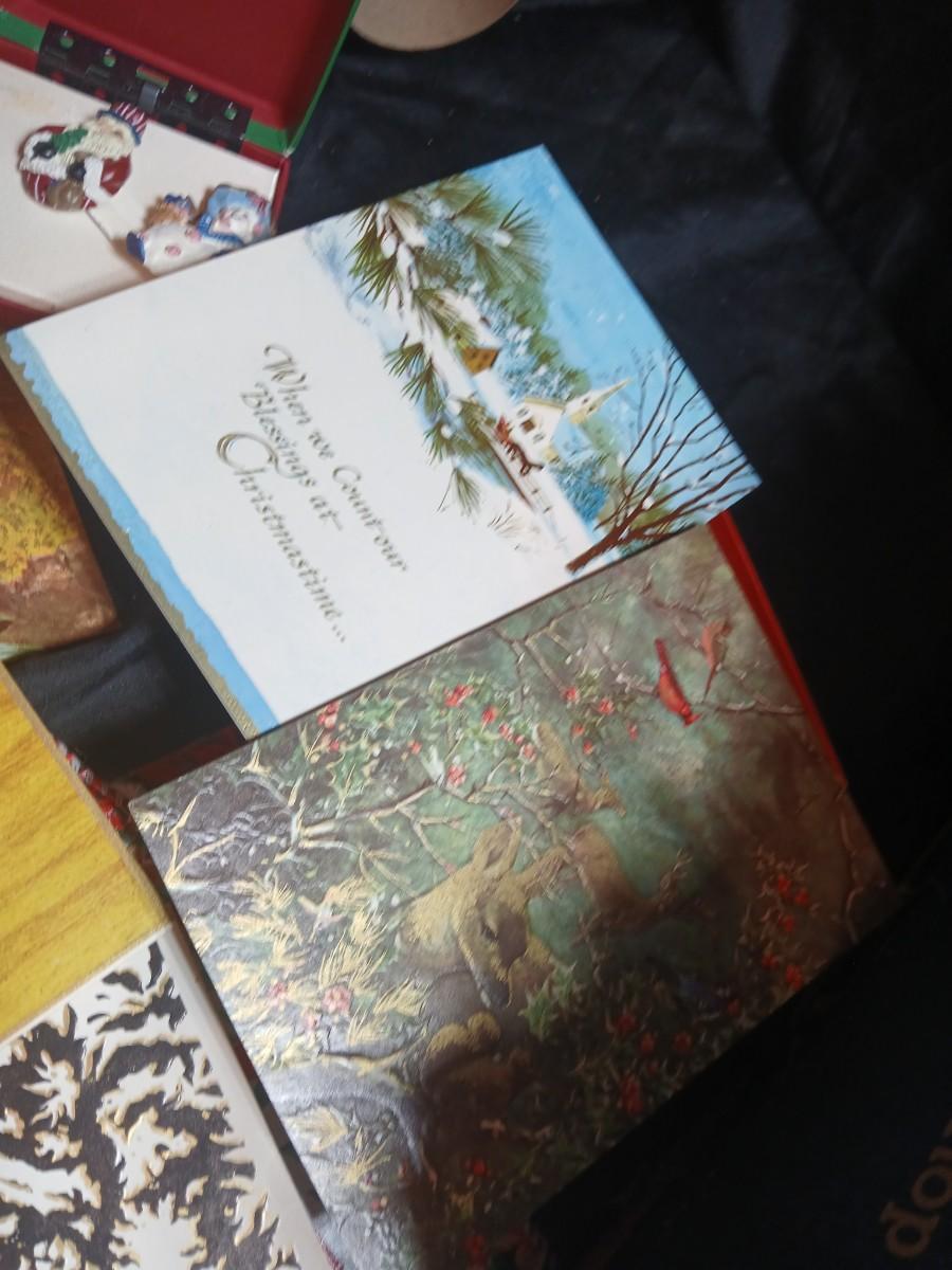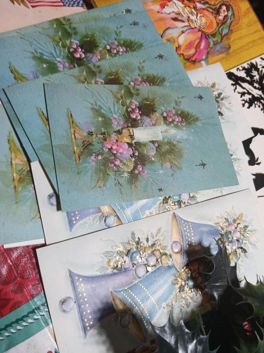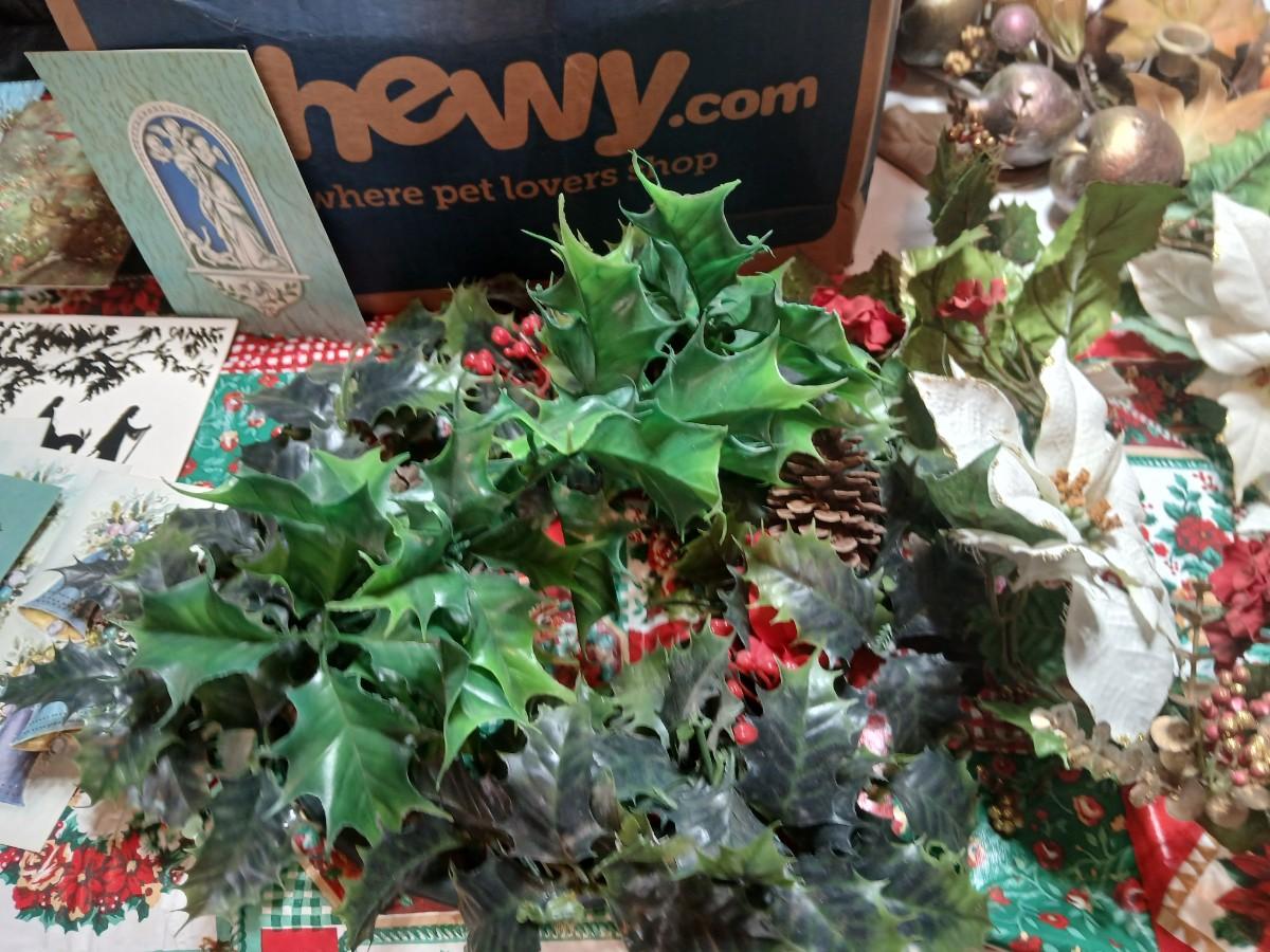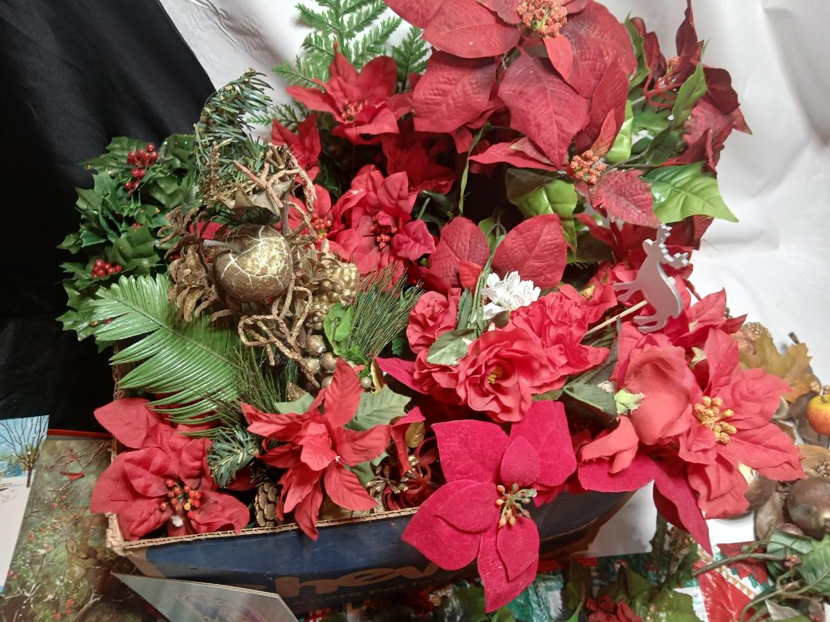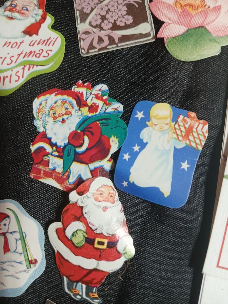 Christmas greenery, Wreath making twigs, cards, Vintage cute stickers, and a box of assorted ribbon