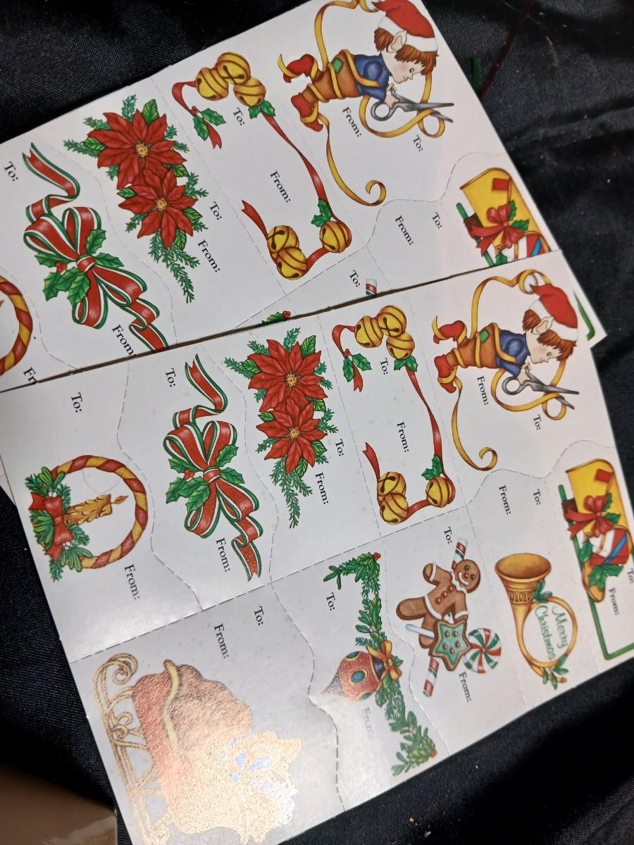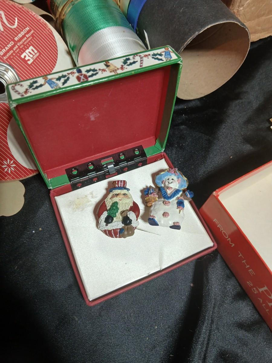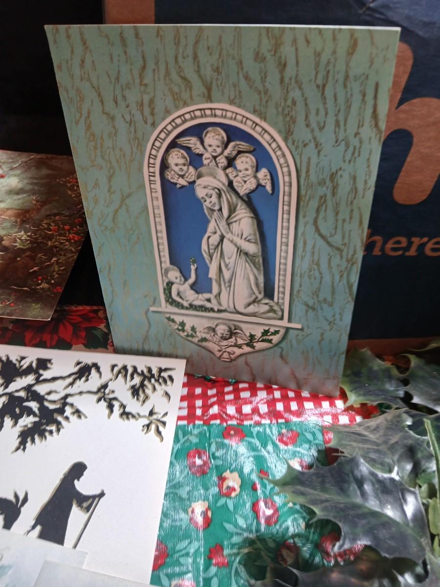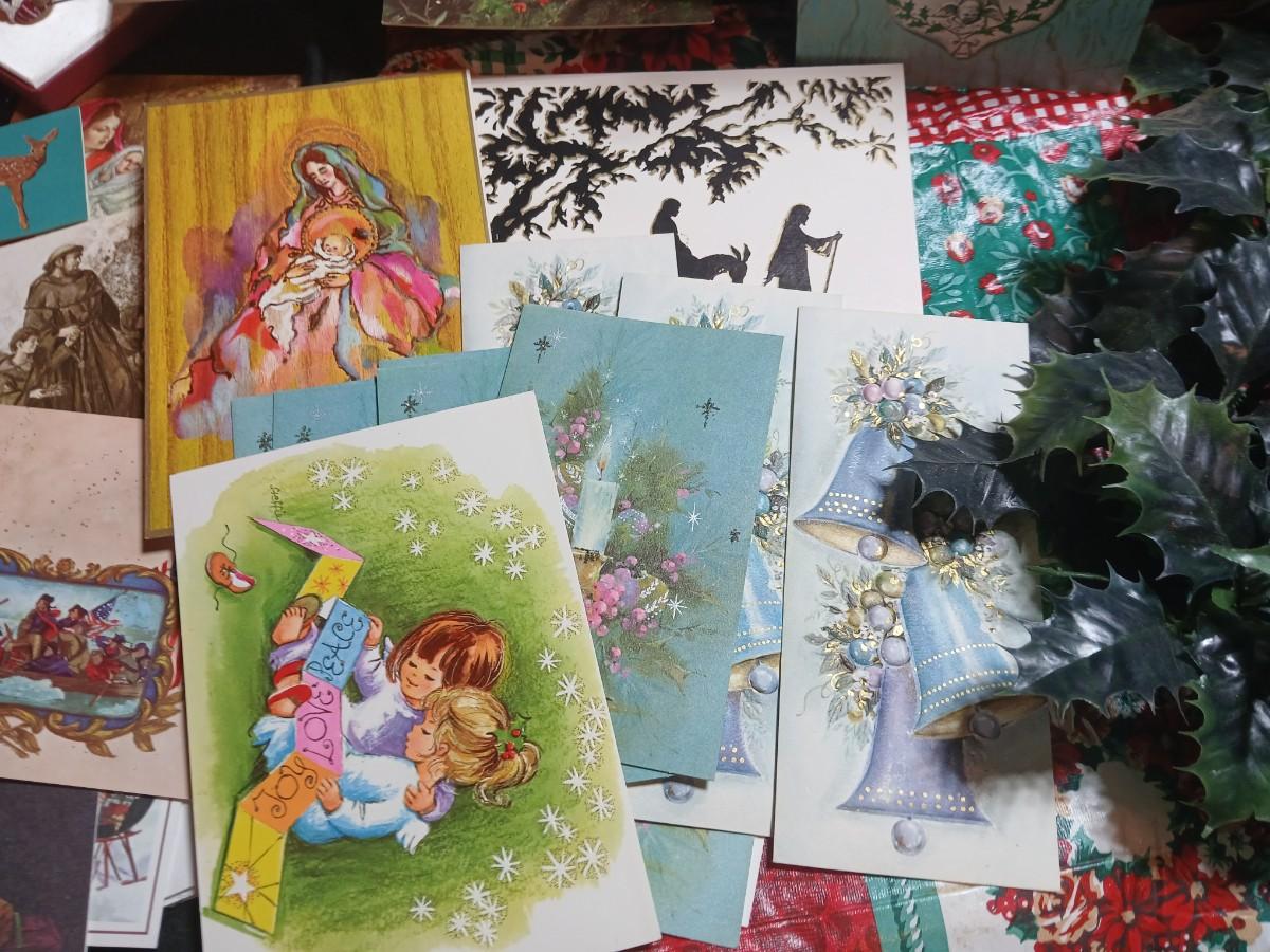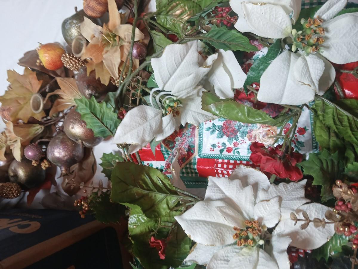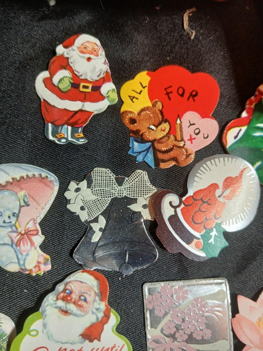 Christmas greenery, Wreath making twigs, cards, Vintage cute stickers, and a box of assorted ribbon