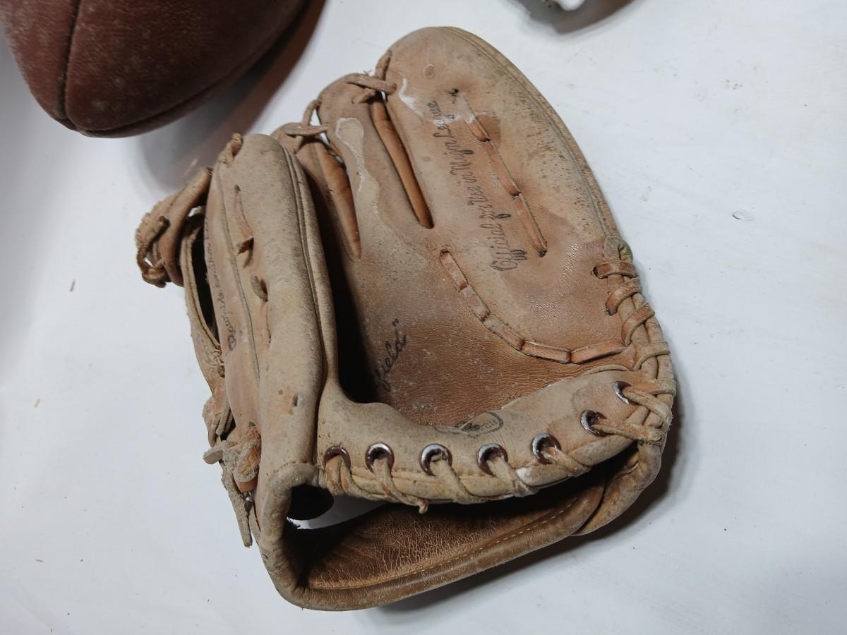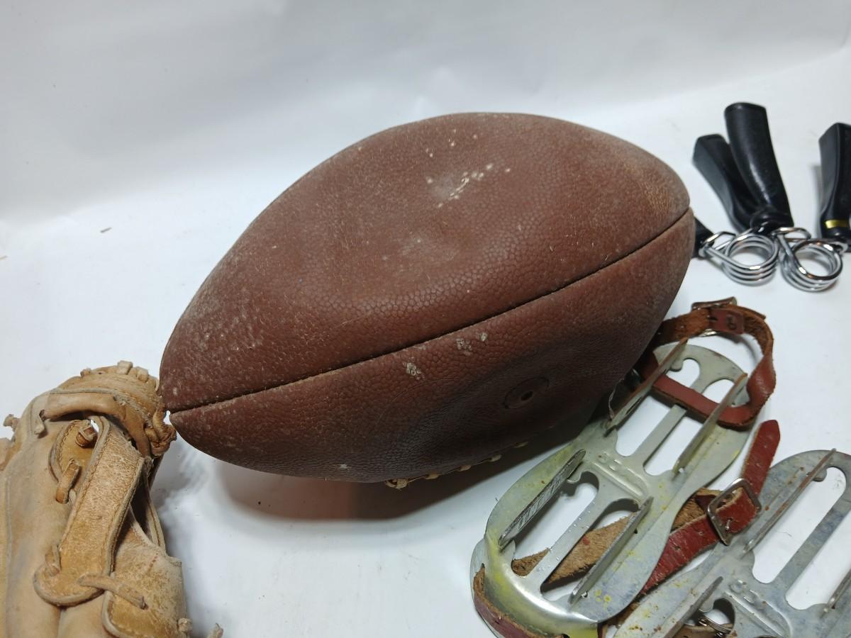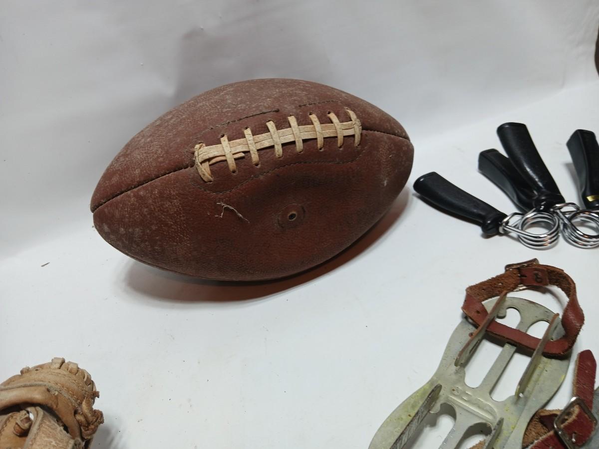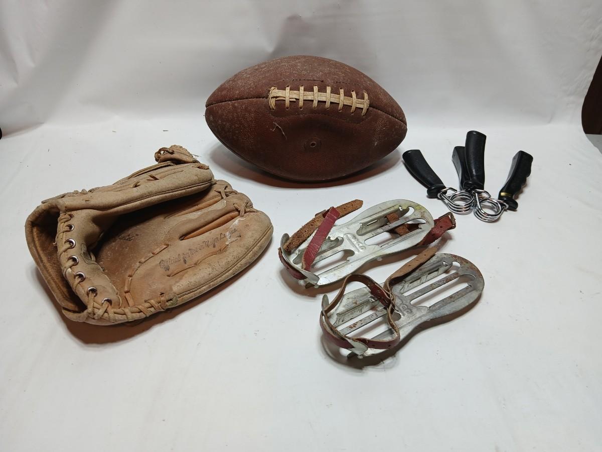 Vintage sporting - Antique metal ice skates, old football and a softball mitt