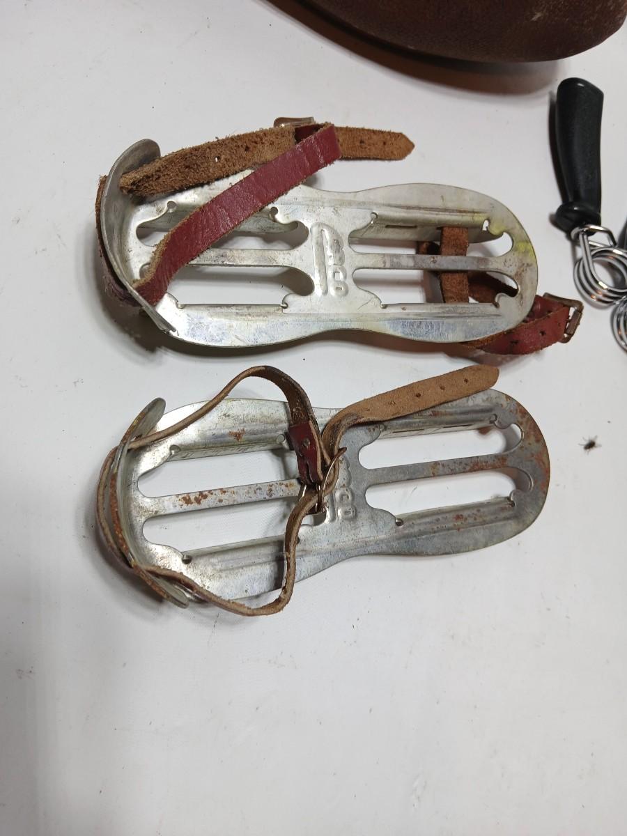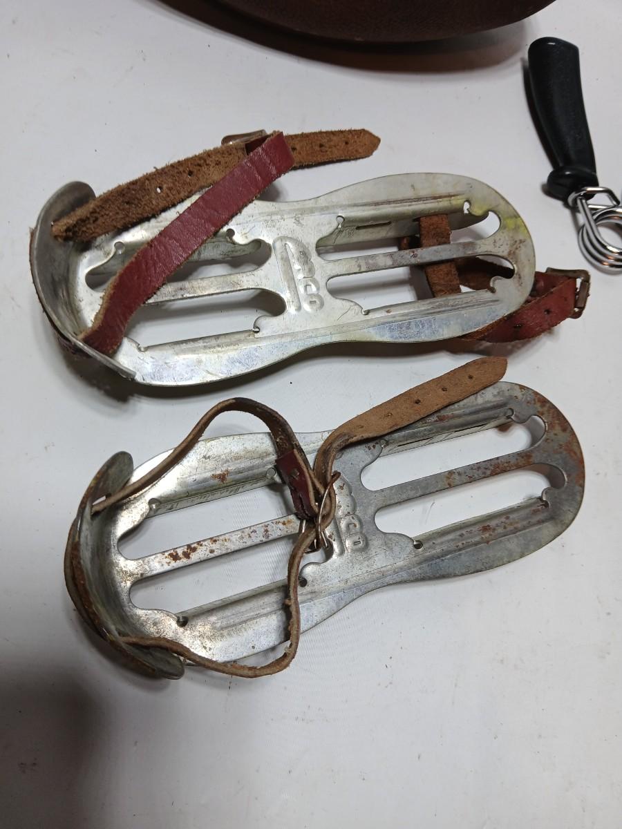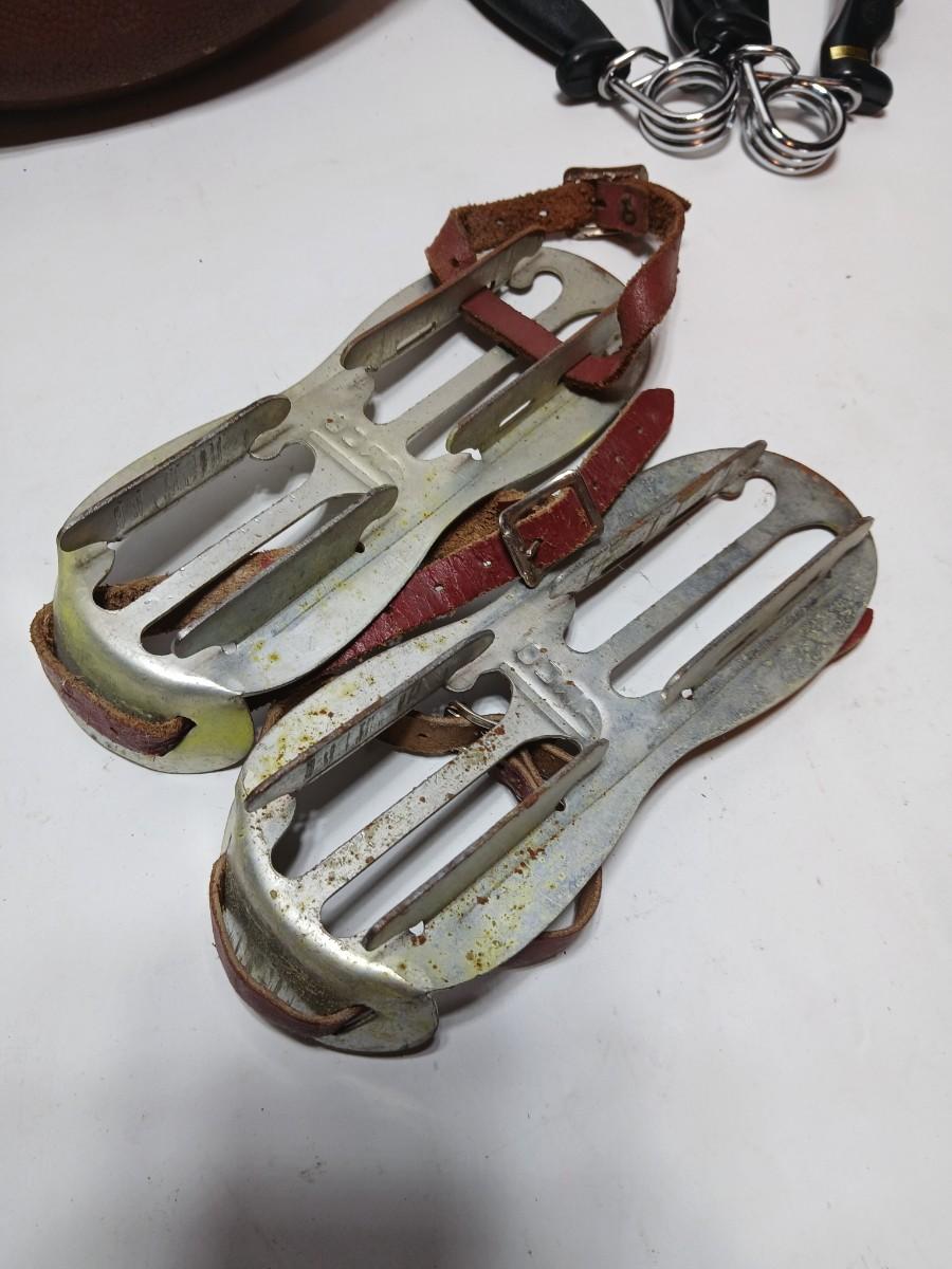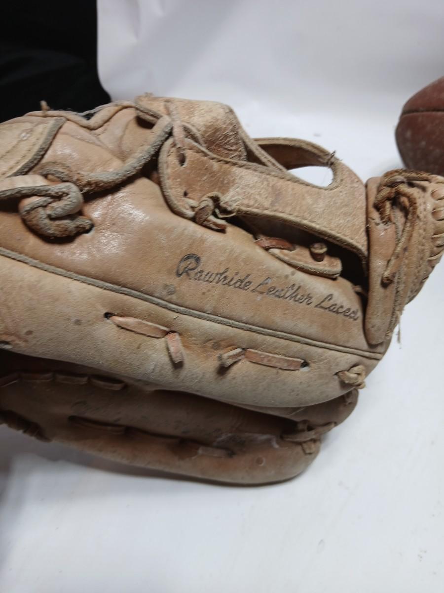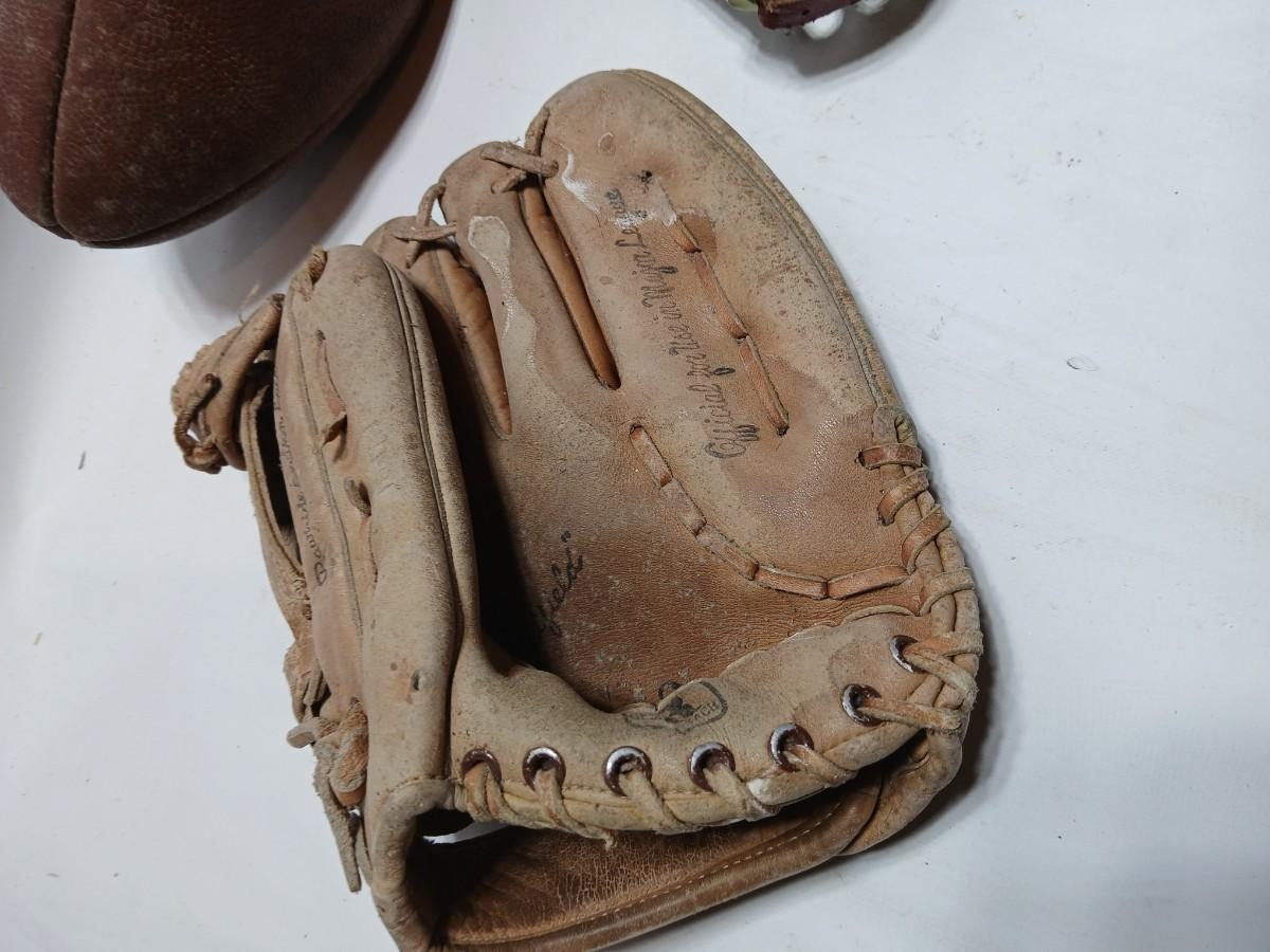 Vintage sporting - Antique metal ice skates, old football and a softball mitt