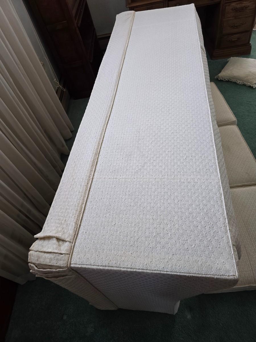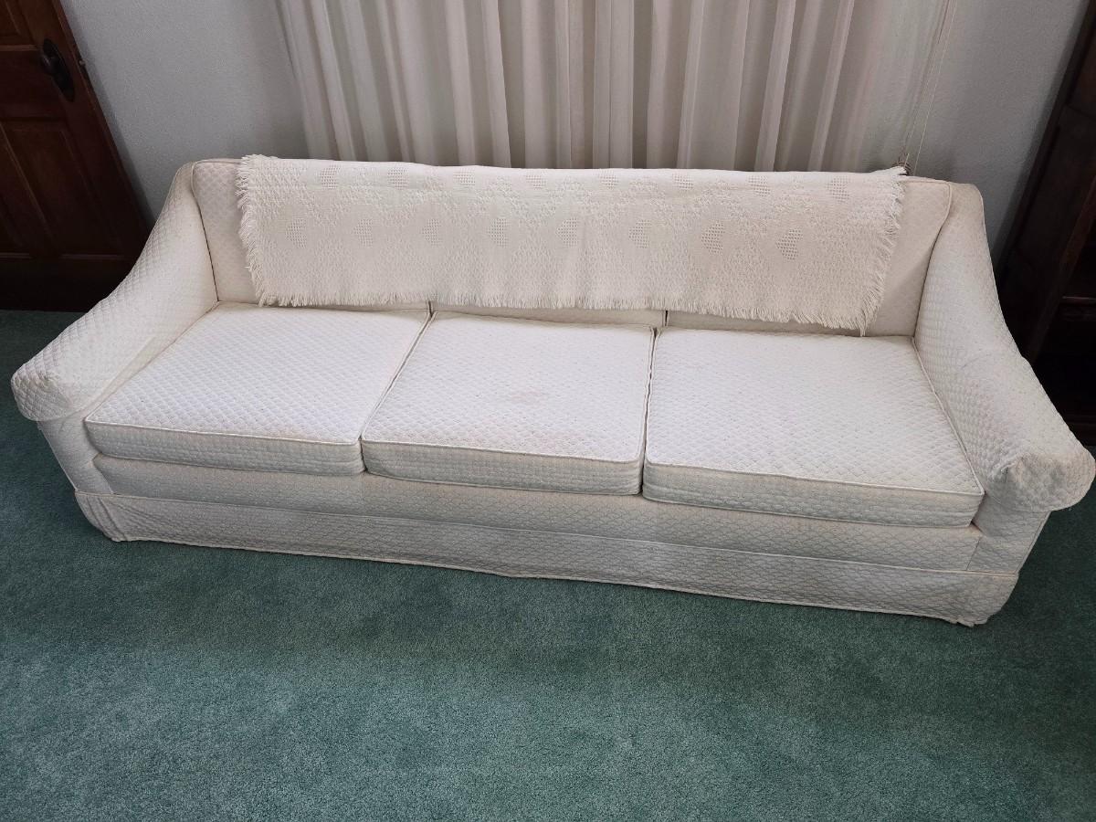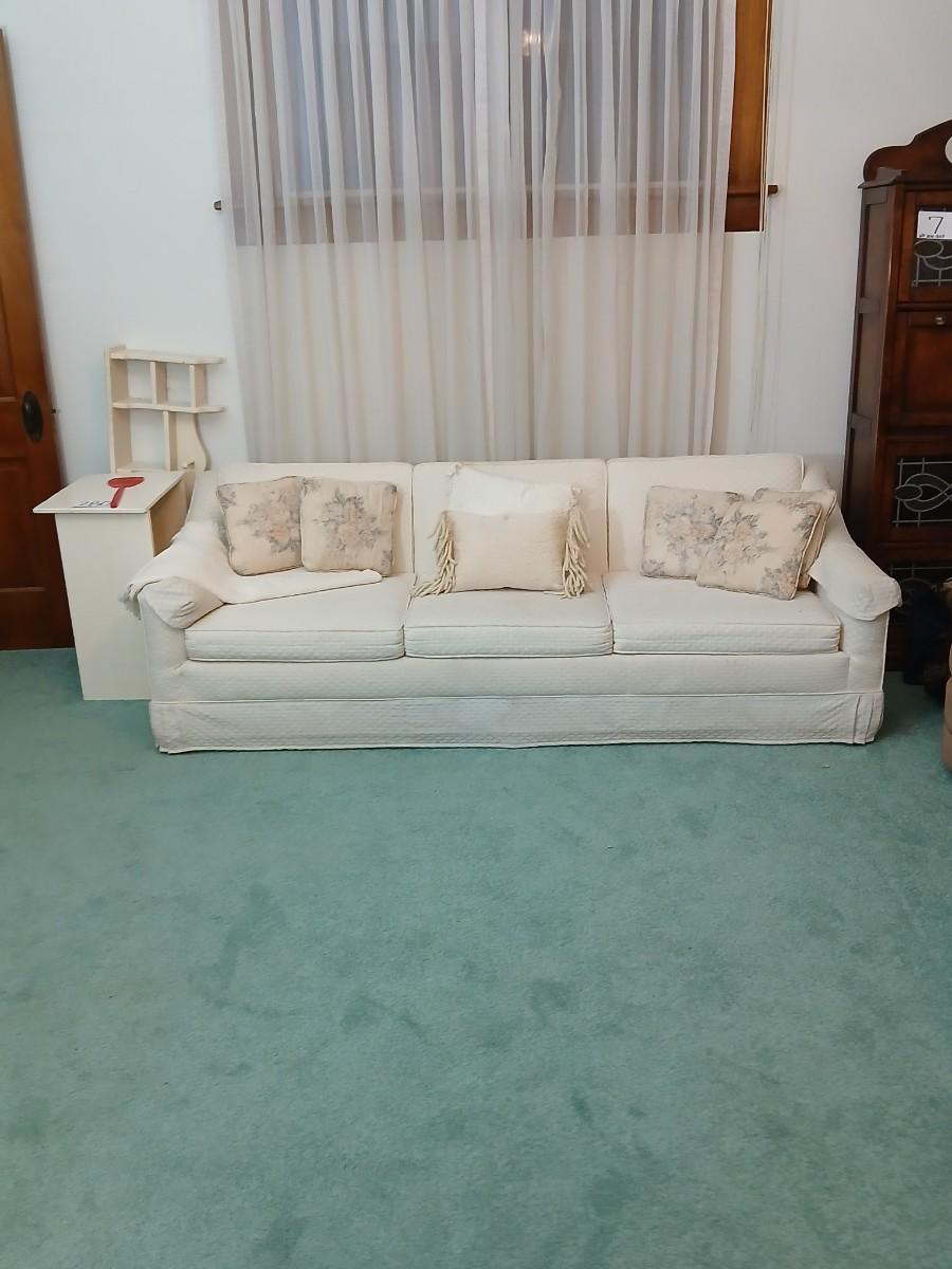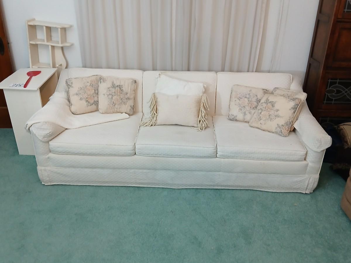 Needs a light cleaning, but in excellent condition otherwise. Approx. 26" back 15" seat x 82" x 36" comes with throw pillows and a throw blanket