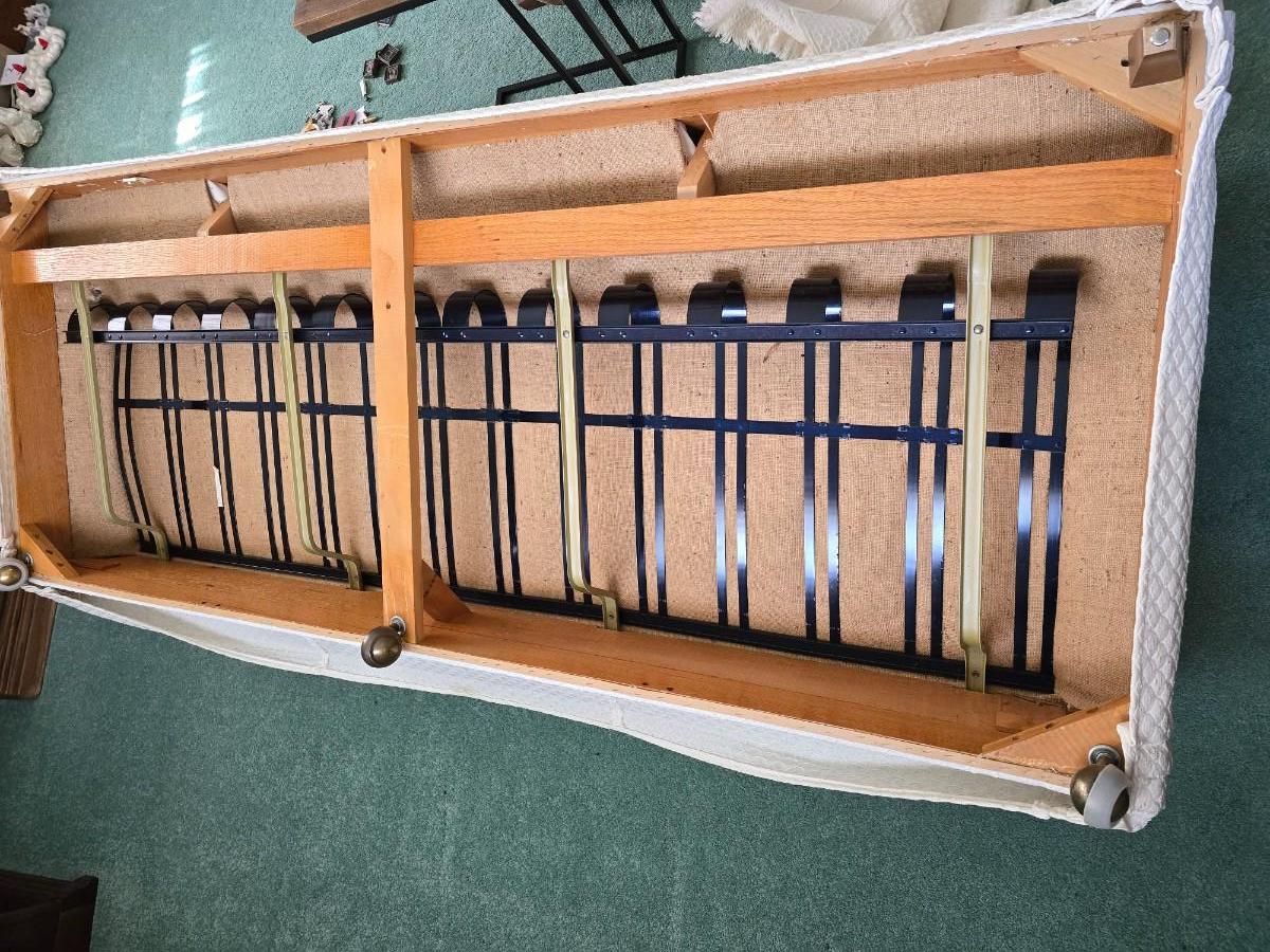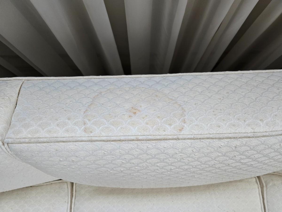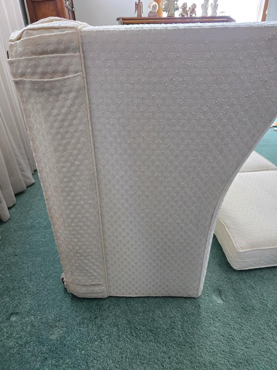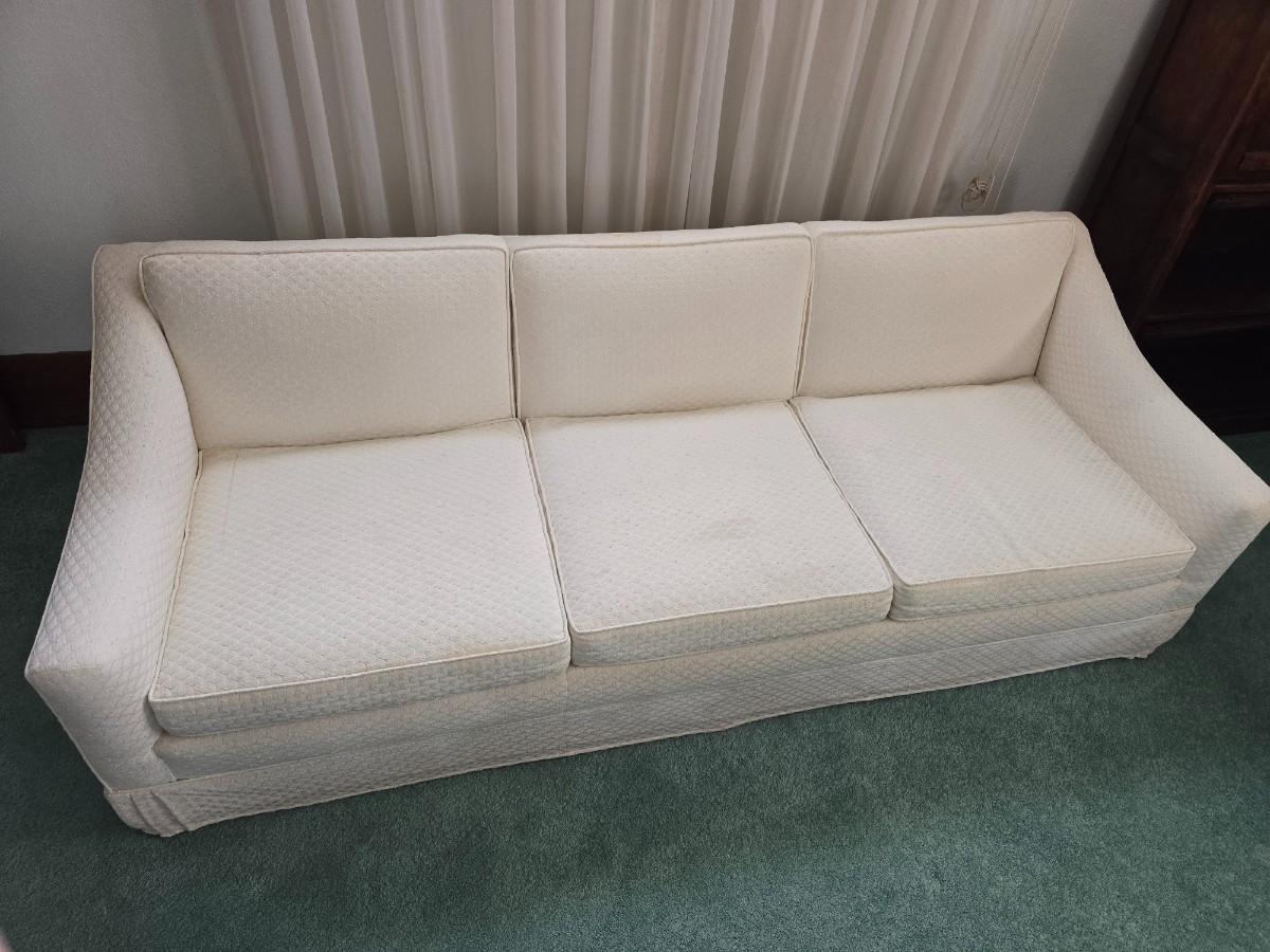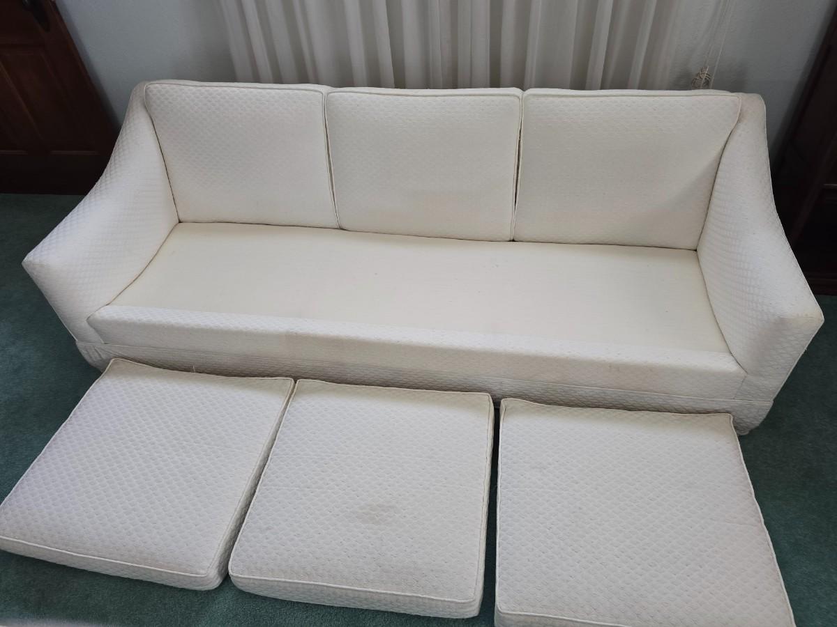 Needs a light cleaning, but in excellent condition otherwise. Approx. 26" back 15" seat x 82" x 36" comes with throw pillows and a throw blanket