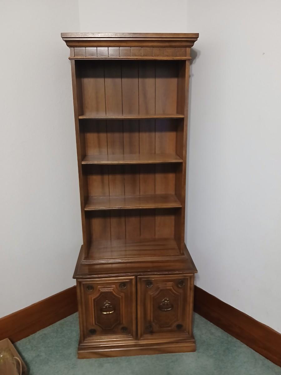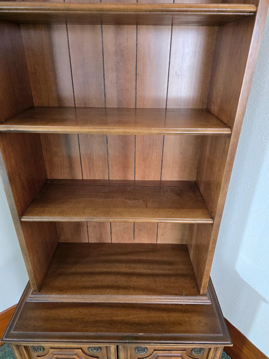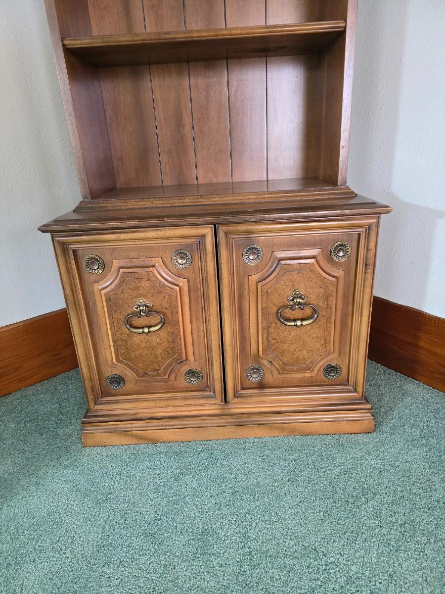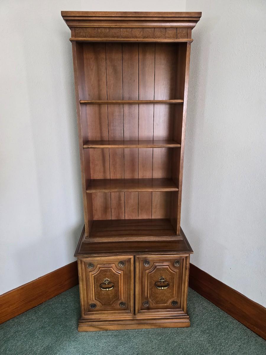 Vintage Chinoiserie library bookcase cabinet with upper shelves and a lower cabinet.
